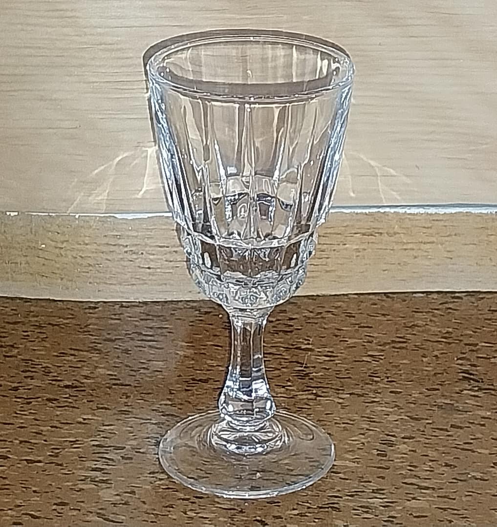 Dit zijn likeurglazen of sherryglazen uit de Chateaudun collectie, geproduceerd door Cristal d’Arques – Durand. Het glaswerk is gemaakt van loodkristal en heeft een kenmerkend geslepen patroon met verticale en horizontale facetten op de kelk.