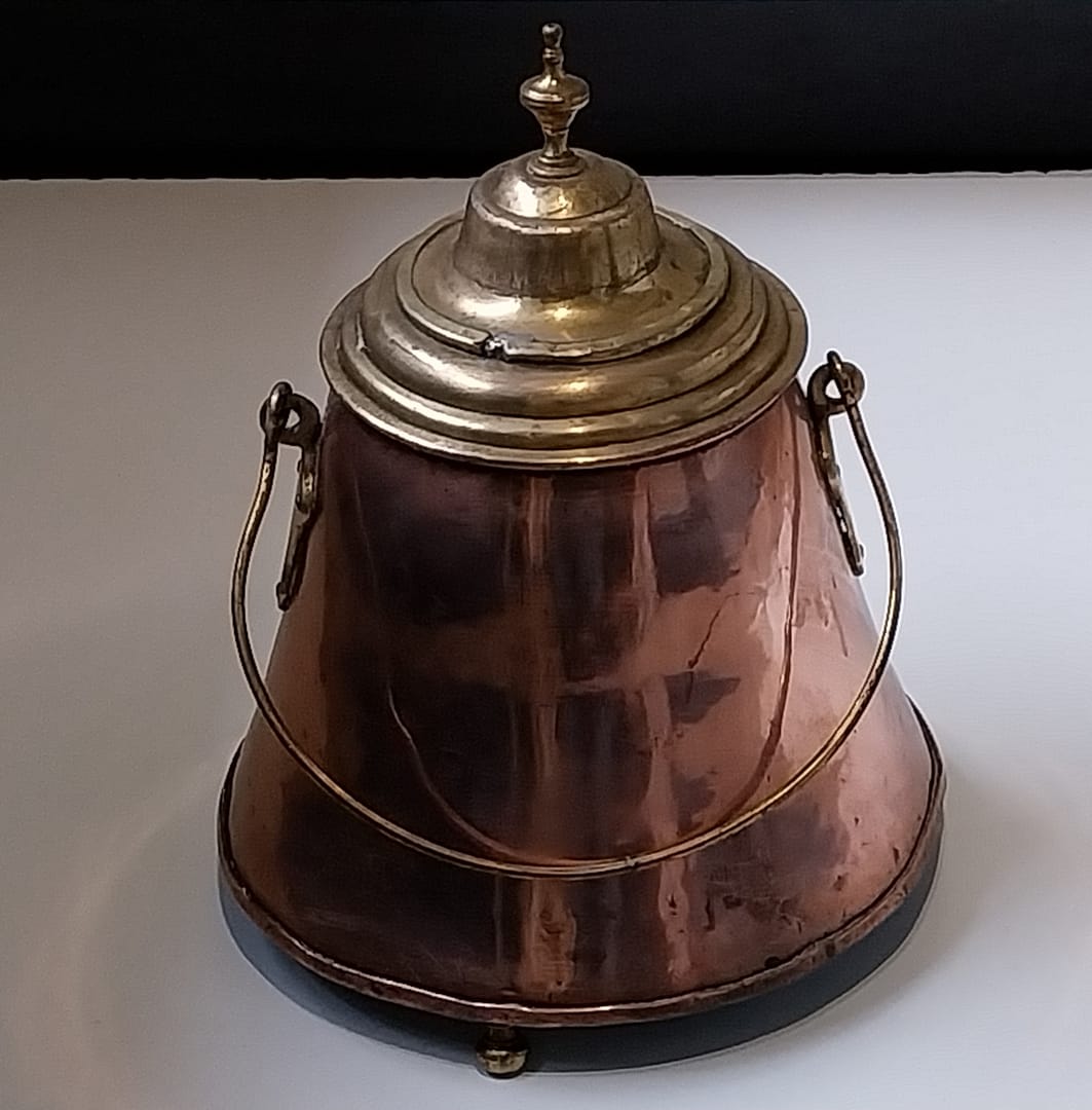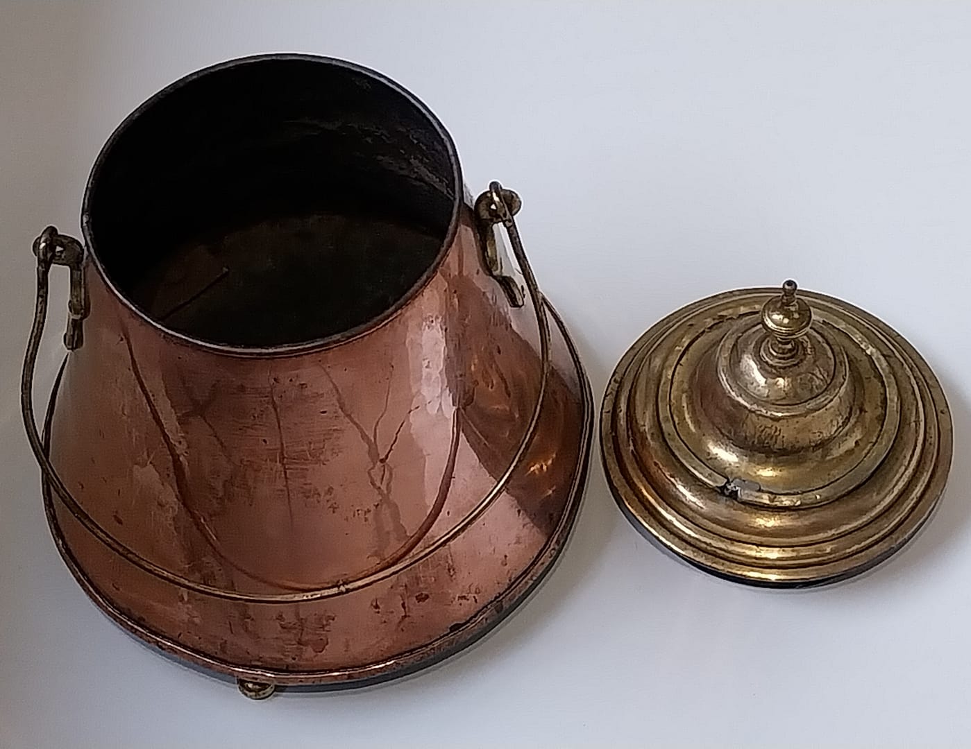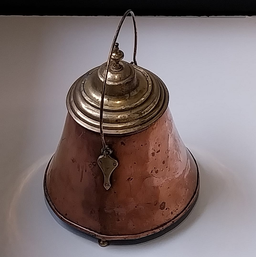 - Een roodkoperen en messing doofpot van rokvormig model, staat op 3 messingpootjes, messing handvat en deksel. Deze dateert uit eind 19e eeuw.