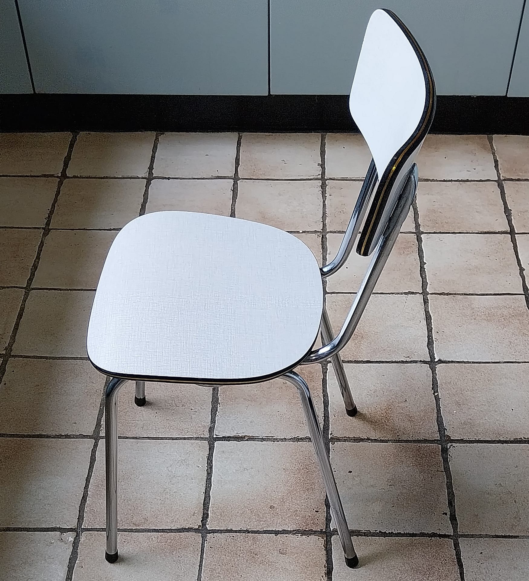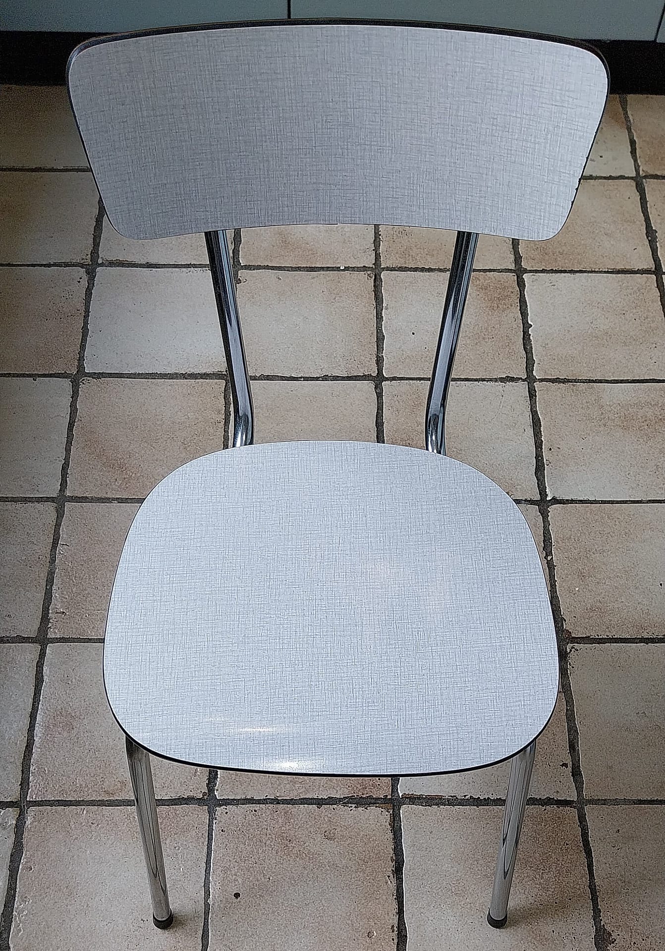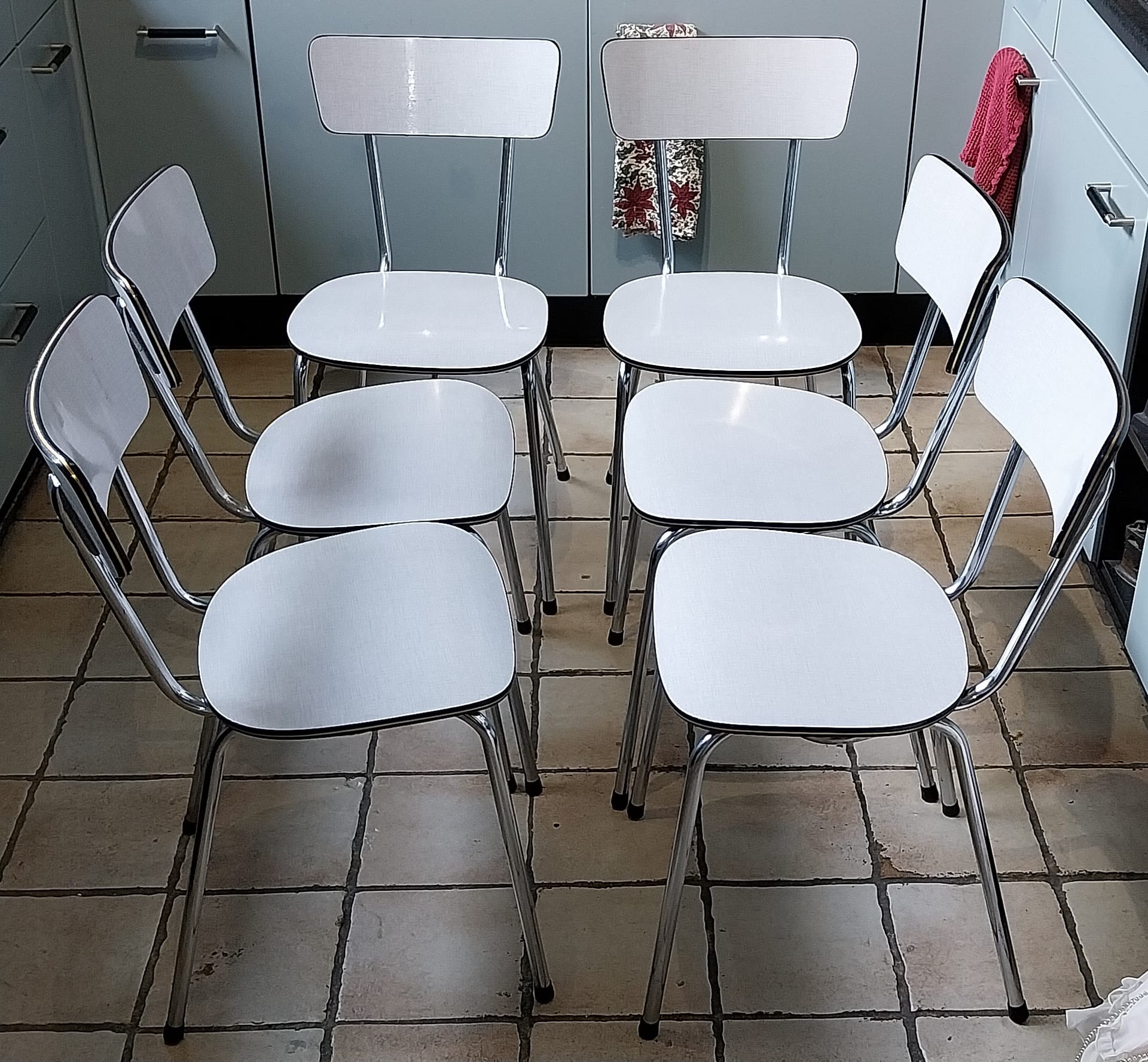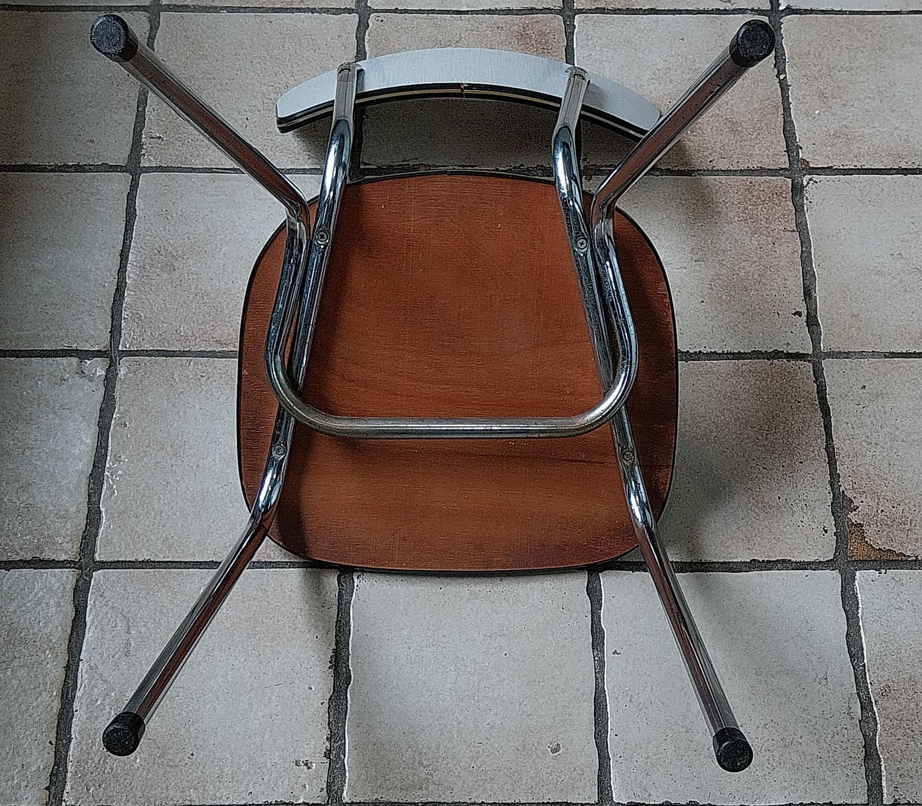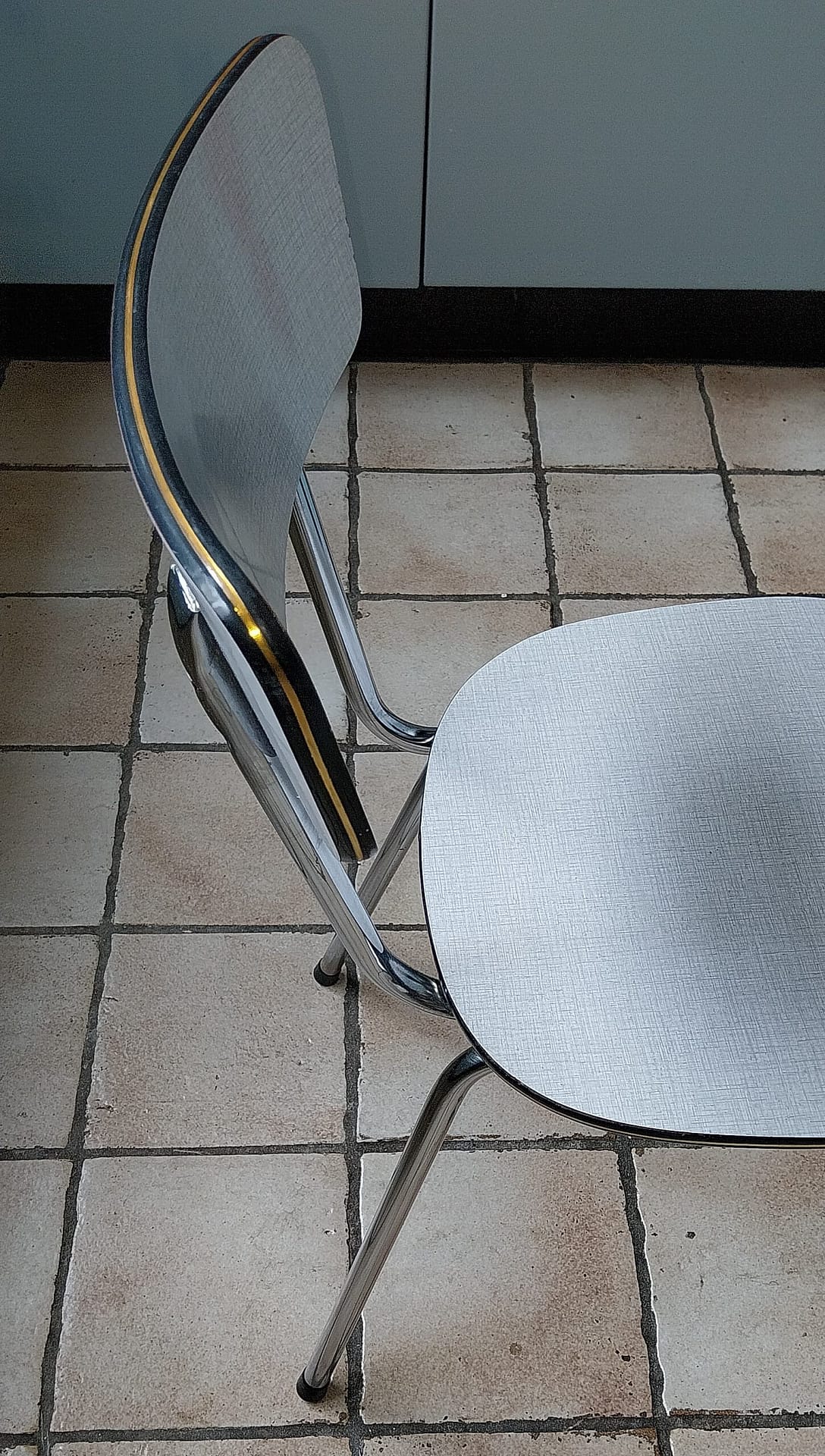 - De stoelen zijn lichtgrijs van kleur met verchroomd buizen frame en rondom zitting en rugleuning een zwarte bies met een goudkleurige strip in het midden van de bies. Deze stoelen dateren uit de jaren ‘60.