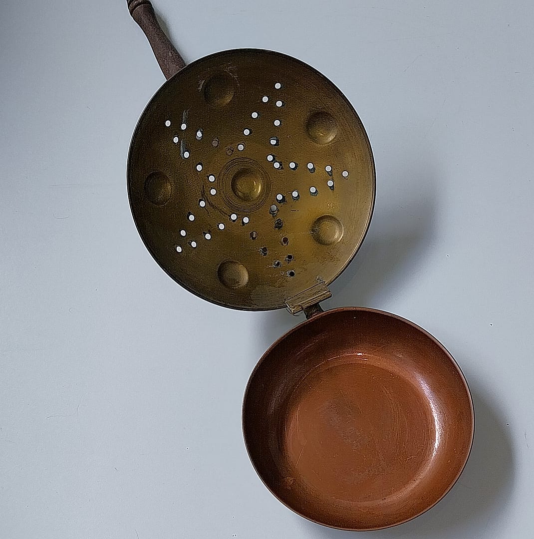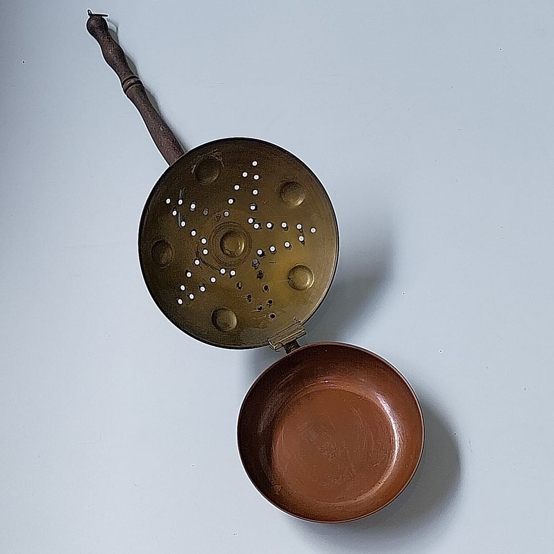 - Tijdens koude winternachten werden vroeger pannen/warmers gevuld met de hete kolen en sintels van het vuur om vervolgens de pan over de lakens te wrijven om ze op te warmen. Dit mooie exemplaar is gemaakt eind de 19e eeuw.