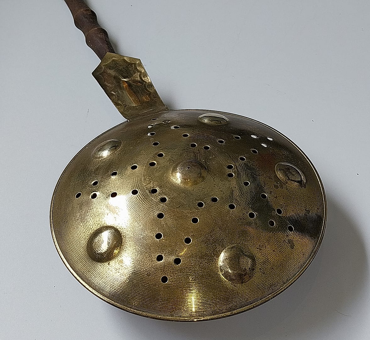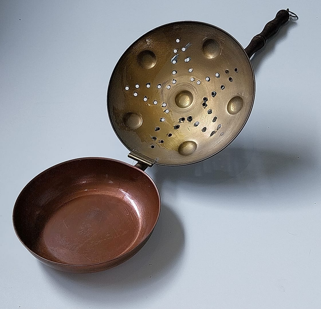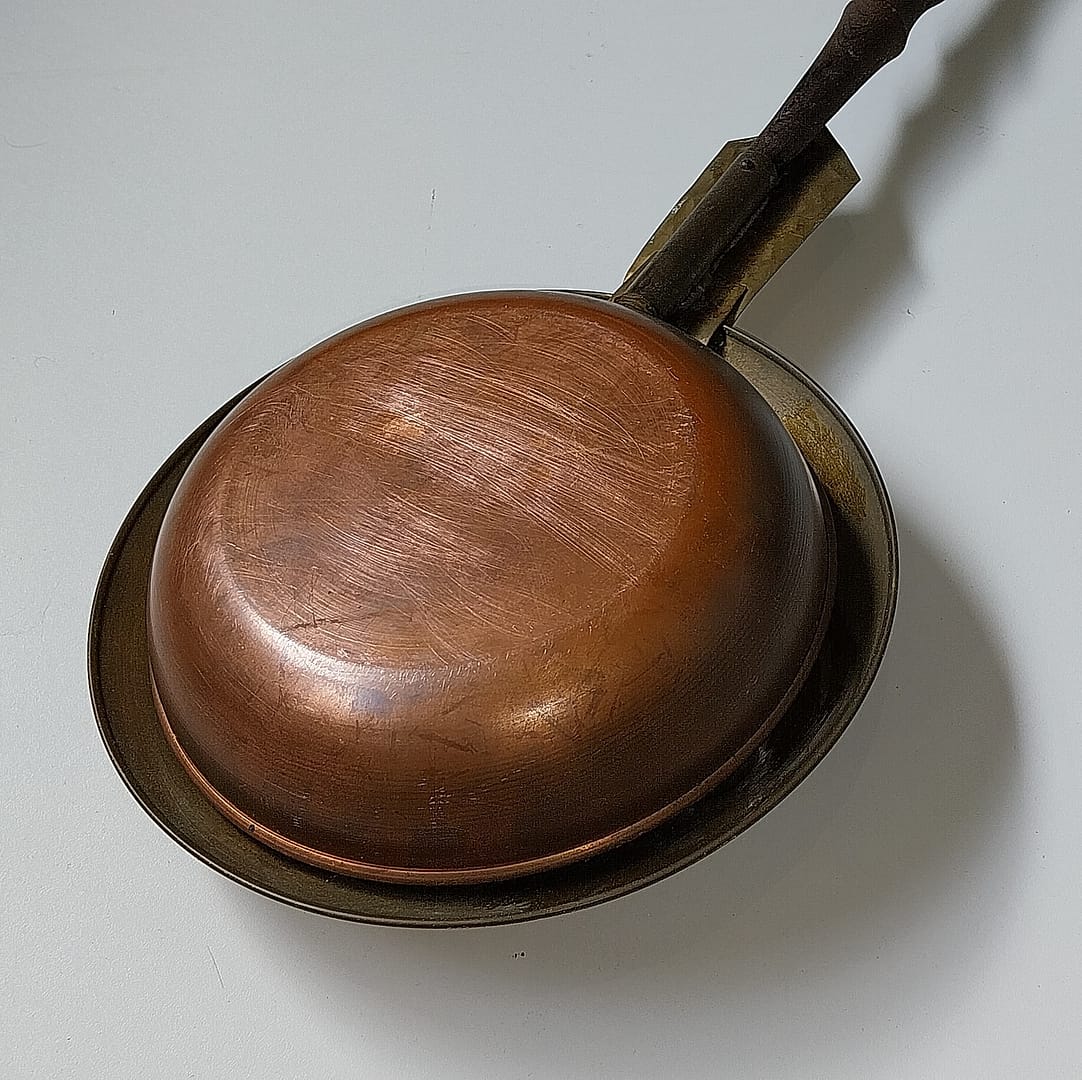 - Heeft een roodkoperen pan met een messing deksel en houten steel.