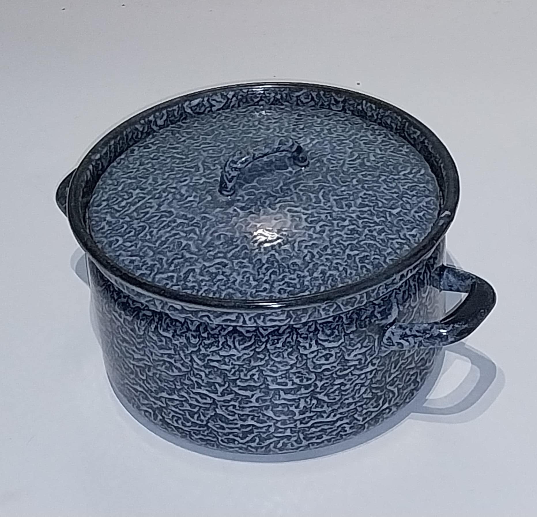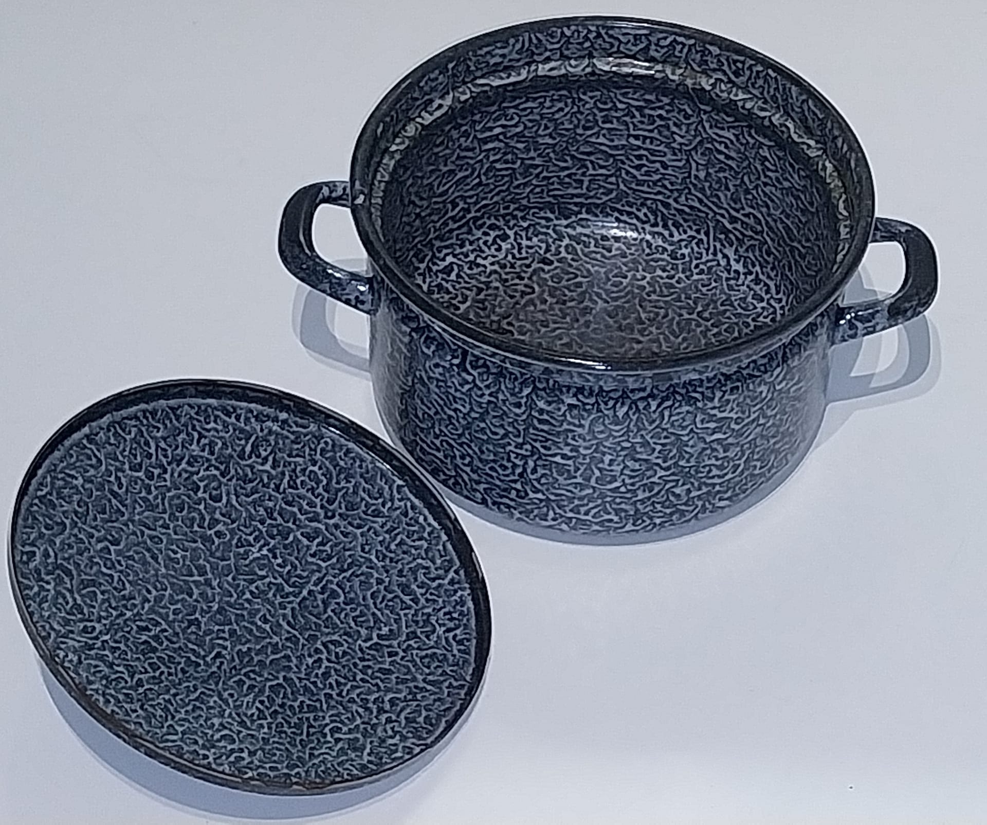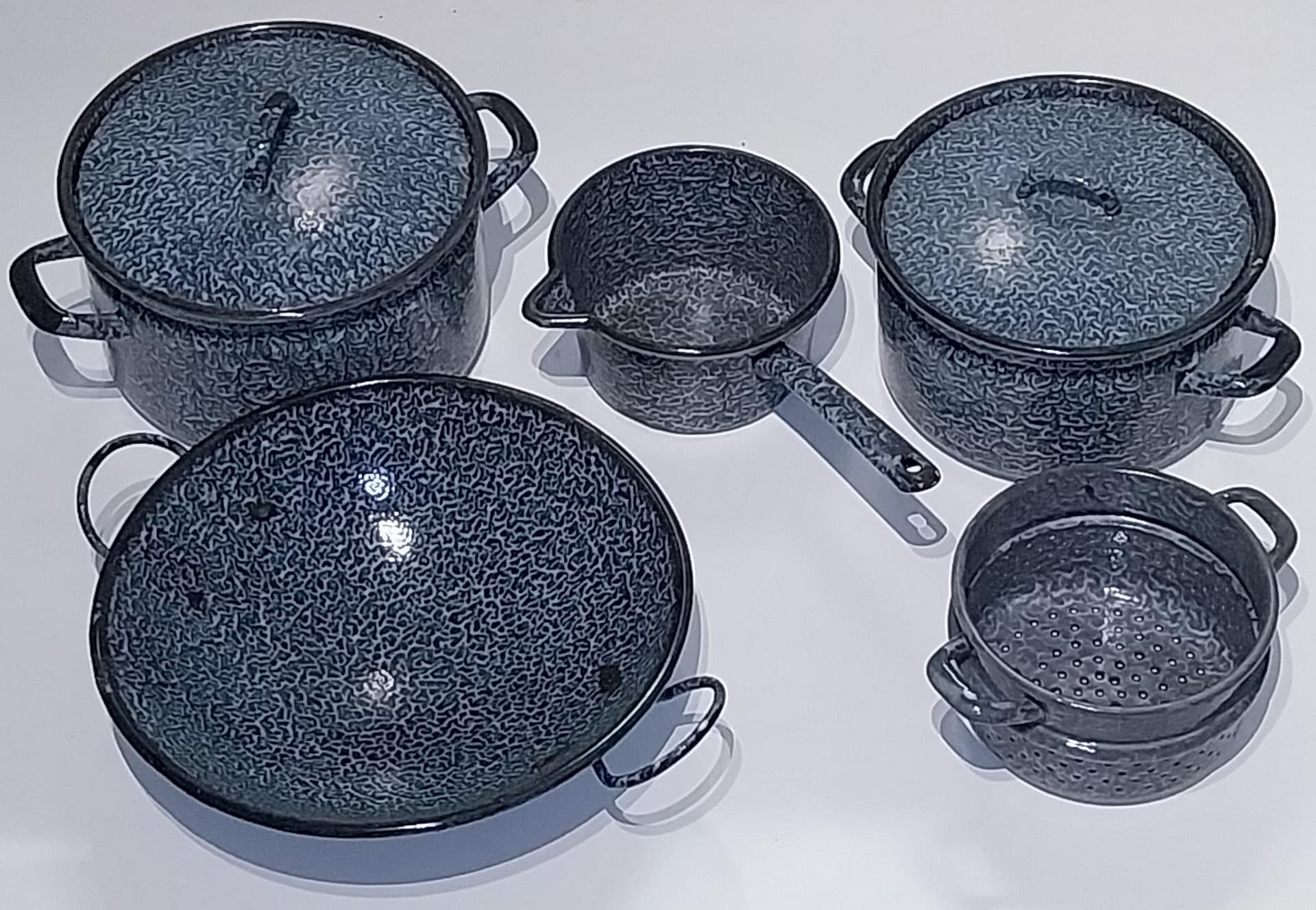 Geëmailleerde 5-delig grijsgewolkte pannenset, jaren 60