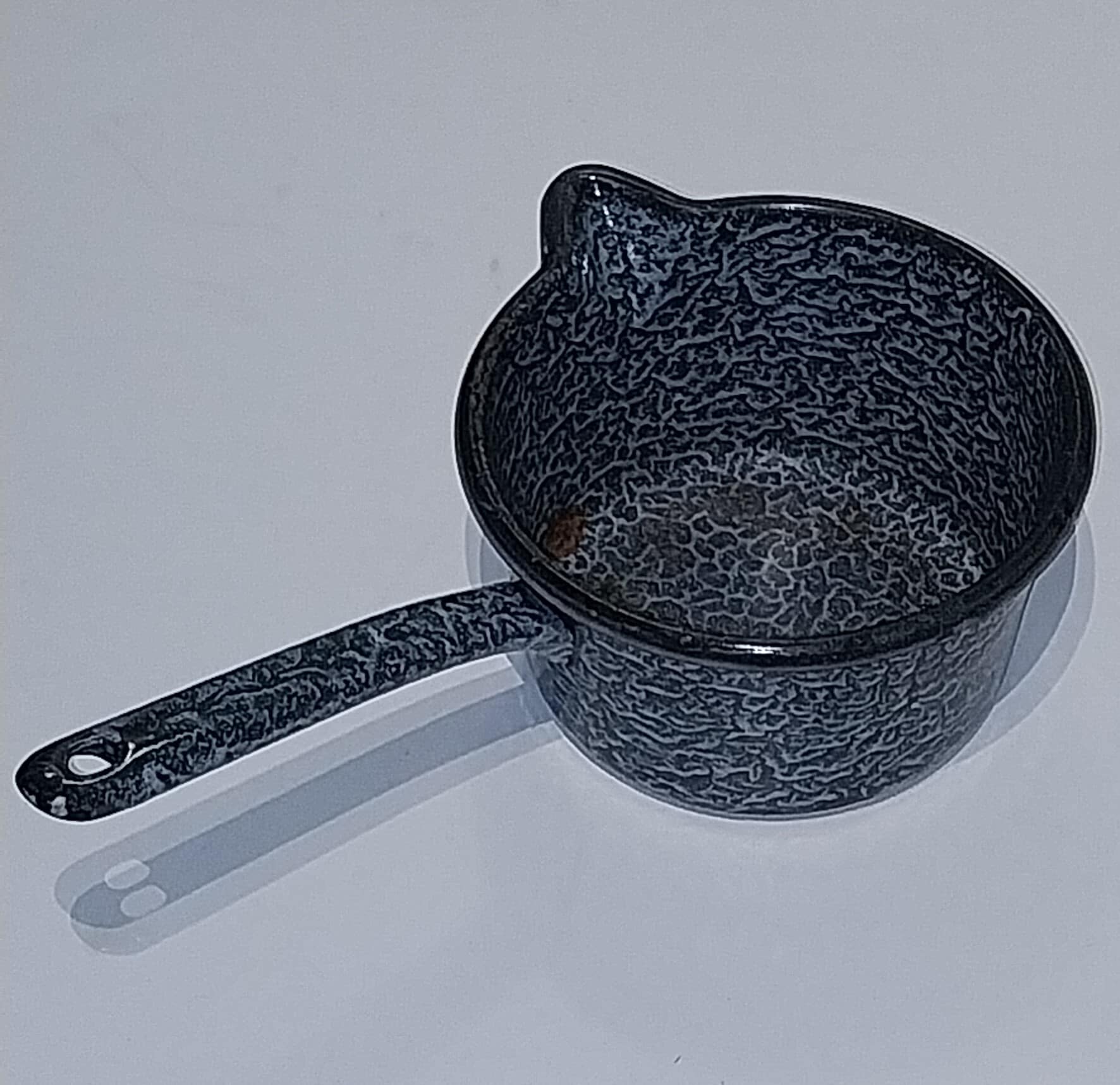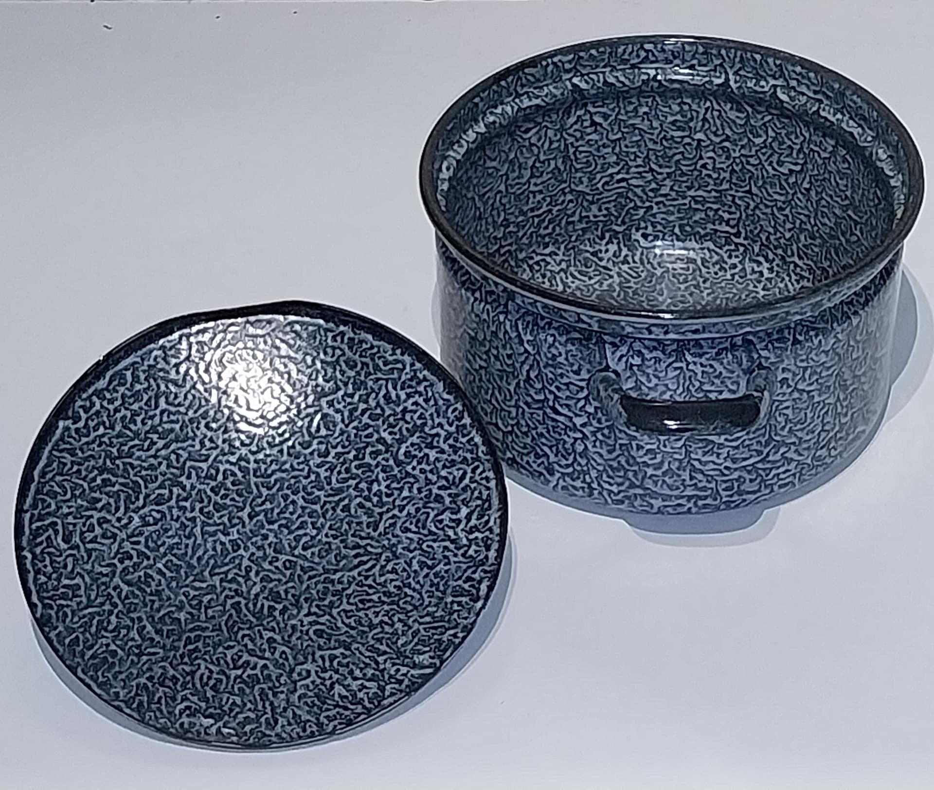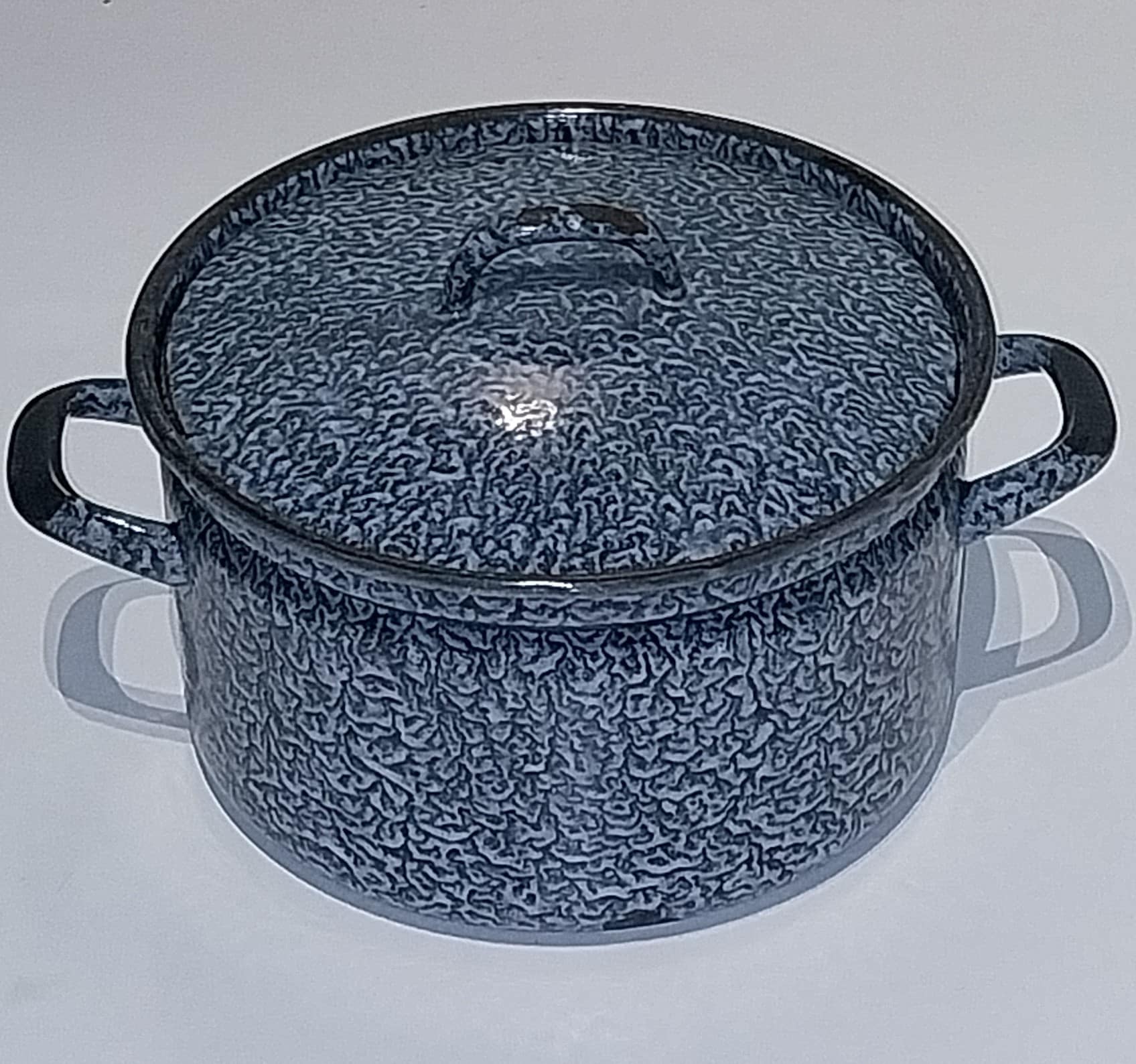 Prachtige vintage geëmailleerde grijsgewolkte pannenset om de brocante keuken net dat extra’s te geven. Deze set dateert uit de jaren ’60. Deze 5-delige set verkeert in prima staat en bestaat uit: