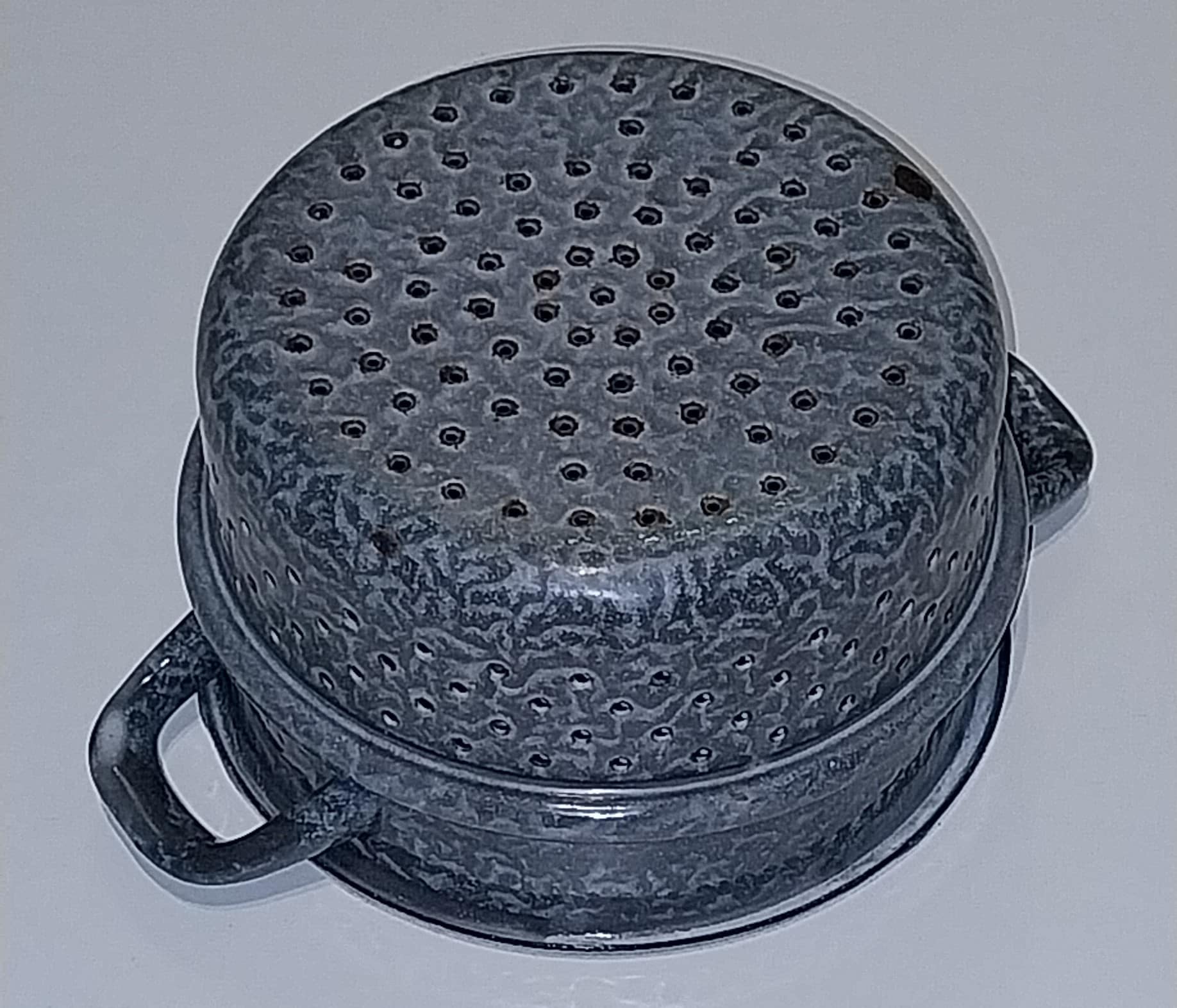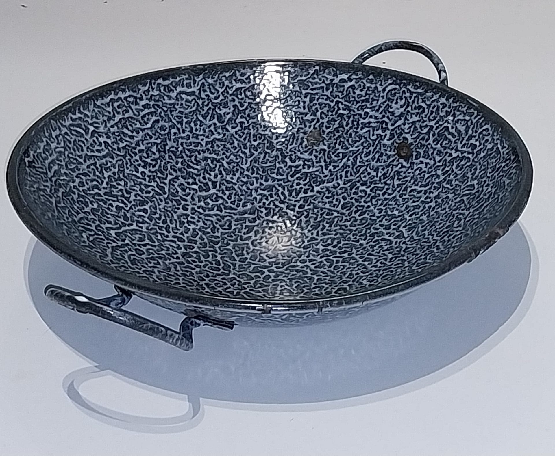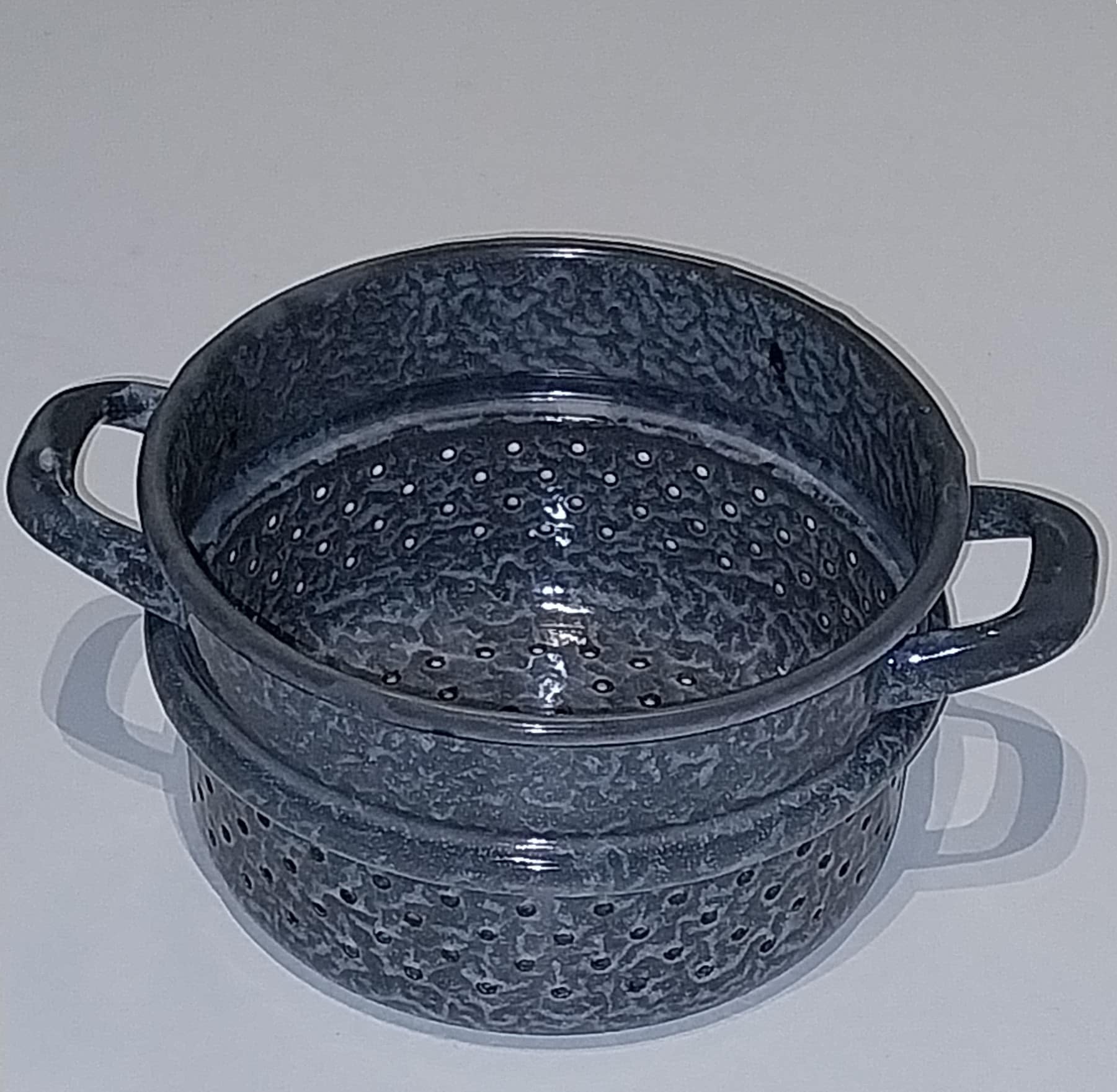 Prachtige vintage geëmailleerde grijsgewolkte pannenset om de brocante keuken net dat extra’s te geven. Deze set dateert uit de jaren ’60. Deze 5-delige set verkeert in prima staat en bestaat uit: