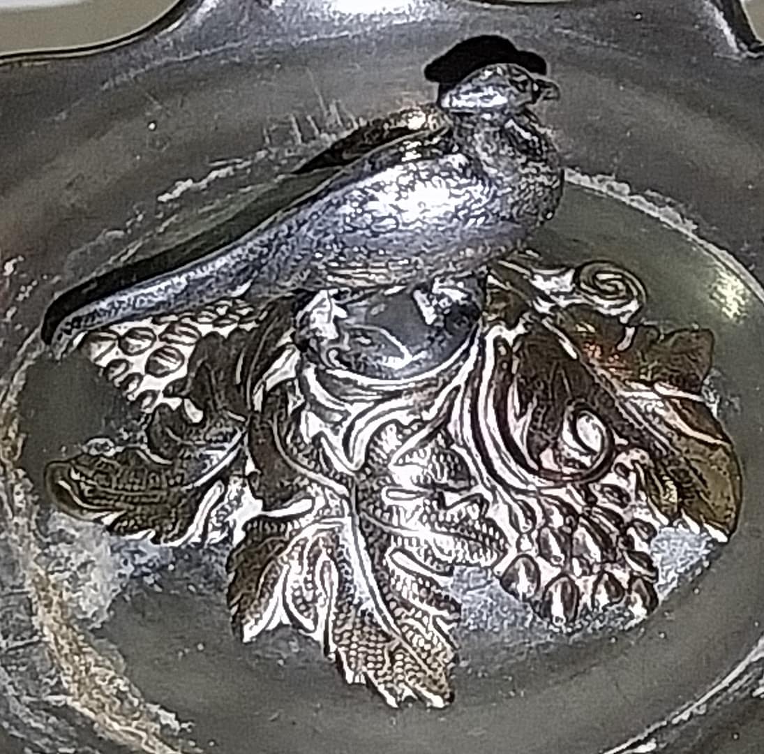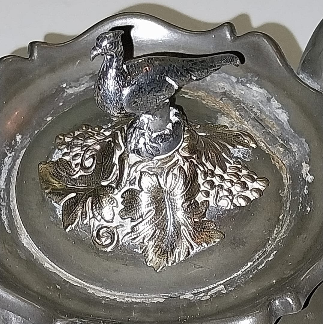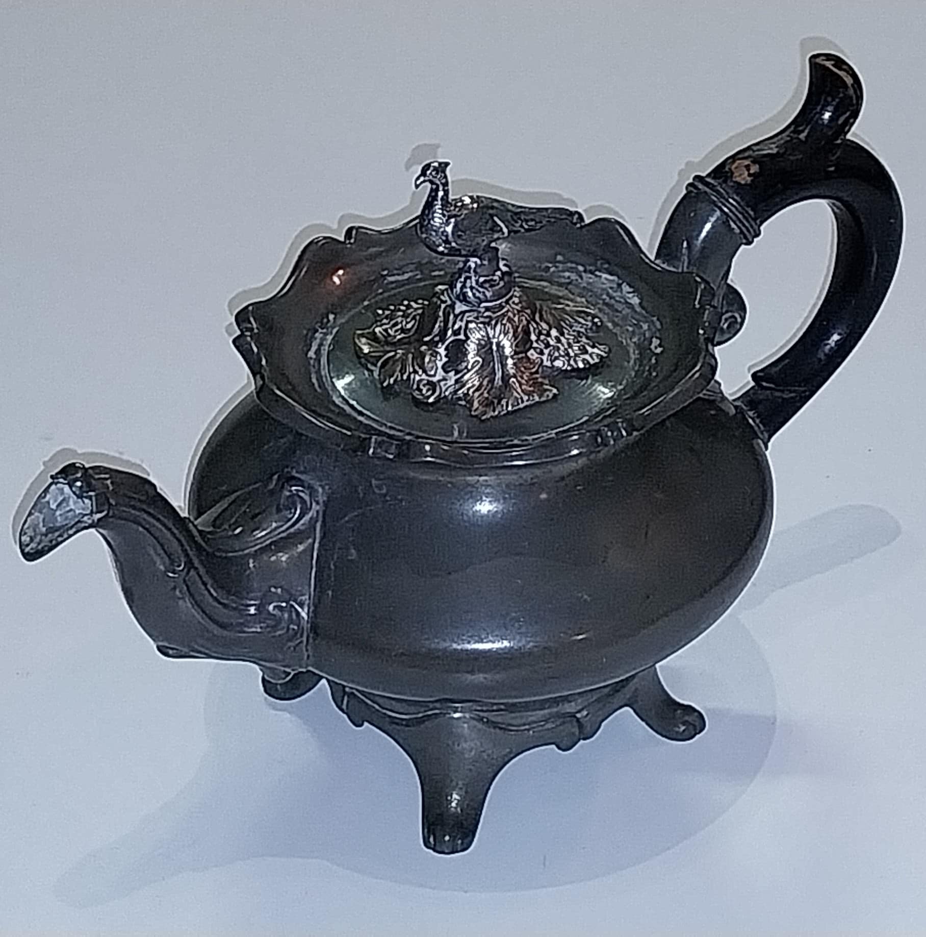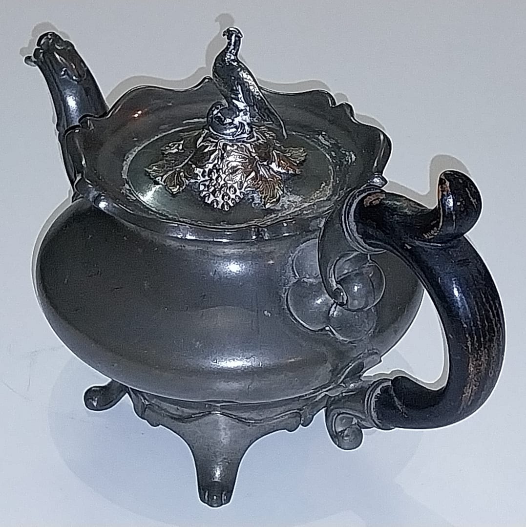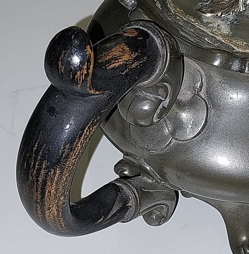 - De tinnen theepot staat op 4 pootjes, heeft een houten handvat, het dekseltje is in de vorm van een Fazant met enkele blaadjes en takjes en gemaakt van Edeltin, hedendaags wordt dit ook wel zilvertin genoemd.