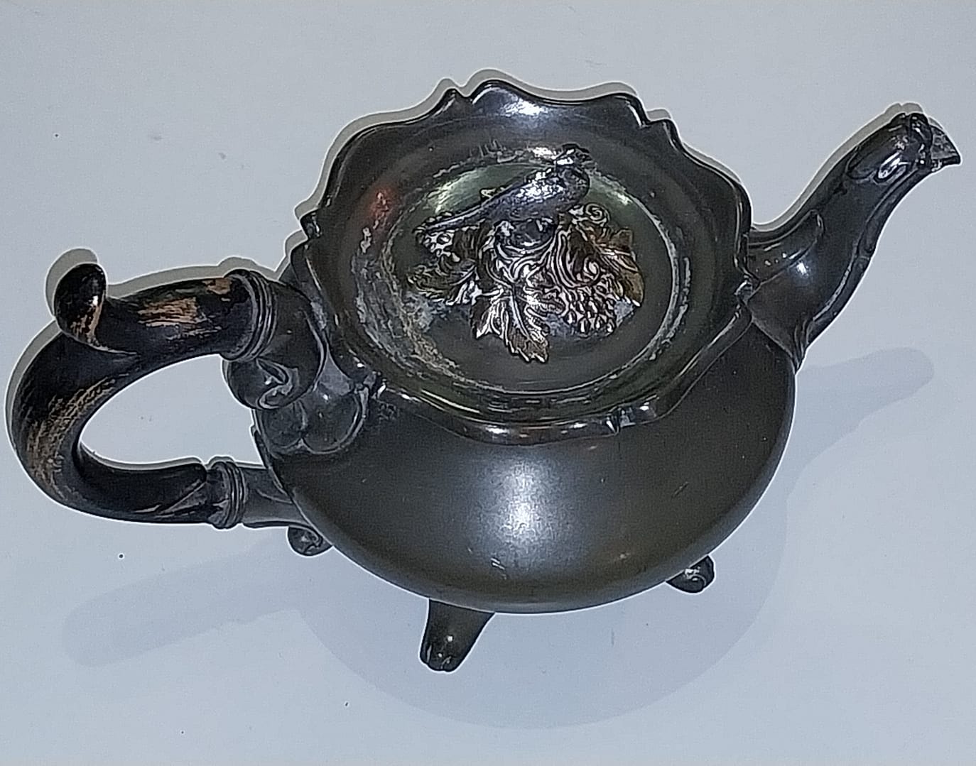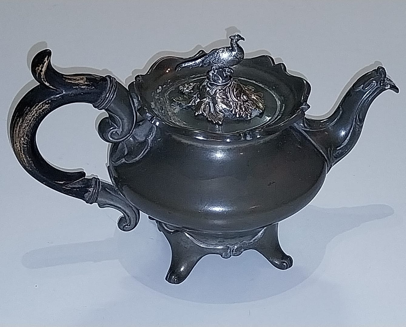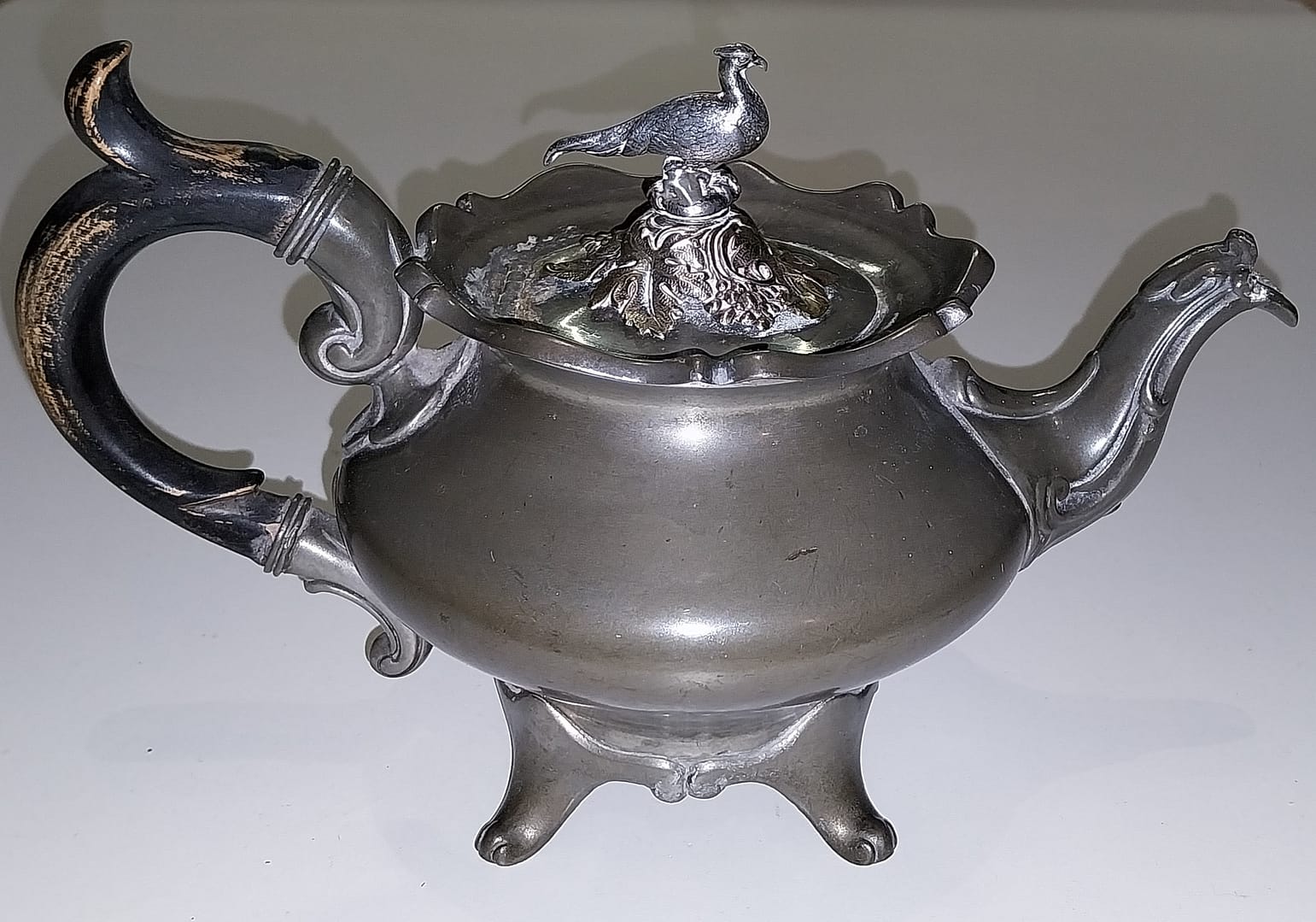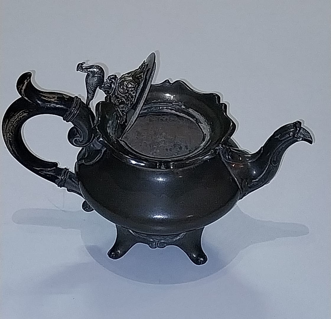 - De tinnen theepot staat op 4 pootjes, heeft een houten handvat, het dekseltje is in de vorm van een Fazant met enkele blaadjes en takjes en gemaakt van Edeltin, hedendaags wordt dit ook wel zilvertin genoemd.