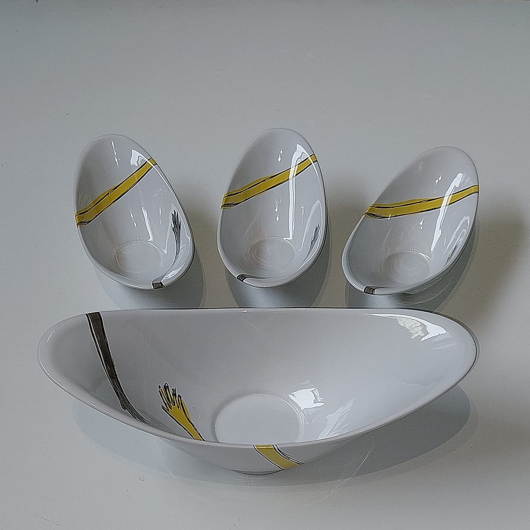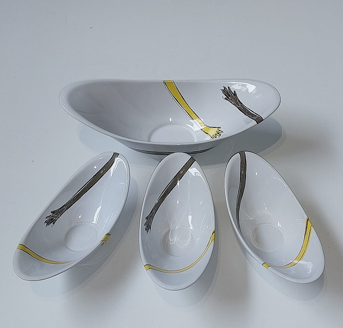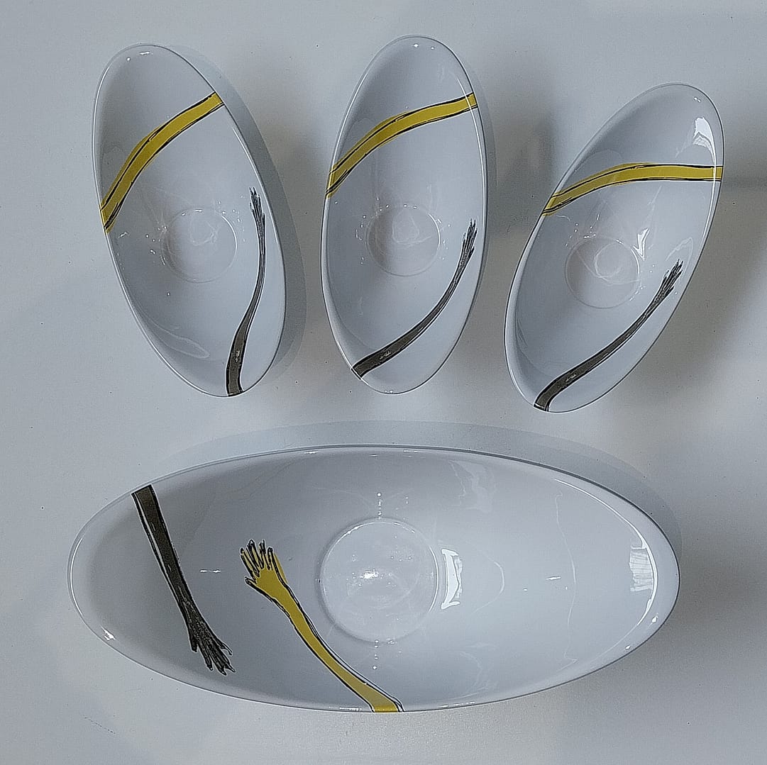 De set op de afbeelding bestaat uit één grote schaal en drie kleinere schaaltjes, gedecoreerd met een kenmerkend motief van gestileerde handen in de kleuren geel en grijs.