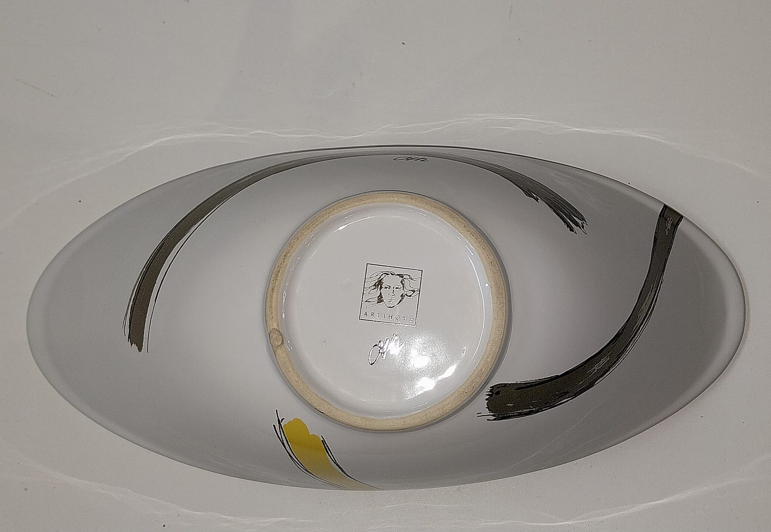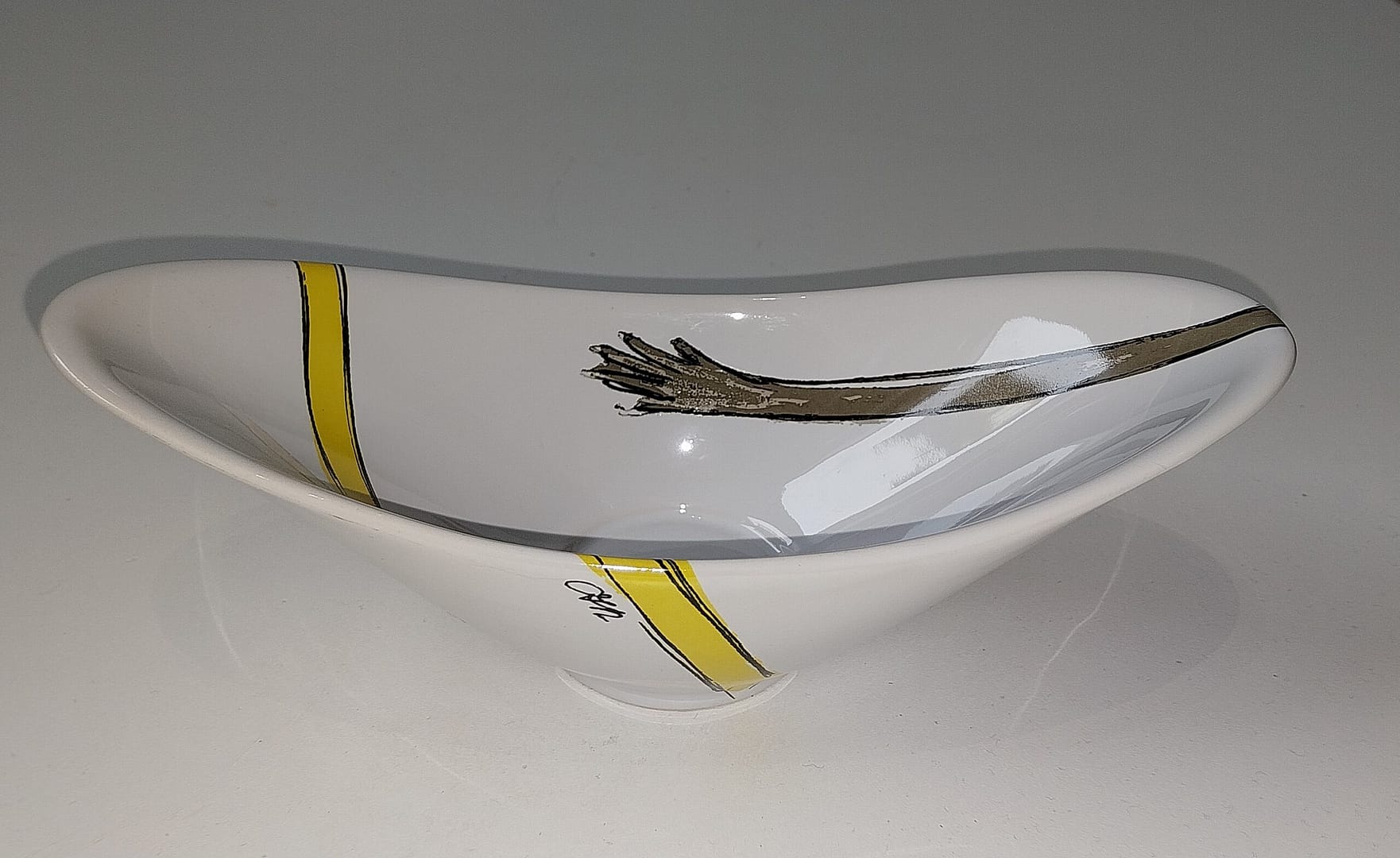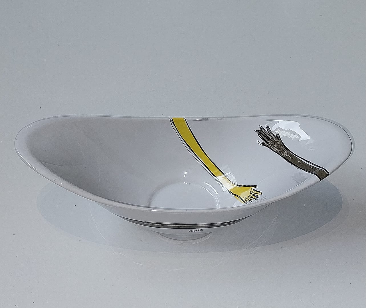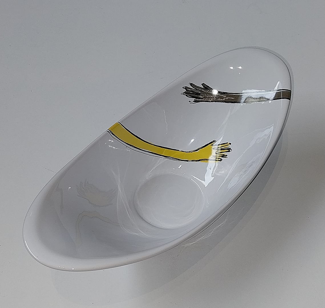 - Ontwerp: De schalen hebben een asymmetrische, boot-achtige vorm. Het decor van de reikende handen symboliseert vaak verbondenheid of samenwerking, thema’s die centraal staan in het werk van Ammerlaan.