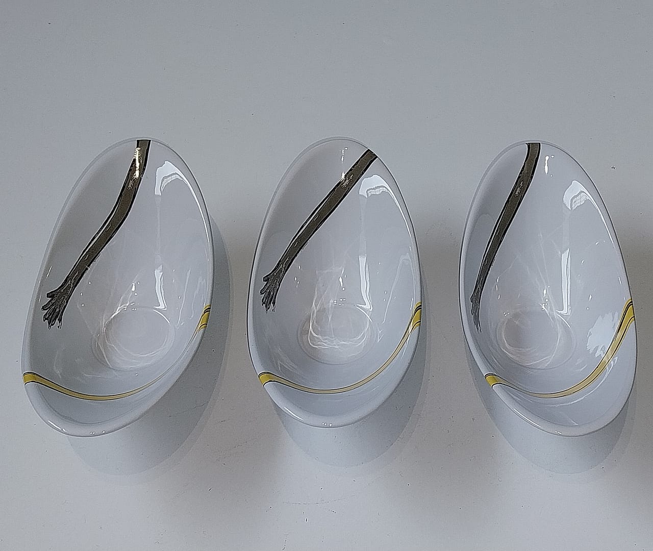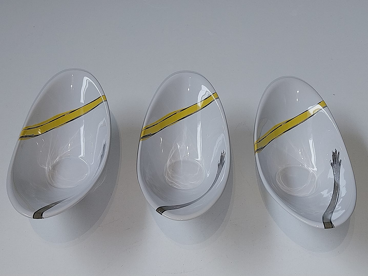 Dit zijn porseleinen schalen ontworpen door de Nederlandse kunstenares Corry Ammerlaan-van Niekerk, van het kunstcentrum Artihove.