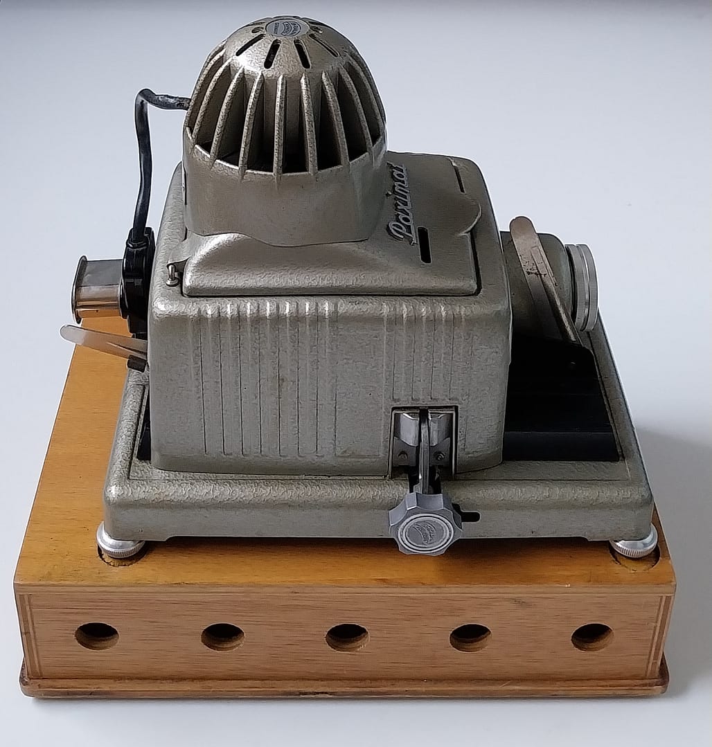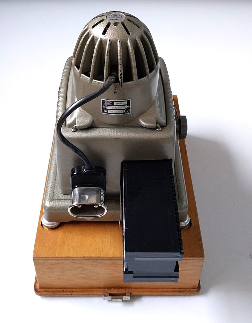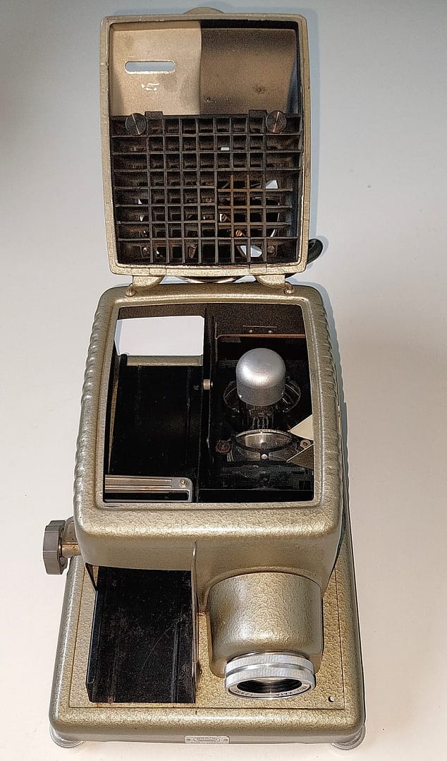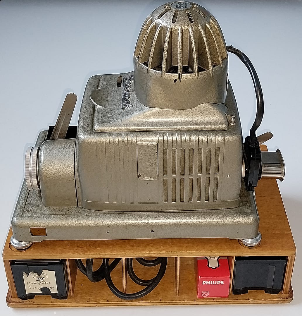 - Constructie: Het apparaat heeft een robuuste behuizing van gegoten metaal, uitgevoerd in een grijsgroene hamerslaglak. Staat op een houten voetstuk, met opbergruimte voor dia-magazijnen e.d.