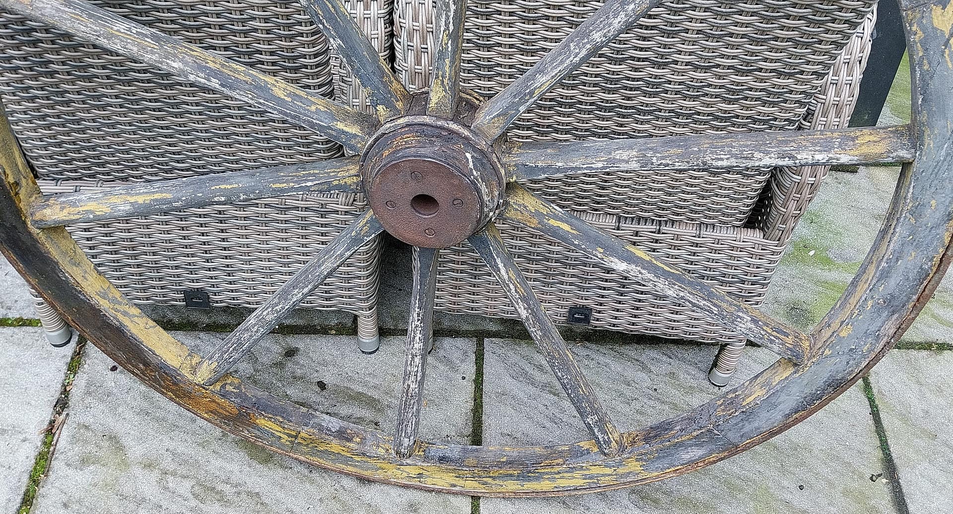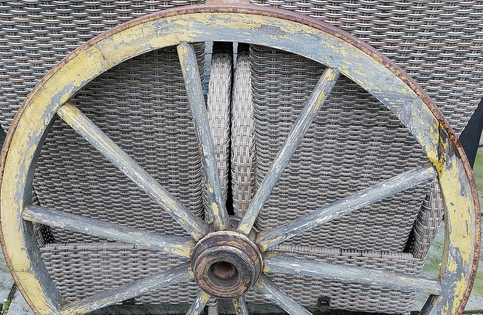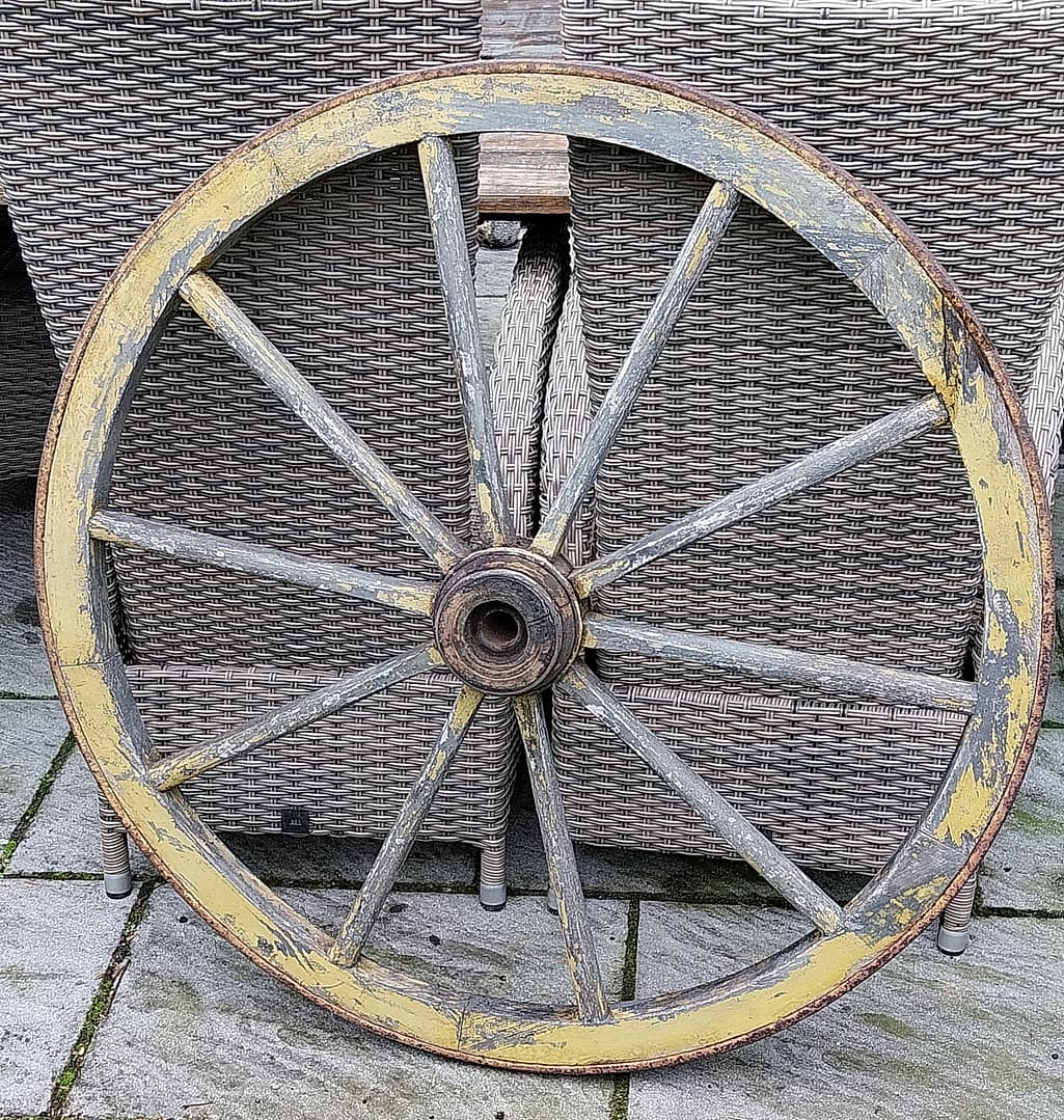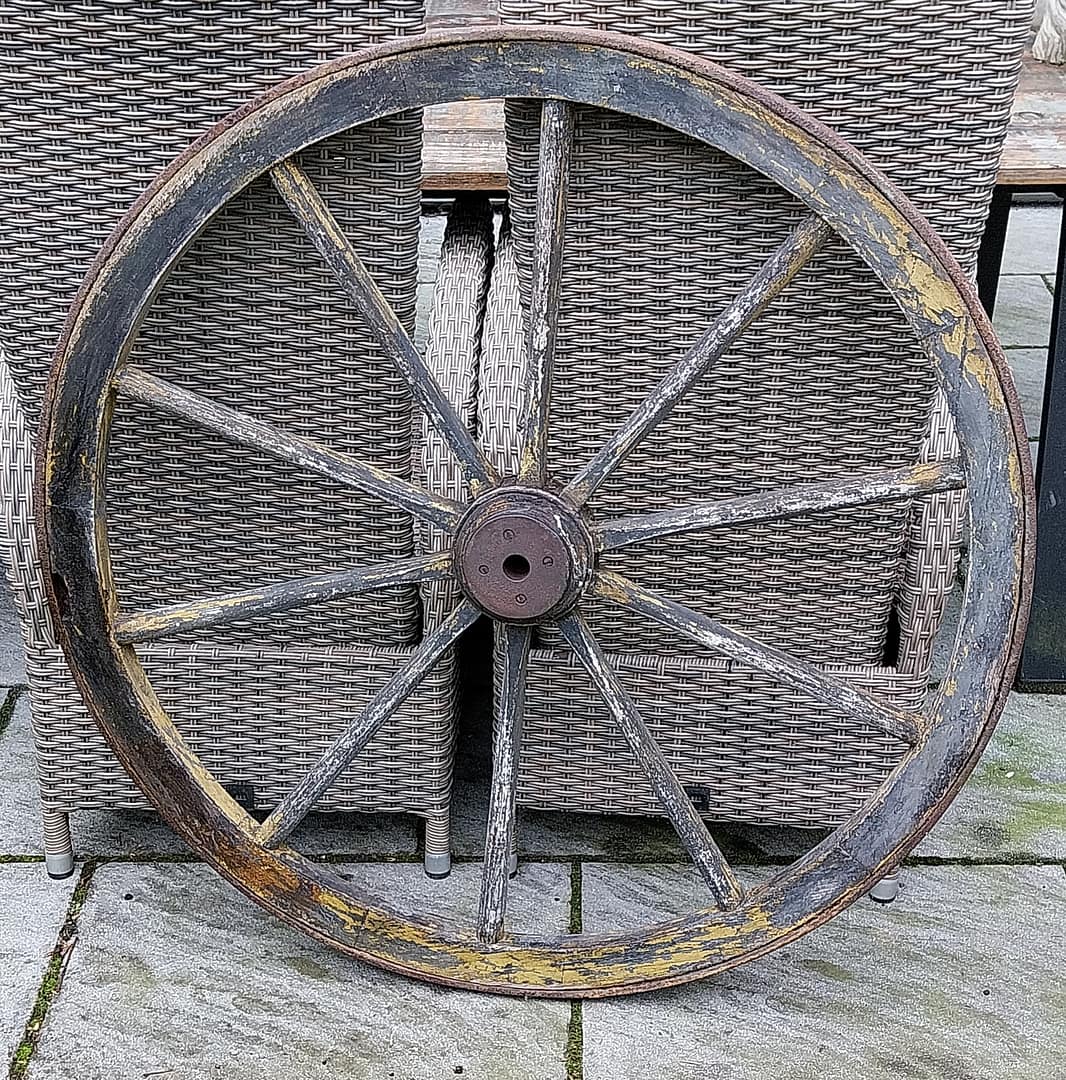 - Constructie: Het wiel is opgebouwd uit houten spaken die vanuit een centrale as (de naaf) naar een houten velg lopen.