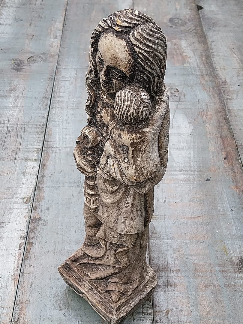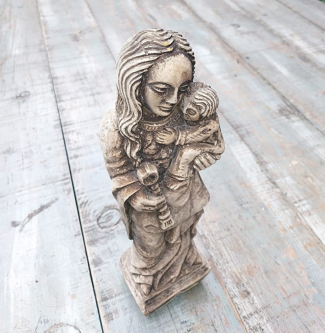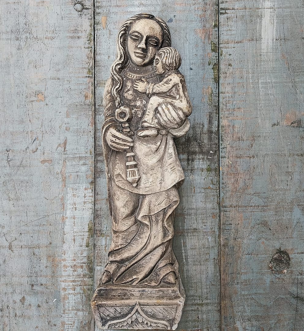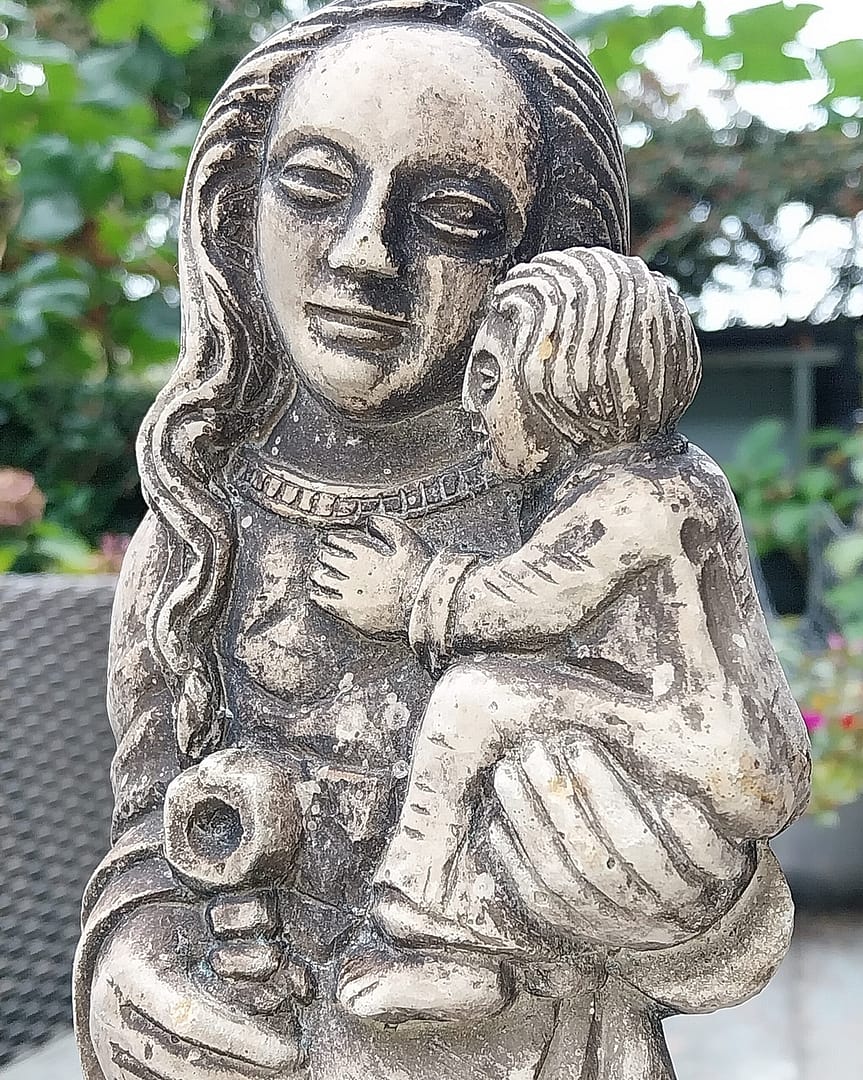 Antiek kalkstenen beeld van Maria met kindje Jezus