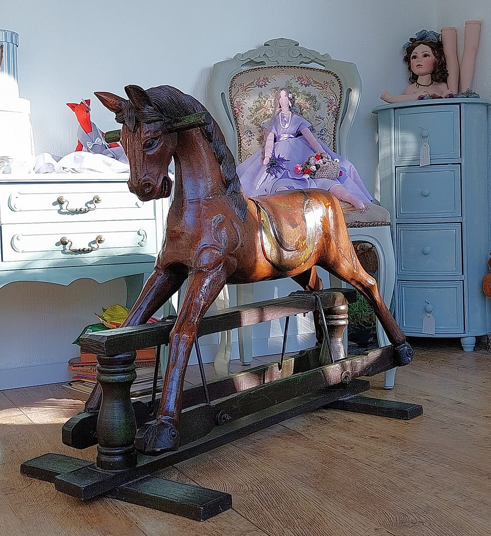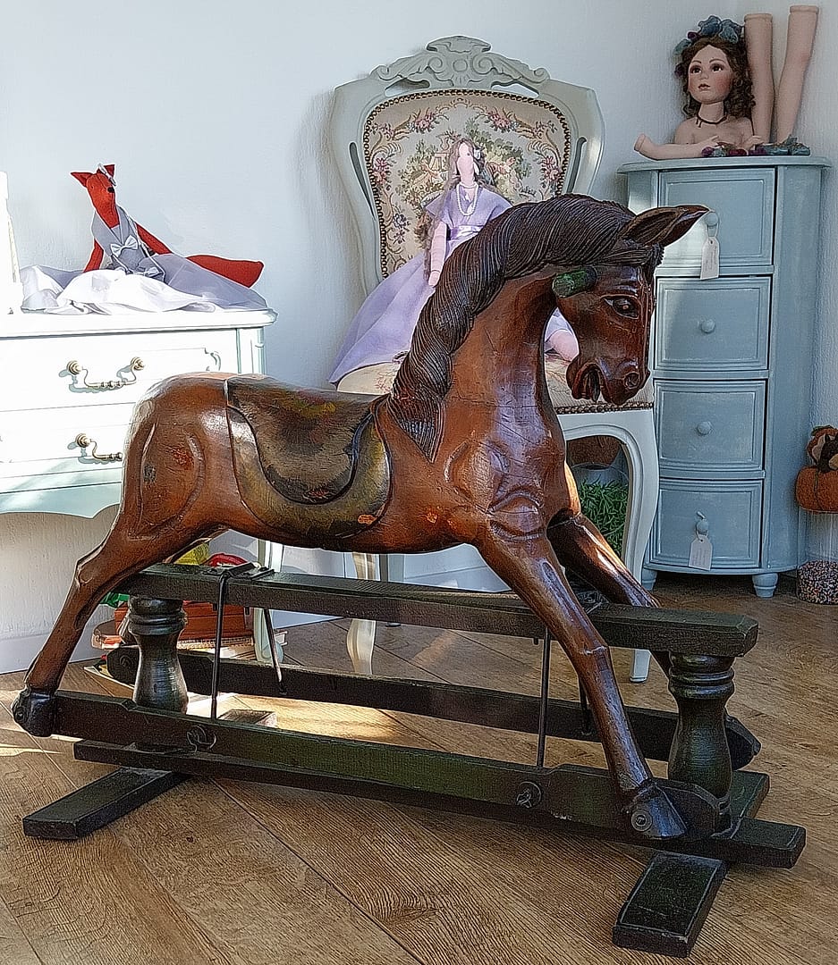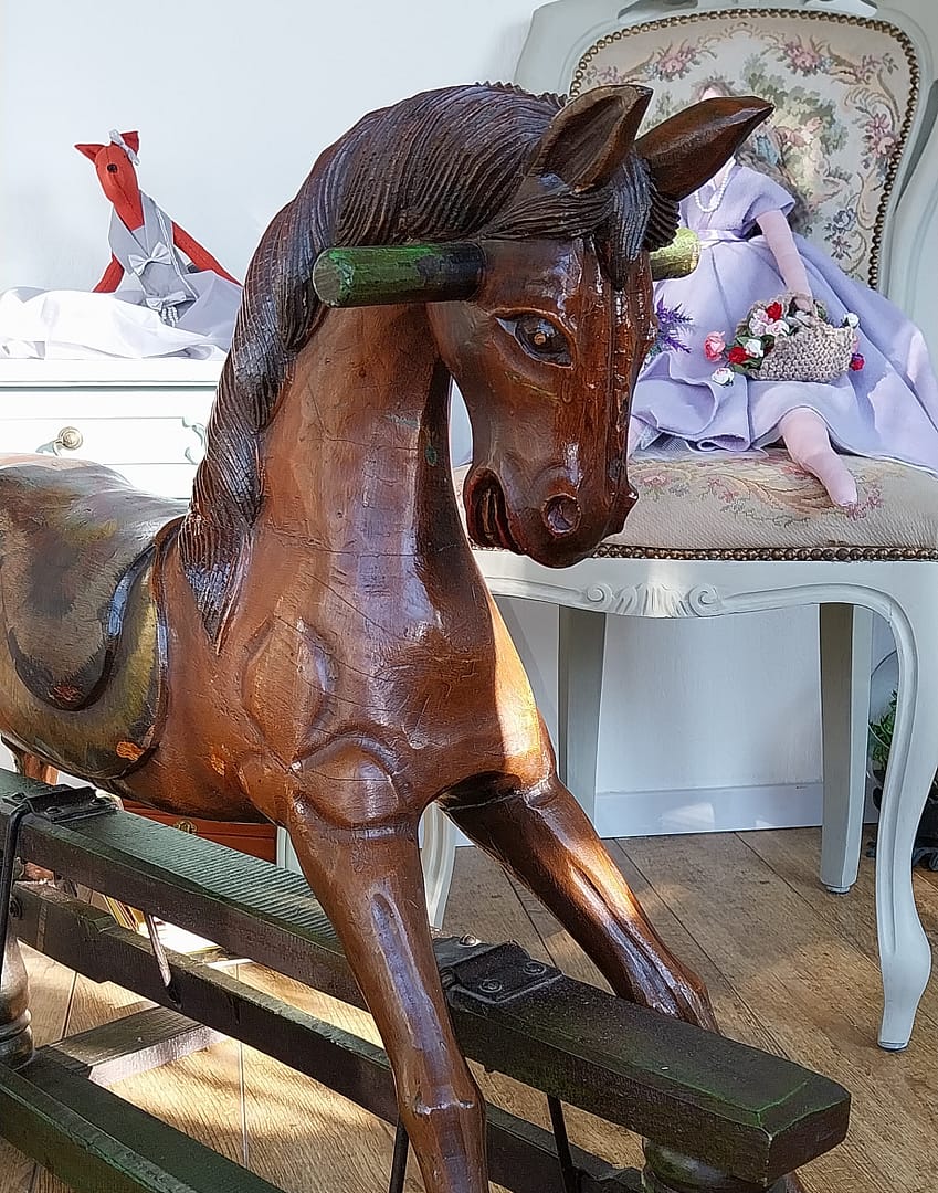 Het antieke houten hobbelpaard heeft een klassieke uitstraling en vertoont natuurlijke gebruikssporen en patina die passen bij zijn leeftijd. Deze stukken zijn vaak gewild bij verzamelaars vanwege hun vakmanschap, historische betekenis en nostalgische waarde. Handgemaakt, wat onderscheidt van moderne, machinaal vervaardigde varianten.