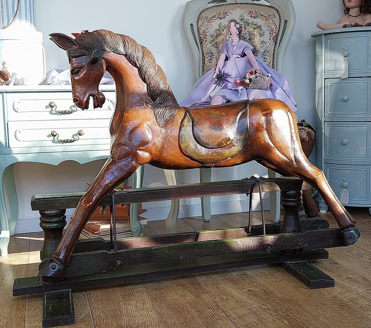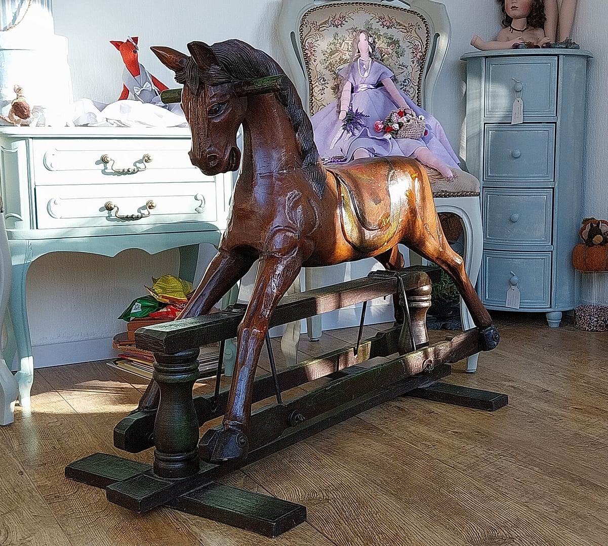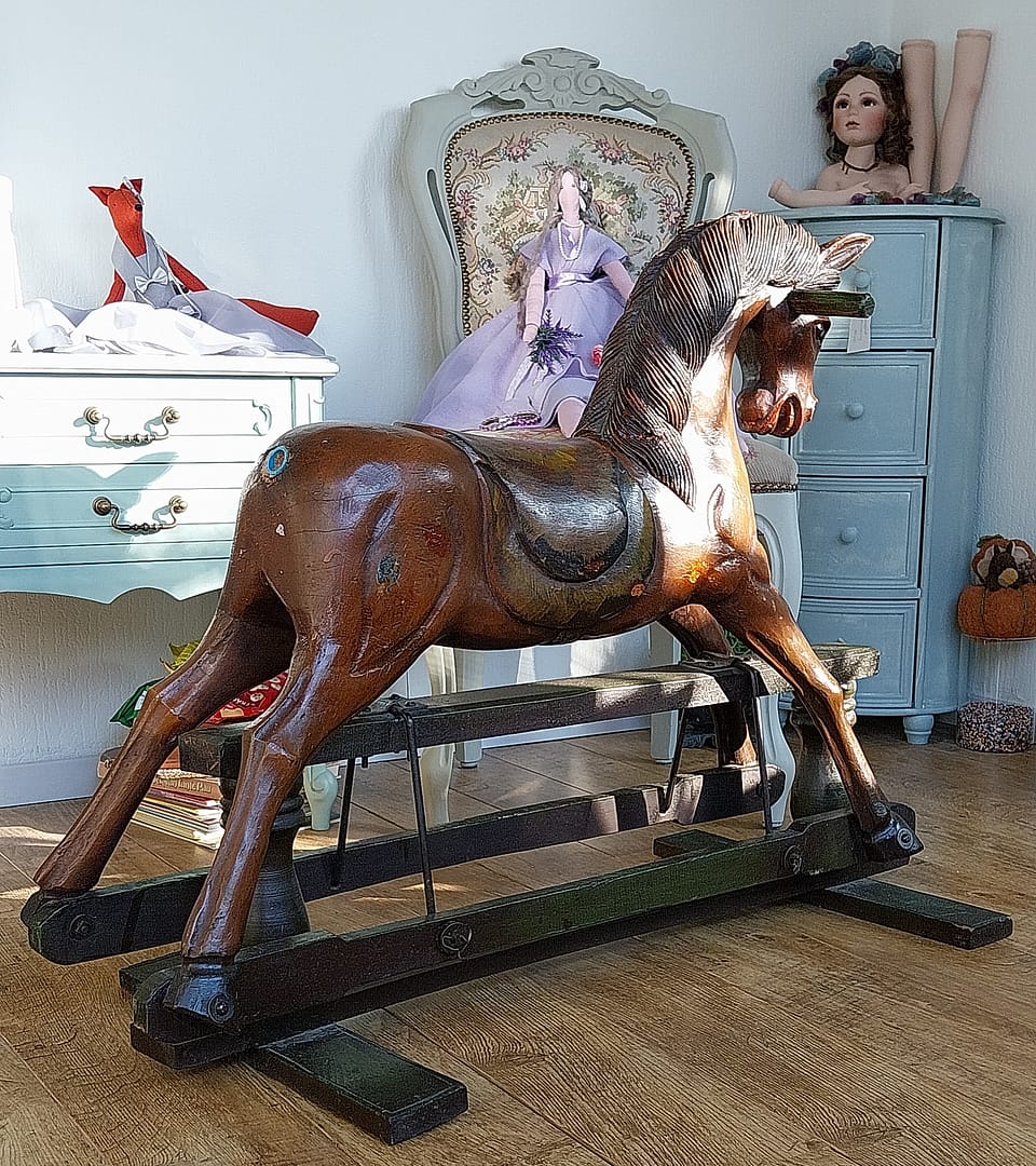 Het antieke houten hobbelpaard heeft een klassieke uitstraling en vertoont natuurlijke gebruikssporen en patina die passen bij zijn leeftijd. Deze stukken zijn vaak gewild bij verzamelaars vanwege hun vakmanschap, historische betekenis en nostalgische waarde. Handgemaakt, wat onderscheidt van moderne, machinaal vervaardigde varianten.