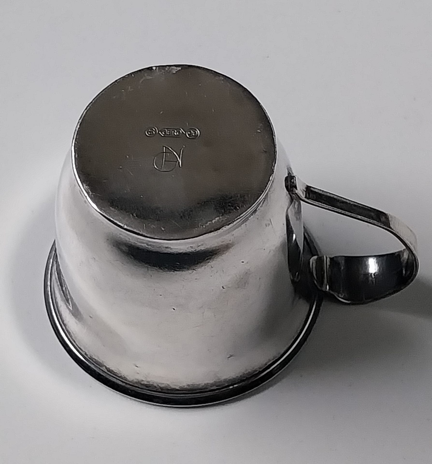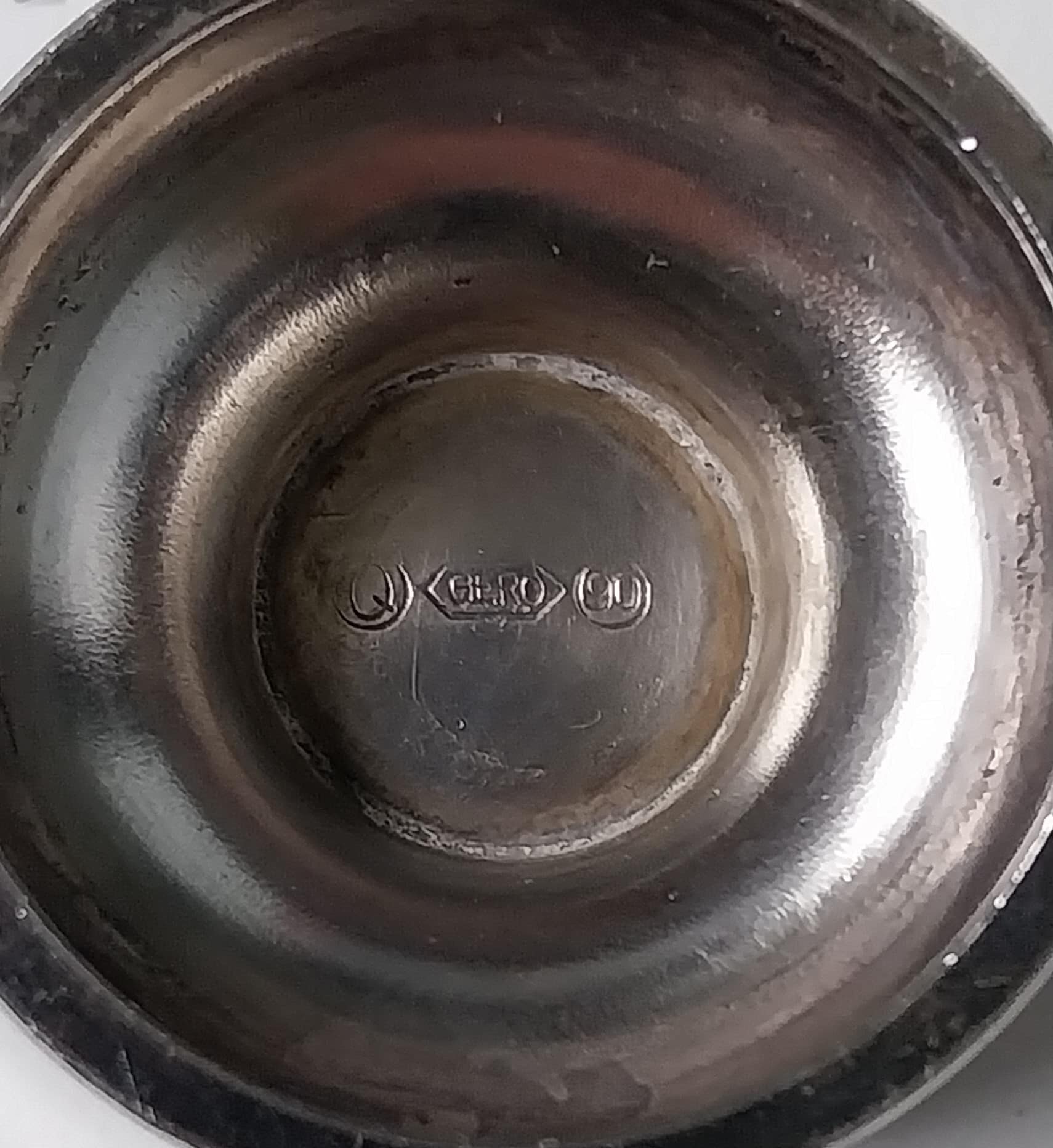 - Het servies met bord, beker, eierdopje en servetring zijn gemerkt met Gero 90 en voorzien van de initialen van de kunstenaar die het heeft ontworpen.