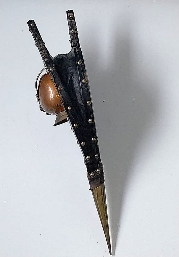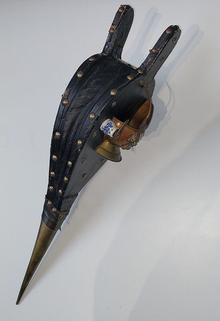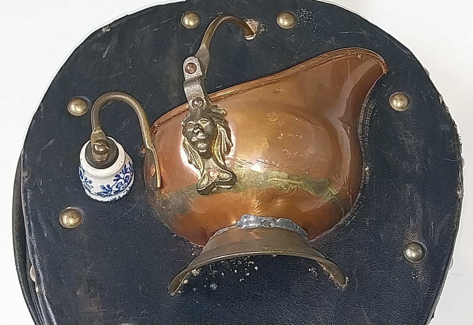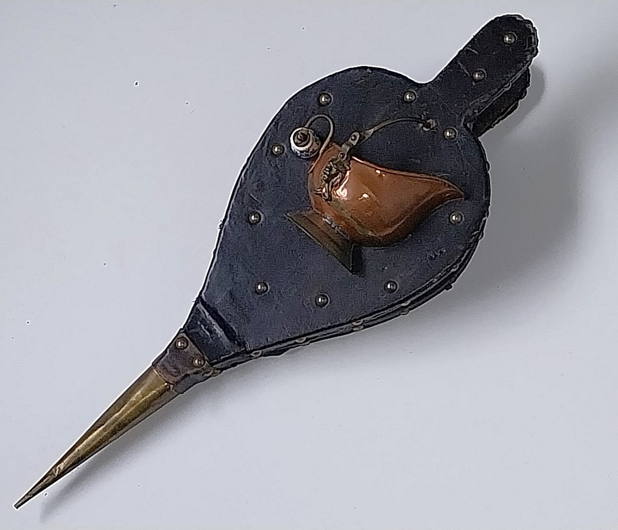 - Eén zijde van de blaasbalg heeft een zeer uniek decoratief element: een massief koperen, Hollandse plantenbak. De plantenbak is versierd met een messing leeuwenkop en een Delfts blauw keramisch handvat. De tuit is van messing.