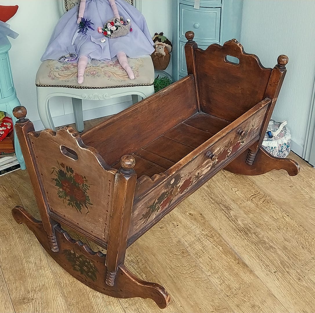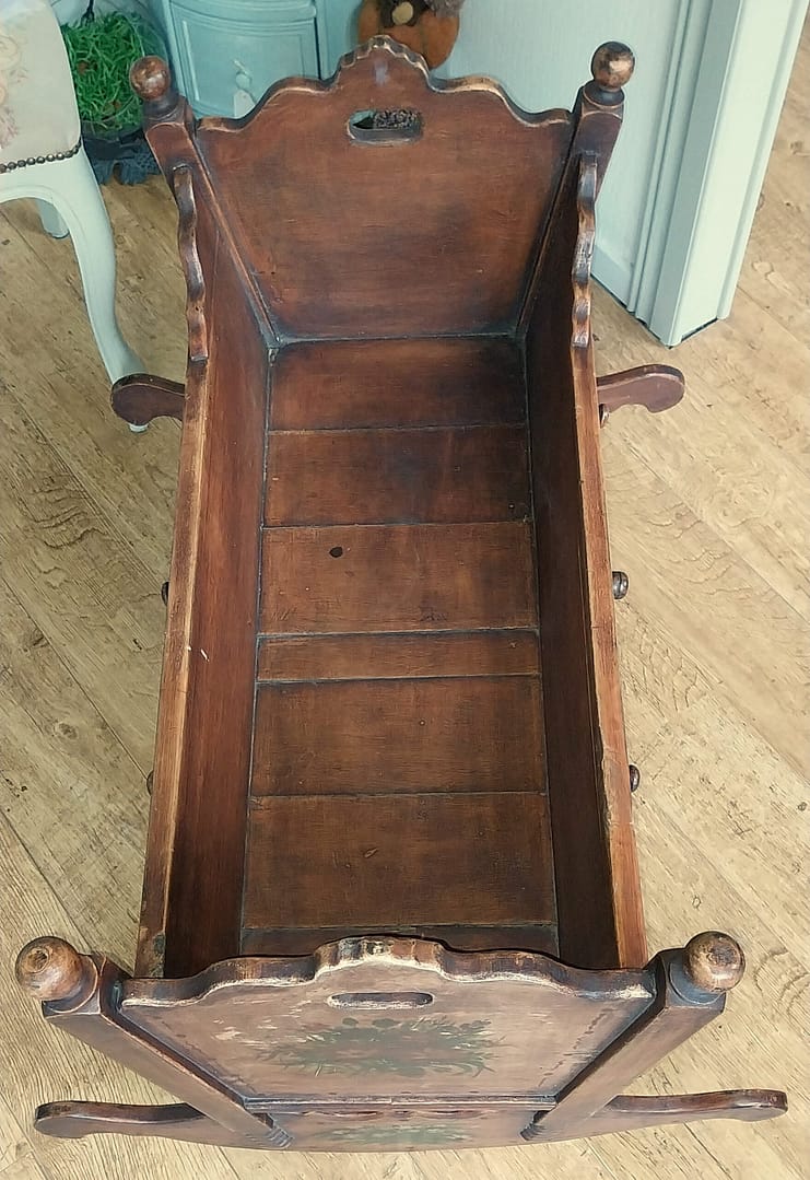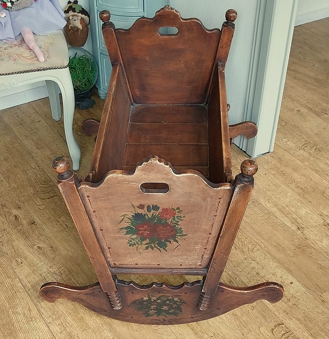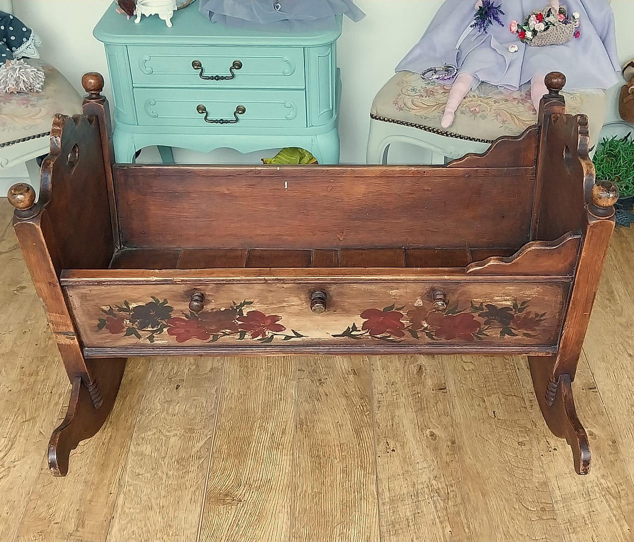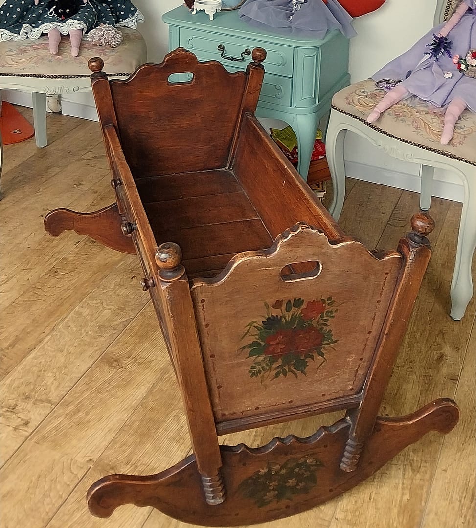 - Antieke, brocante houten schommelwieg of kribbe met handgeschilderde bloemmotieven in een volkskunststijl. Deze schommelwieg is vermoedelijk afkomstig uit de regio Hindeloopen in Nederland of Beieren in Duitsland, waar deze stijl van beschildering erg populair was.