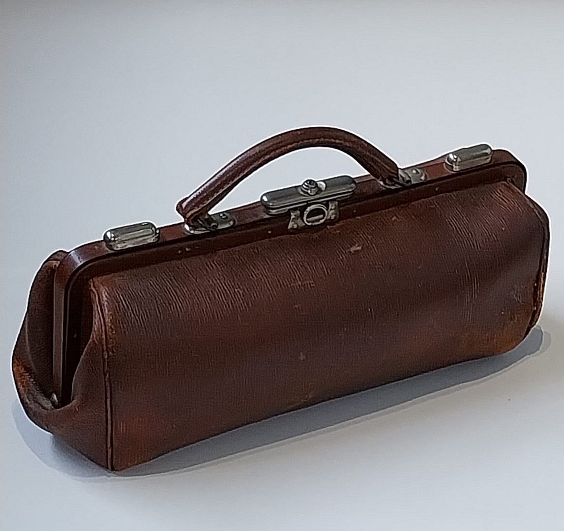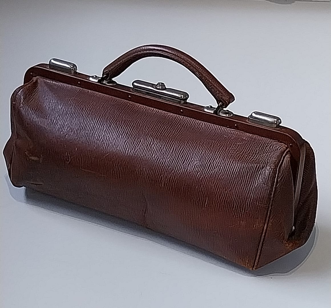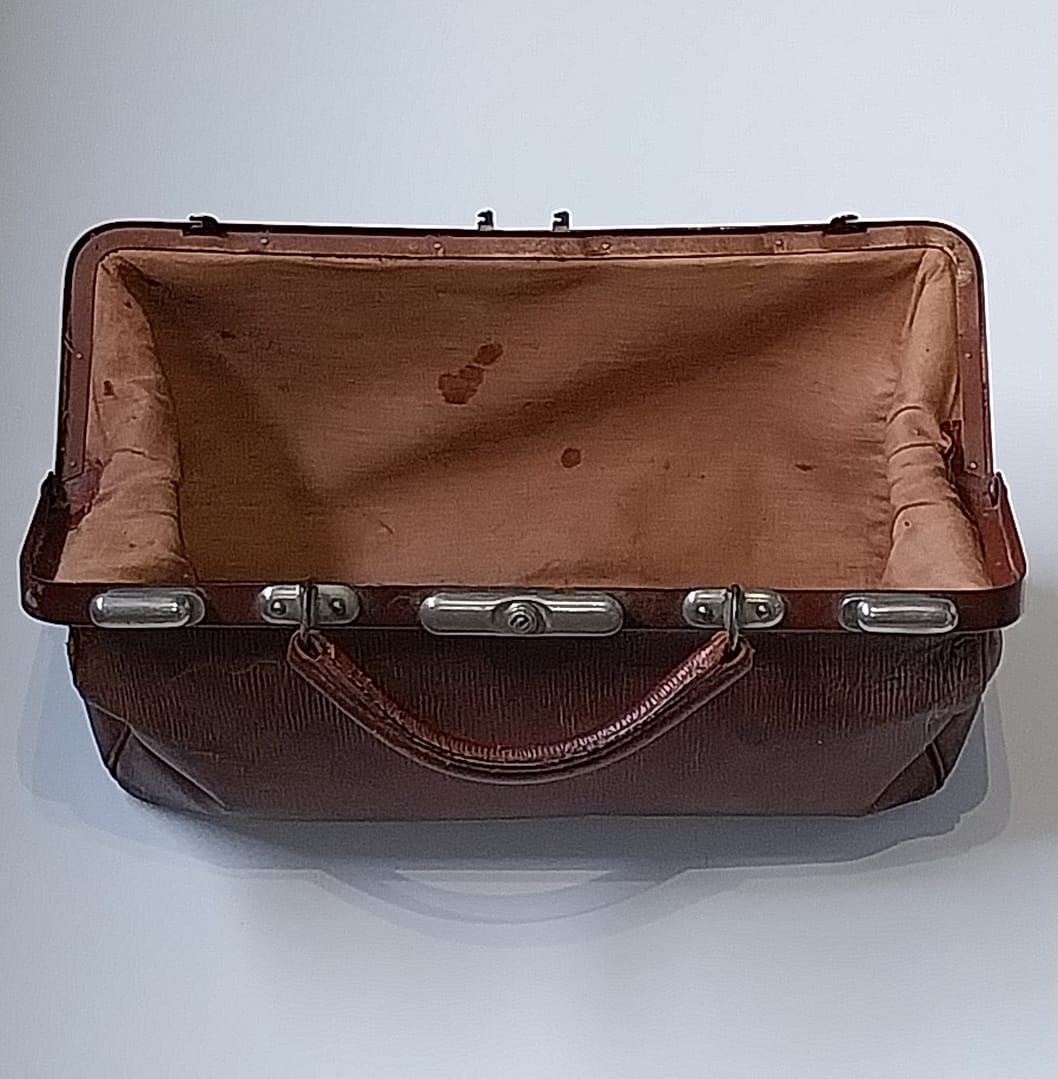 - Deze dokterstas, ook wel bekend als een Gladstone-tas dateert uit de jaren ‘30, is een draagbare tas die traditioneel door artsen werd gebruikt om medische benodigdheden en medicijnen te vervoeren bij huisbezoeken.
