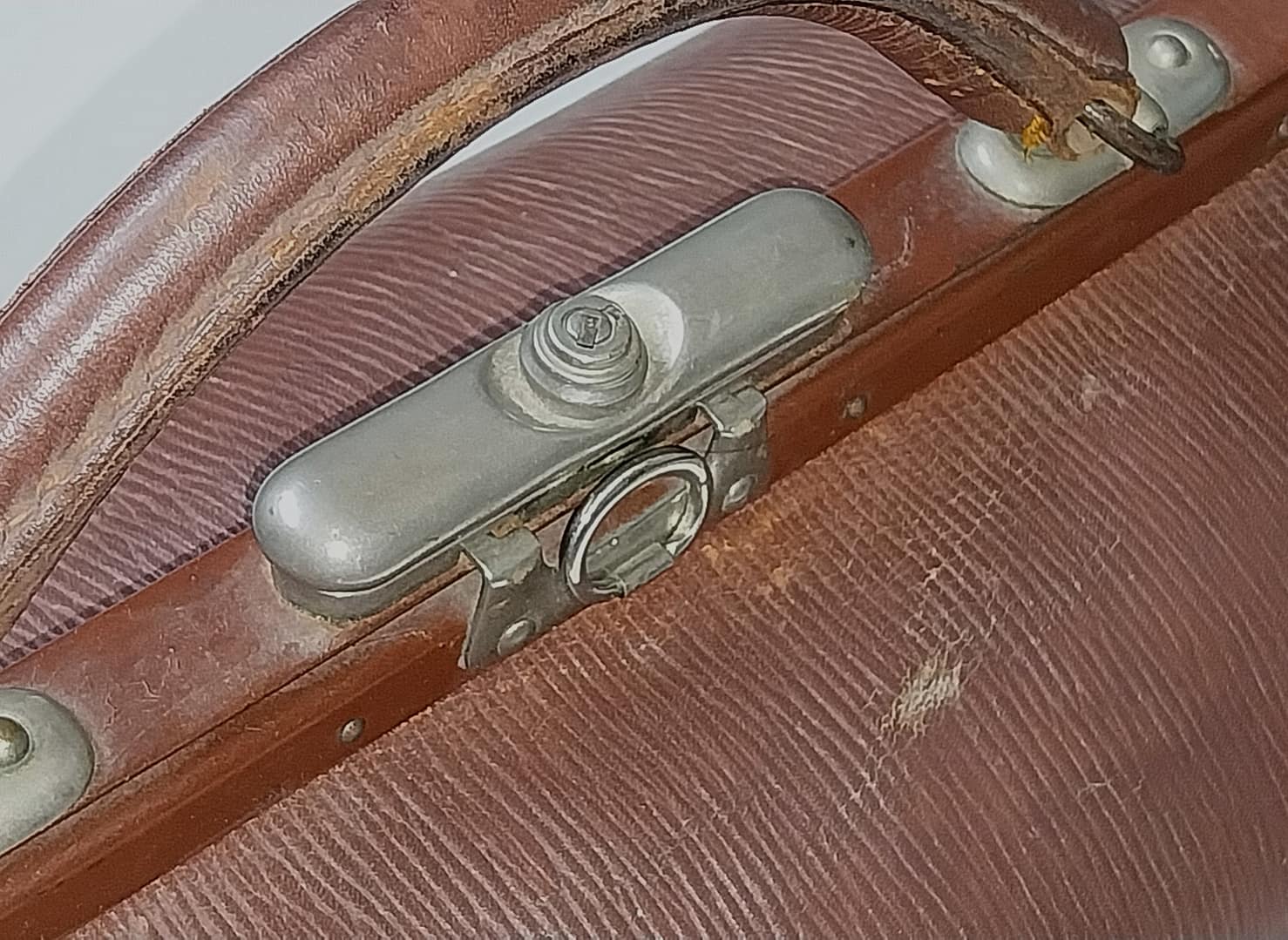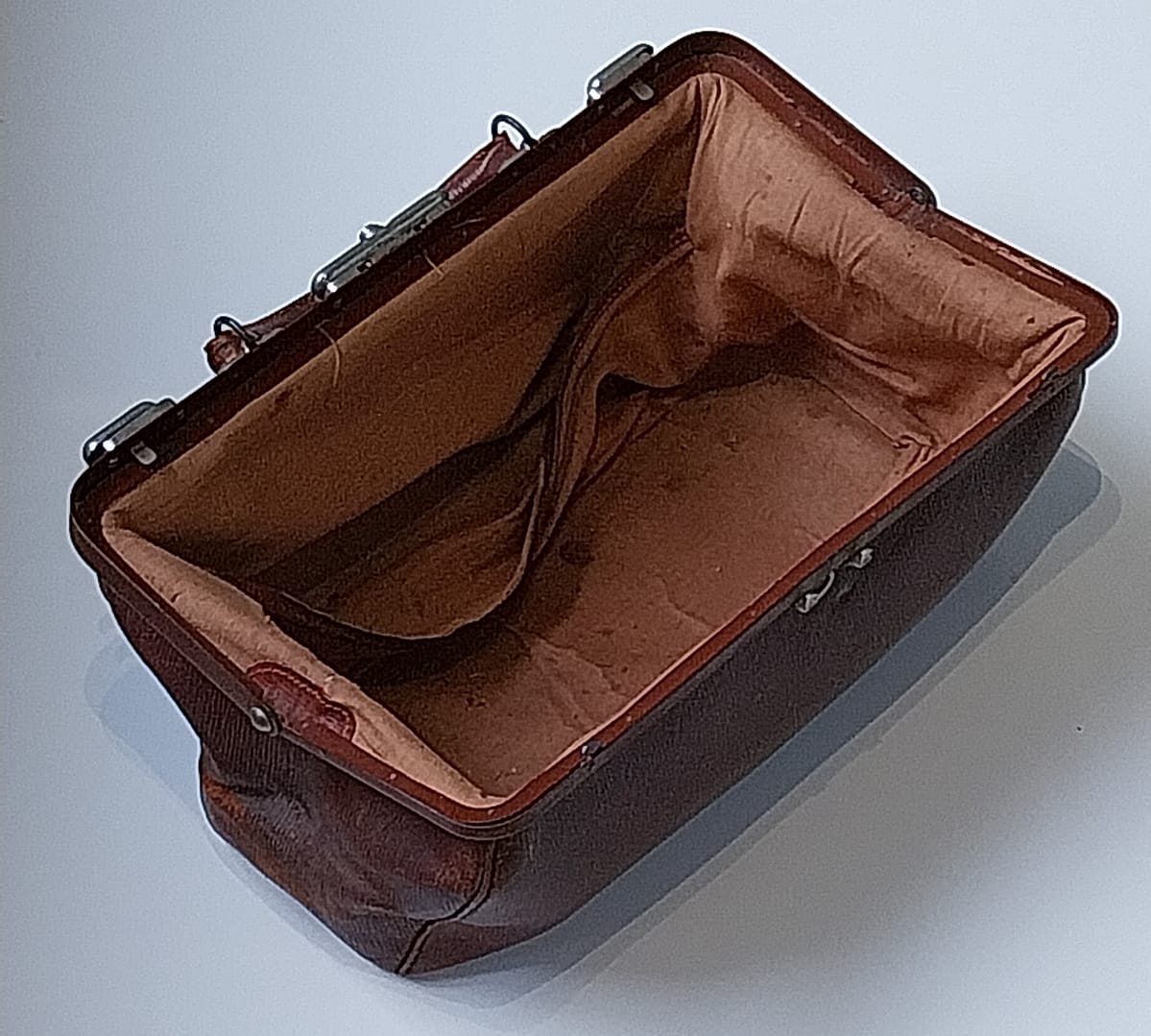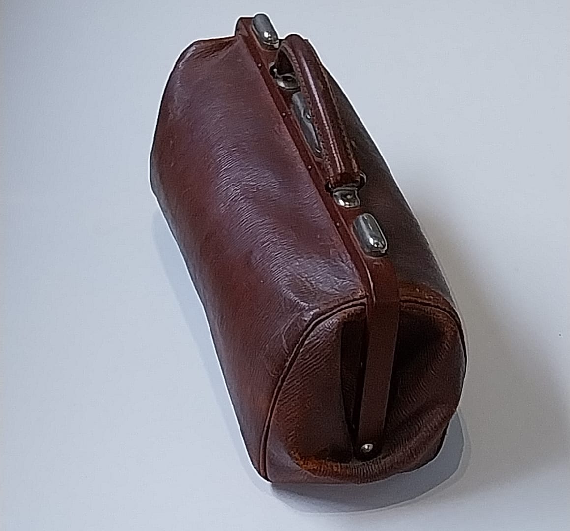 - Deze dokterstas, ook wel bekend als een Gladstone-tas dateert uit de jaren ‘30, is een draagbare tas die traditioneel door artsen werd gebruikt om medische benodigdheden en medicijnen te vervoeren bij huisbezoeken.