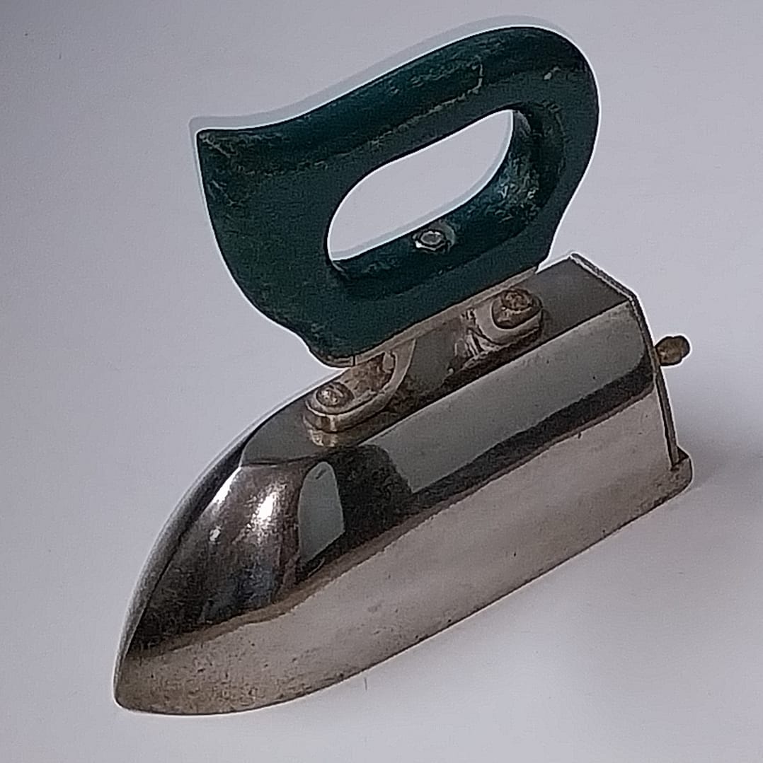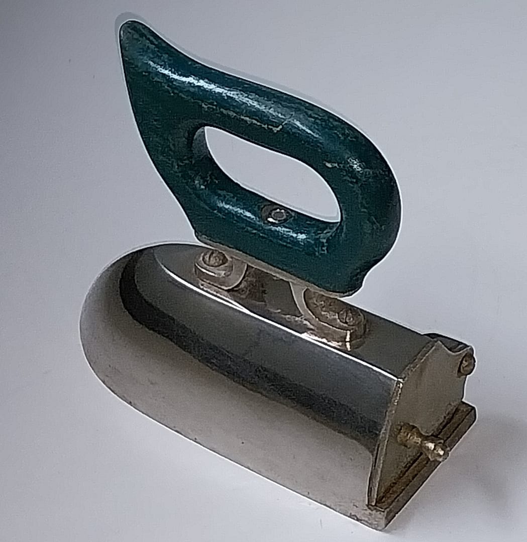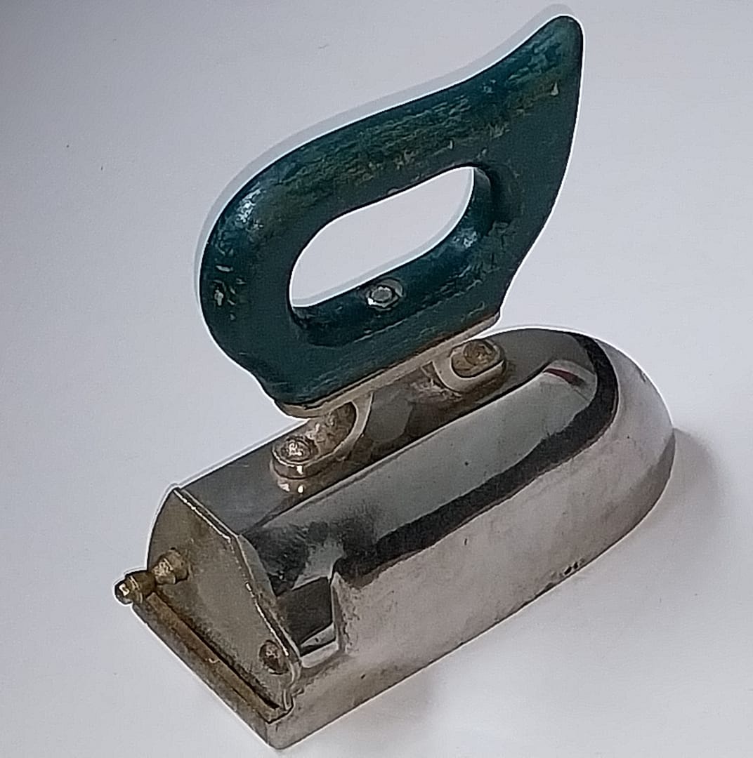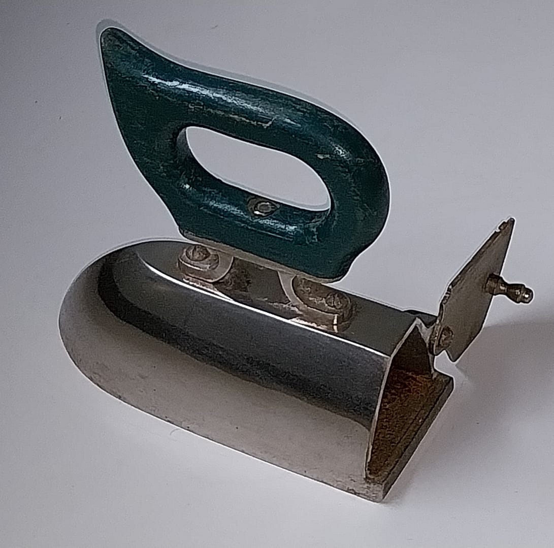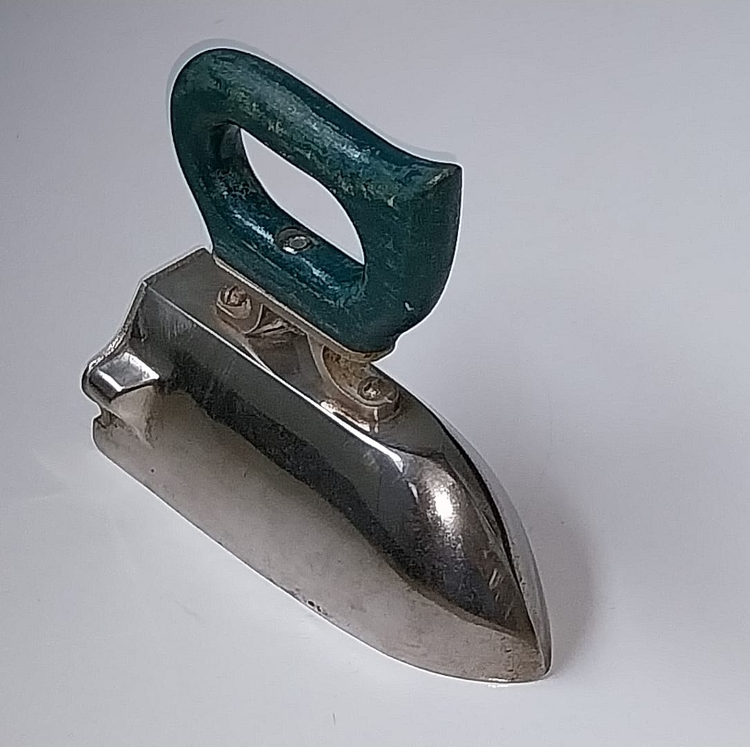 - Een pracht exemplaar, zwaar antiek gietijzeren strijkijzer is geheel verchroomd. Heeft een kolencompartiment, aan de achterzijde is een klepje met opening waar vroeger de heten kolen/houtskool in werden gestopt. Het heeft een houten handvat.