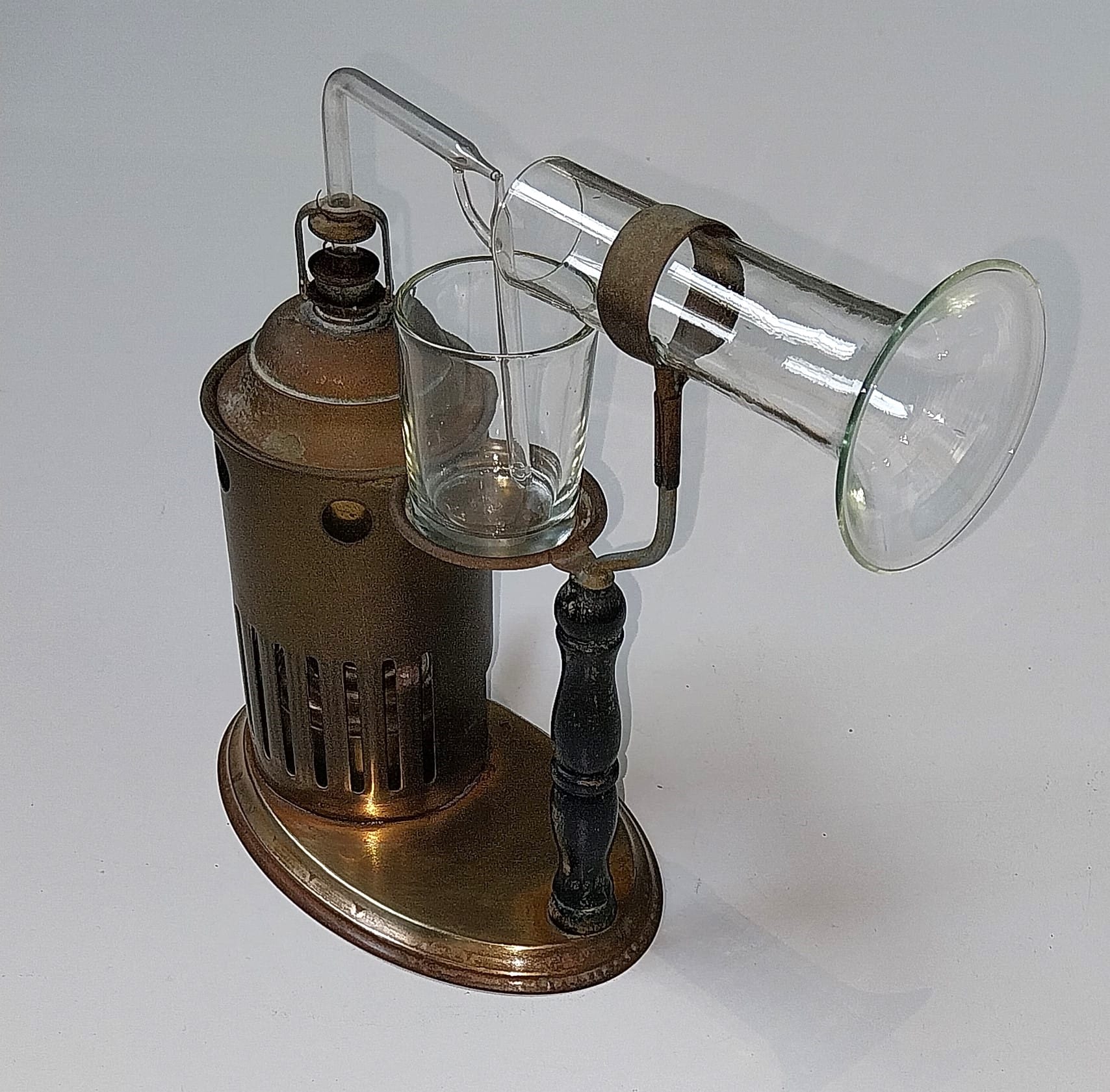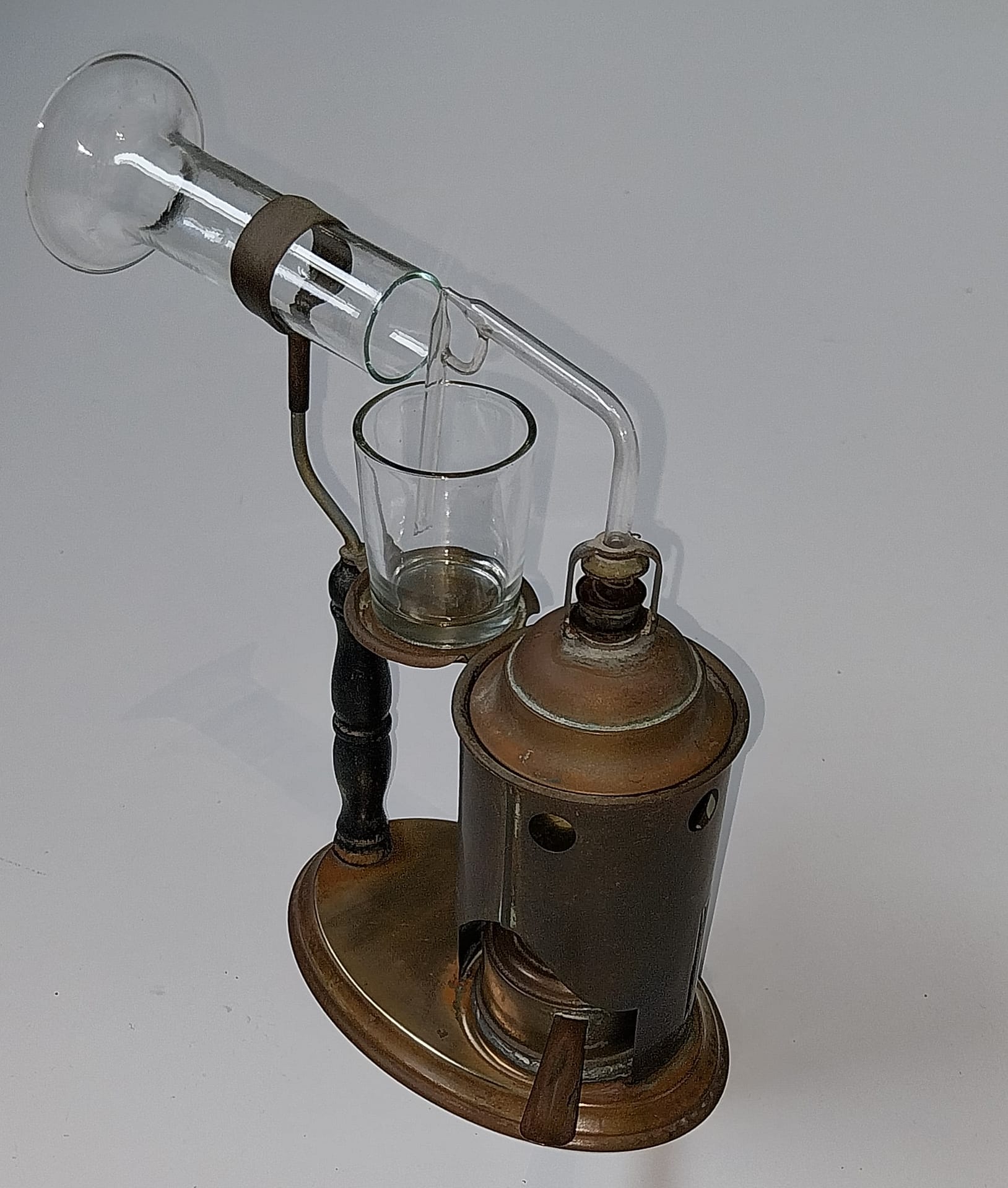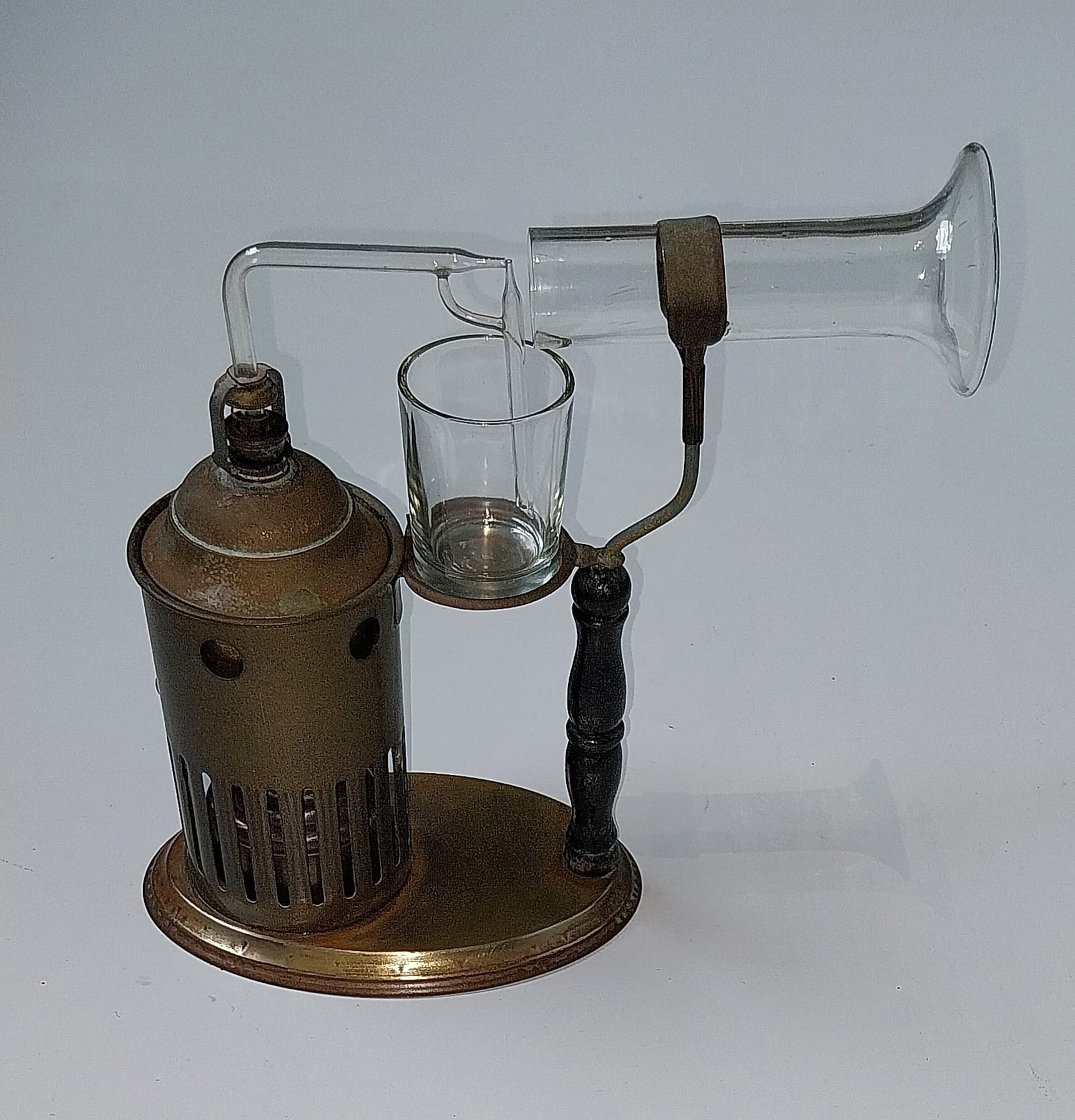 - Dit messing stoom-inhalatie-apparaat werd rond 1900 gebruikt tegen aandoeningen van de luchtwegen zoals astma. De brander brengt een waterreservoirtje aan de kook, waarvan de ontsnappende stoom het medicijn in een glazen maatbakje meezuigt.