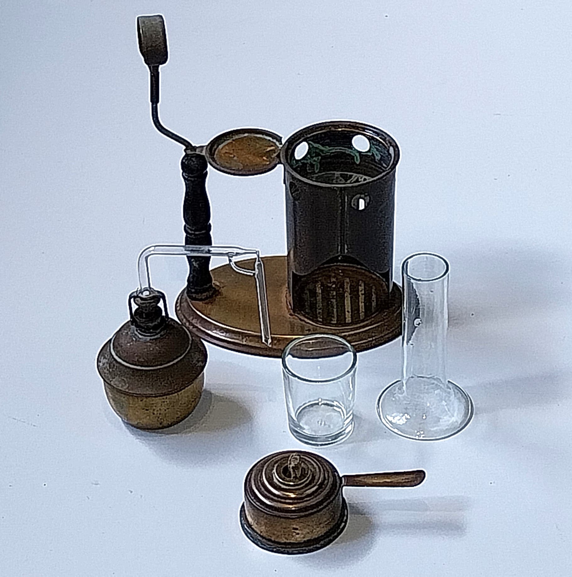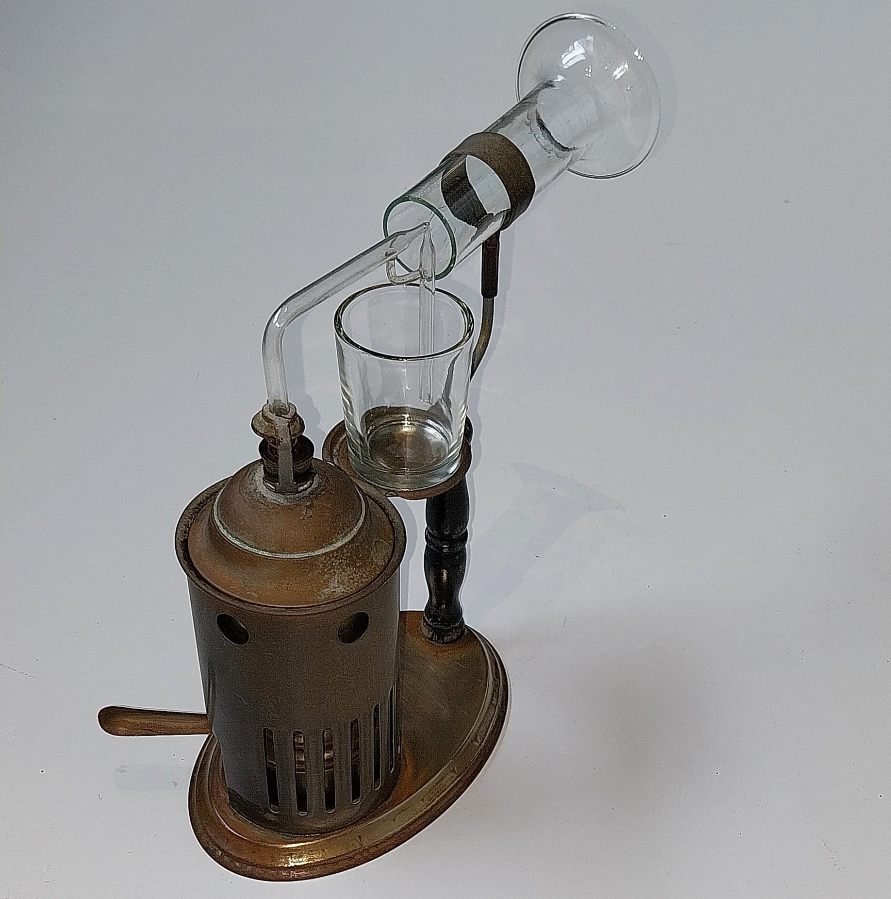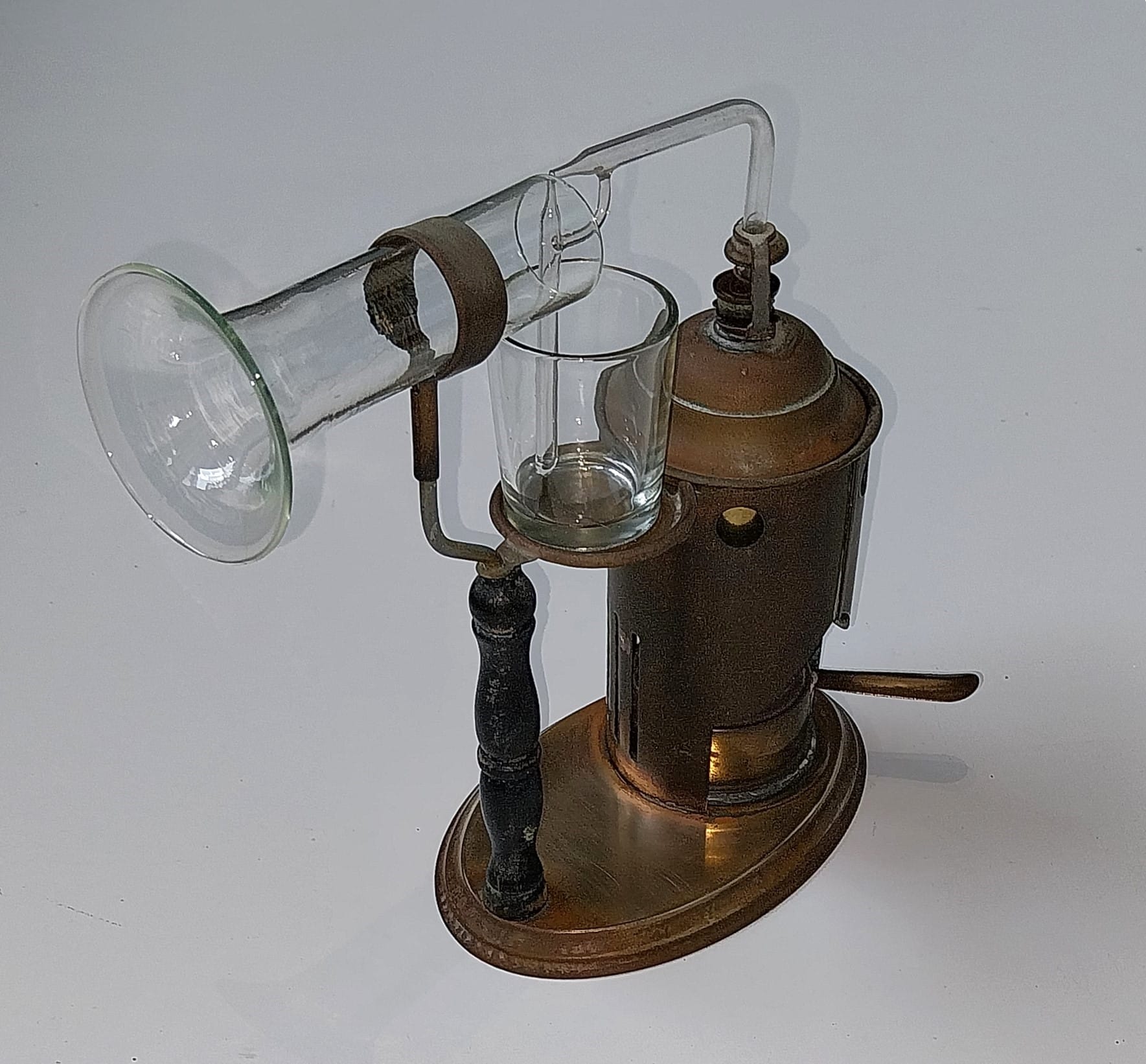 - Dit messing stoom-inhalatie-apparaat werd rond 1900 gebruikt tegen aandoeningen van de luchtwegen zoals astma. De brander brengt een waterreservoirtje aan de kook, waarvan de ontsnappende stoom het medicijn in een glazen maatbakje meezuigt.
