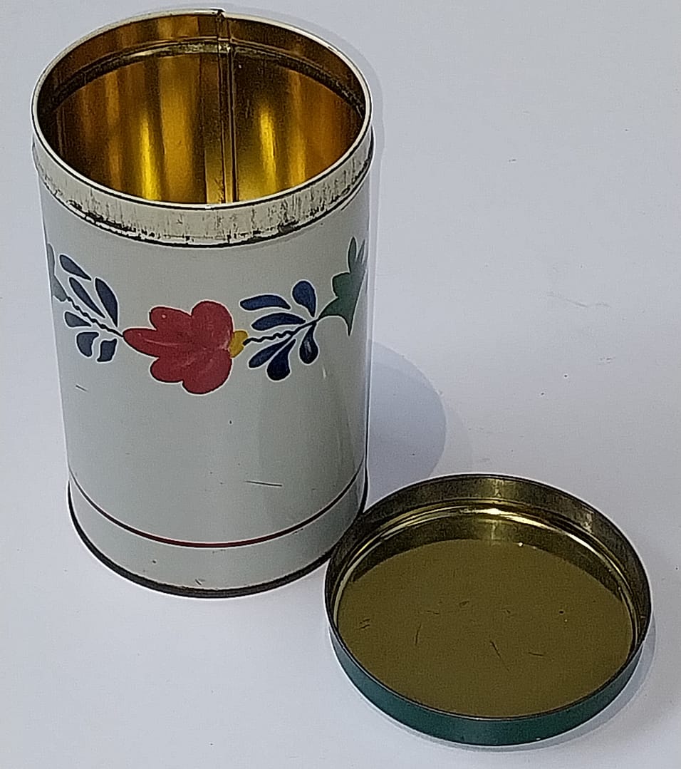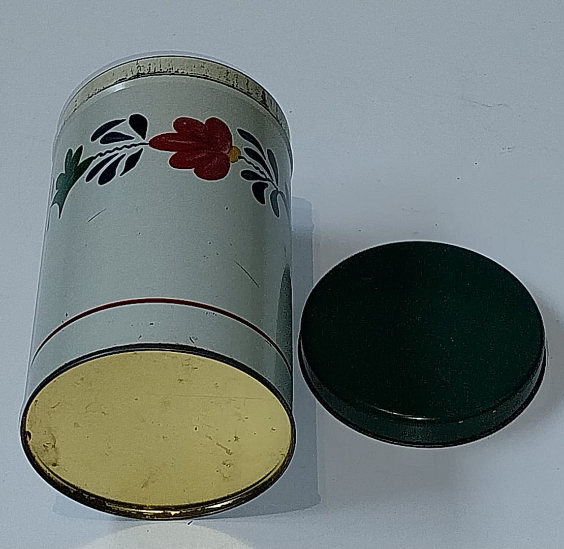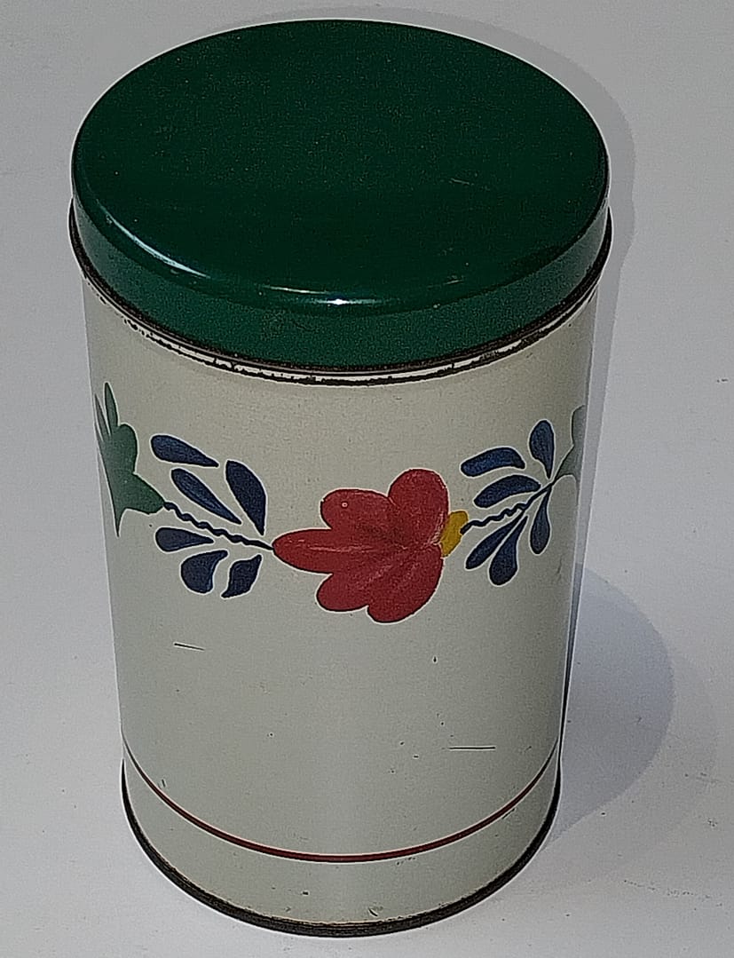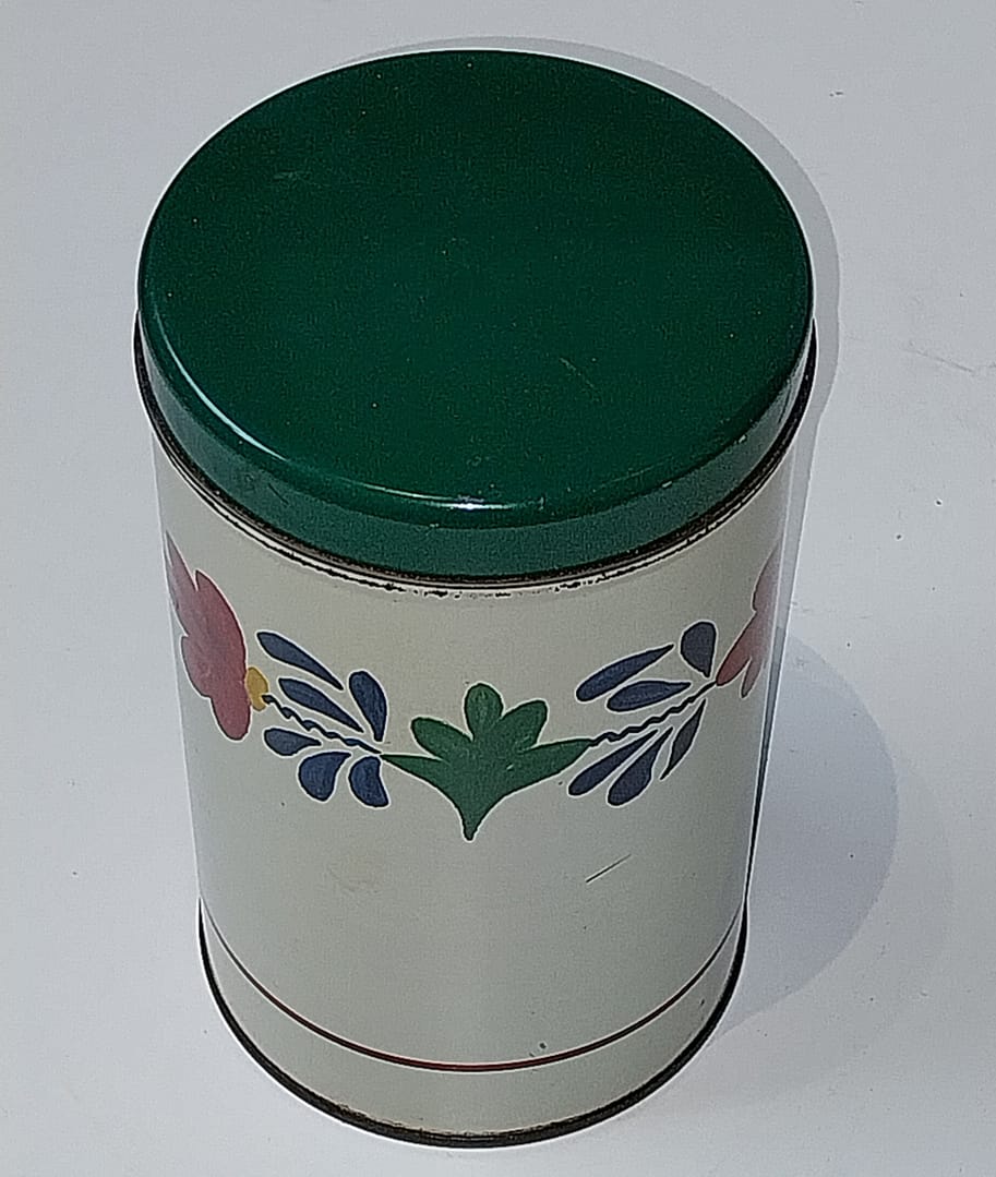 Boerenbont voorraadblikken, met het iconische wit, met bloemendecor en een groene deksel.