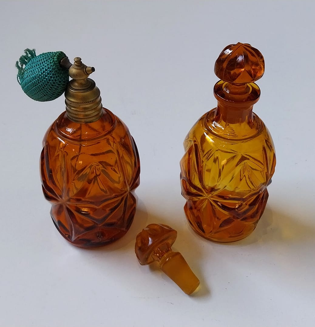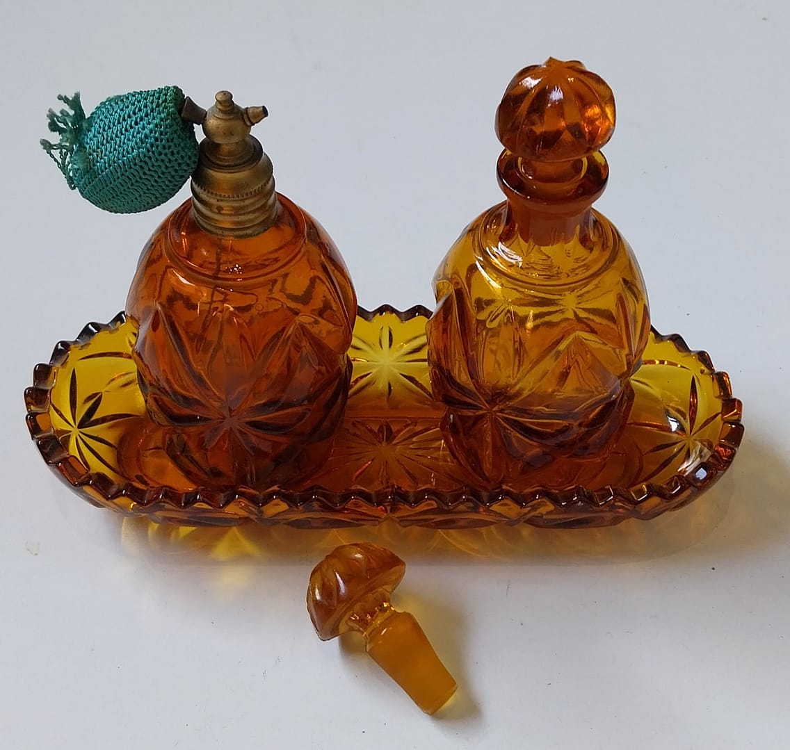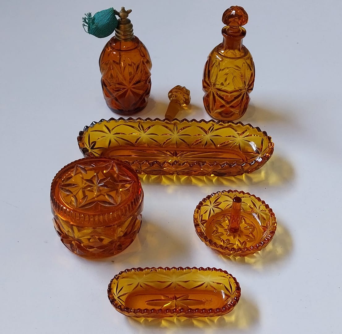 Antiek Bohemia Art Deco kaptafelset ook wel boudoir-set genoemd van amberkleurig glas, daterend uit de jaren 1920-1930. Deze sets werden oorspronkelijk in Tsjecho-Slowakije vervaardigd en is gekenmerkt door een stervormig of geslepen diamantpatroon.