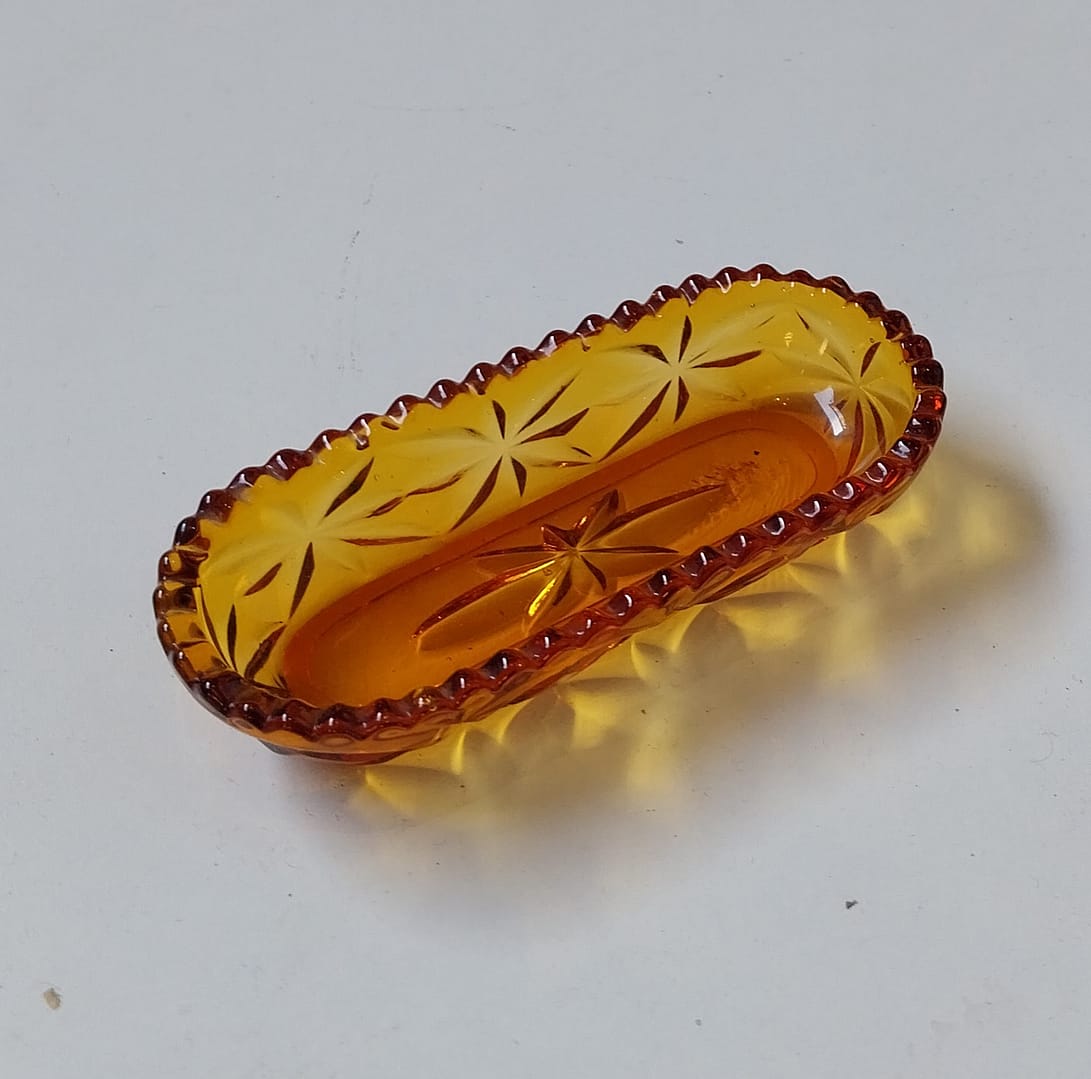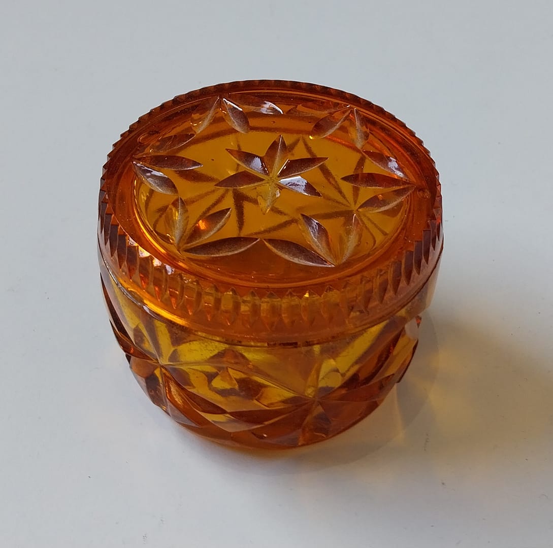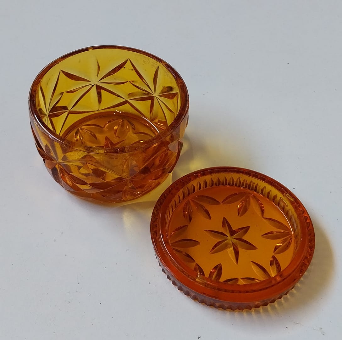 Antiek Bohemia Art Deco kaptafelset ook wel boudoir-set genoemd van amberkleurig glas, daterend uit de jaren 1920-1930. Deze sets werden oorspronkelijk in Tsjecho-Slowakije vervaardigd en is gekenmerkt door een stervormig of geslepen diamantpatroon.