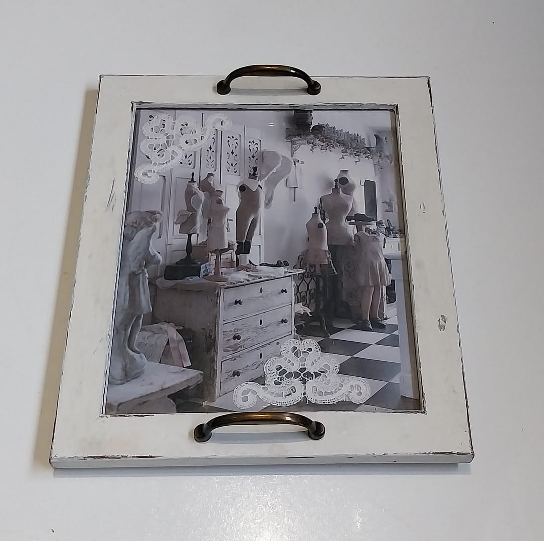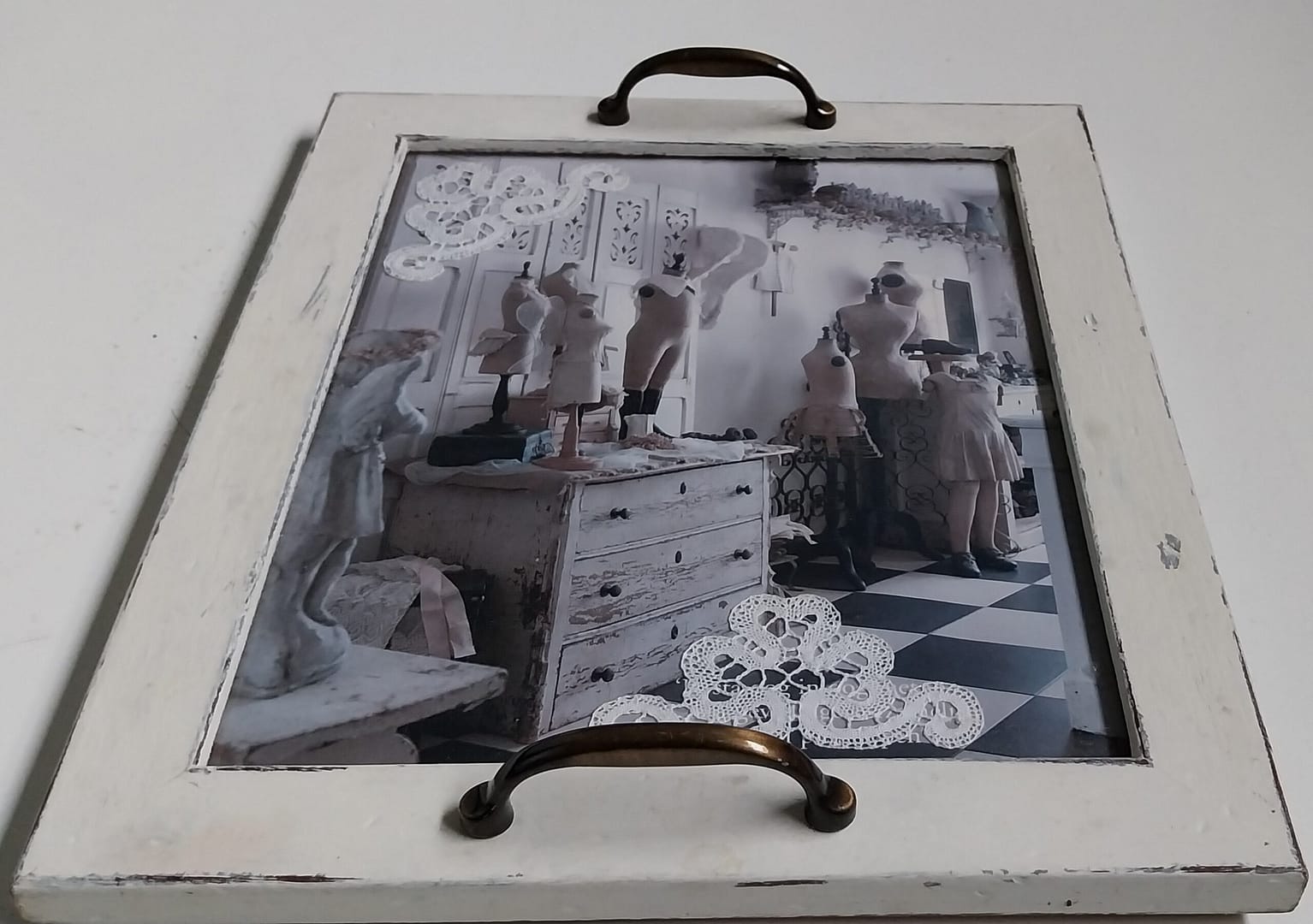 • Leuk brocant dienblad. Op het dienblad onder een glasplaatje zit een leuke brocante afbeelding dat tevens op creatieve wijze is versiert met kant.