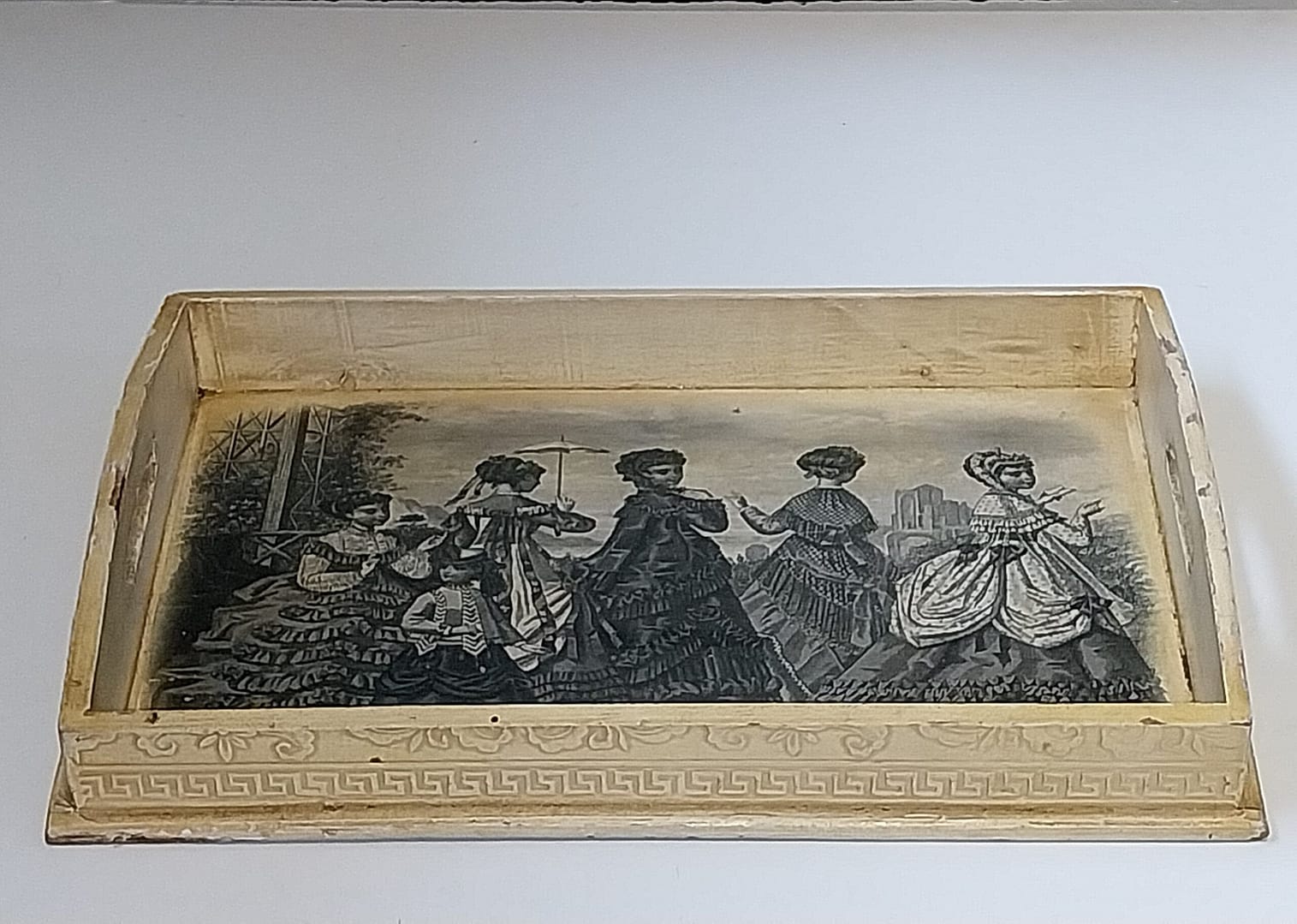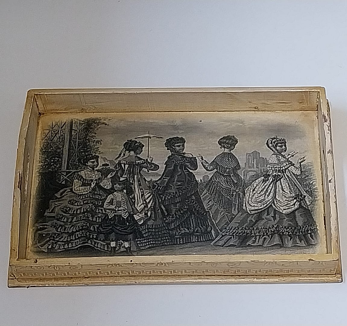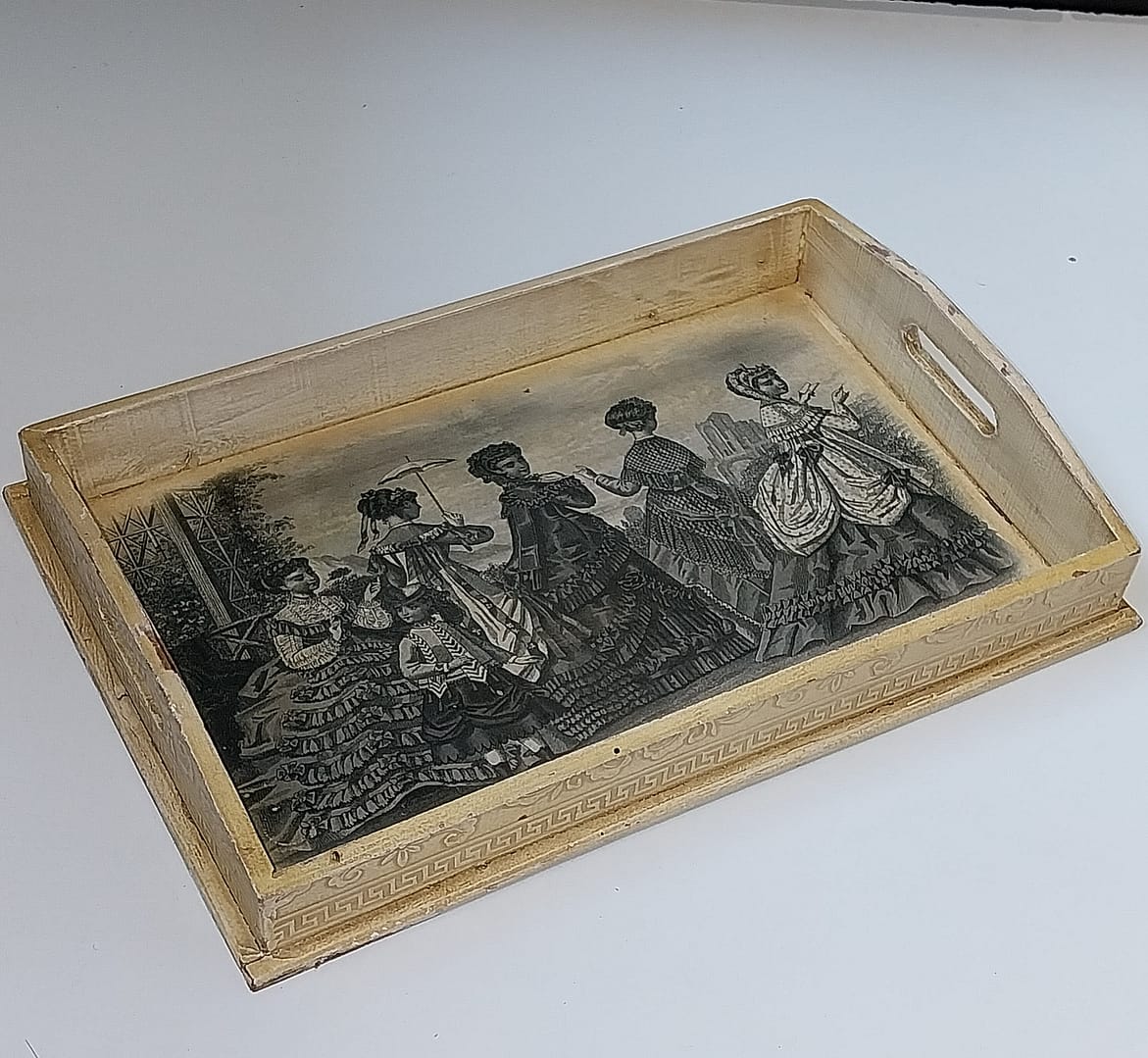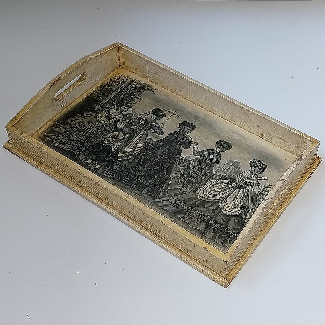 - Prachtig oud, brocante en doorleefd serveerblad met een afbeelding van 5 dames en een meisje gekleed in Victoriaanse stijl. De afbeelding in het zwart/wit verkeerd in zeer goede staat.