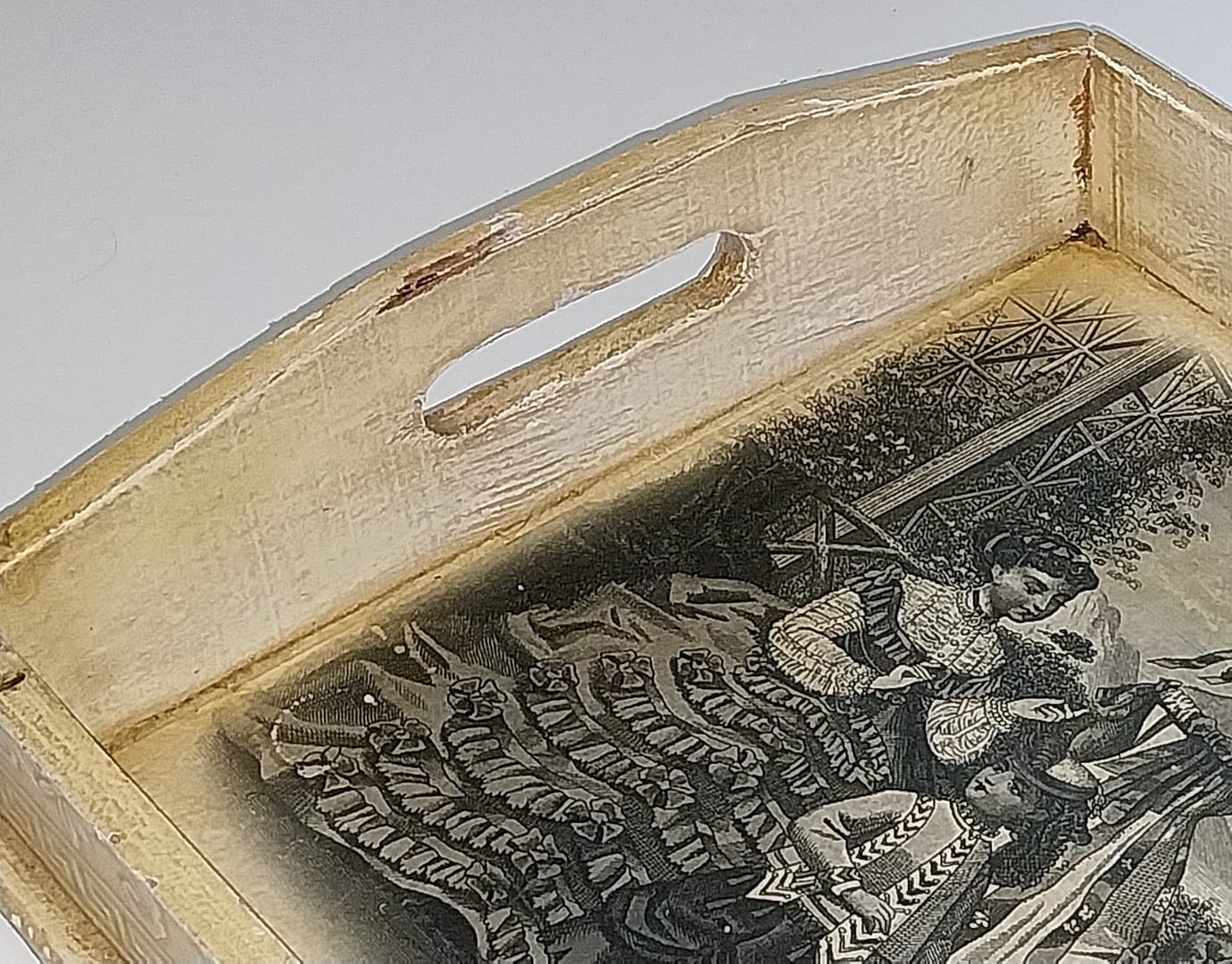 Brocant, doorleefd serveerblad met afbeelding Victoriaans stijl
