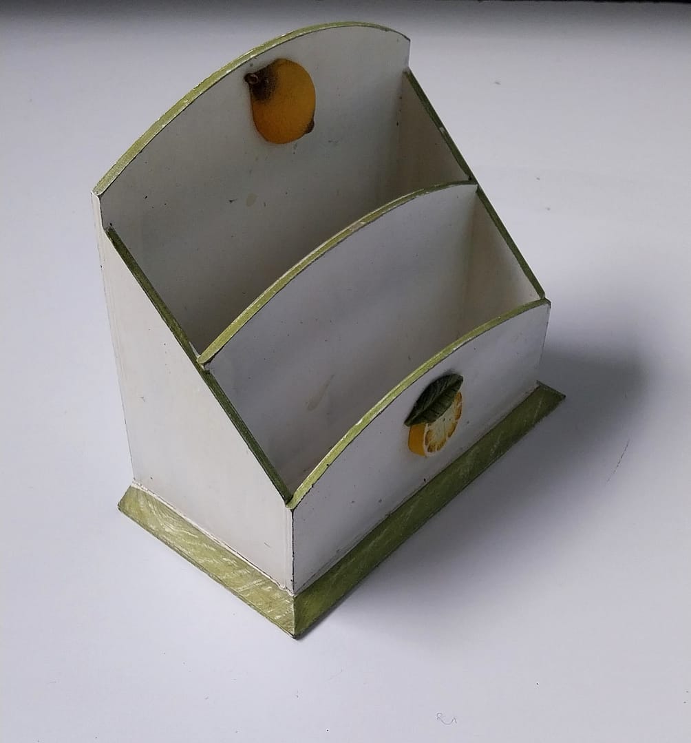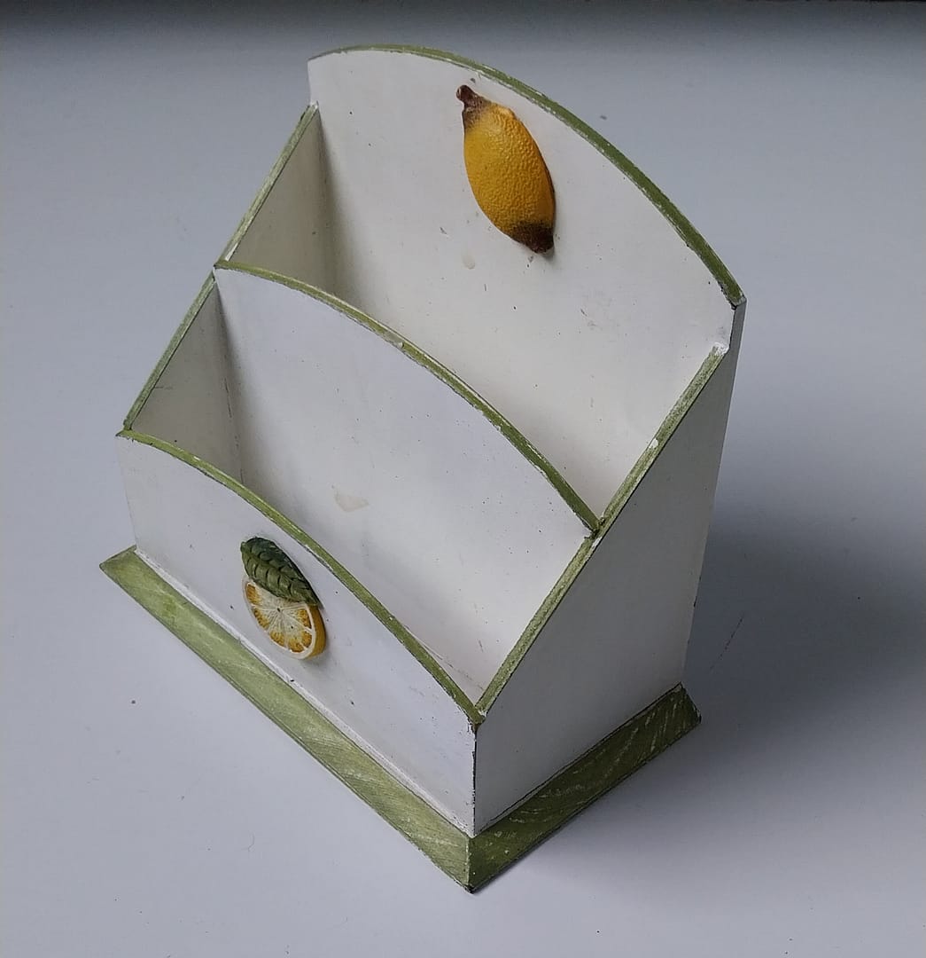 • Frans houten handgemaakt vrijstaand/wandmontage rekje. Werd bijvoorbeeld als postbakje en/of als koffiefilterrekje gebruikt.