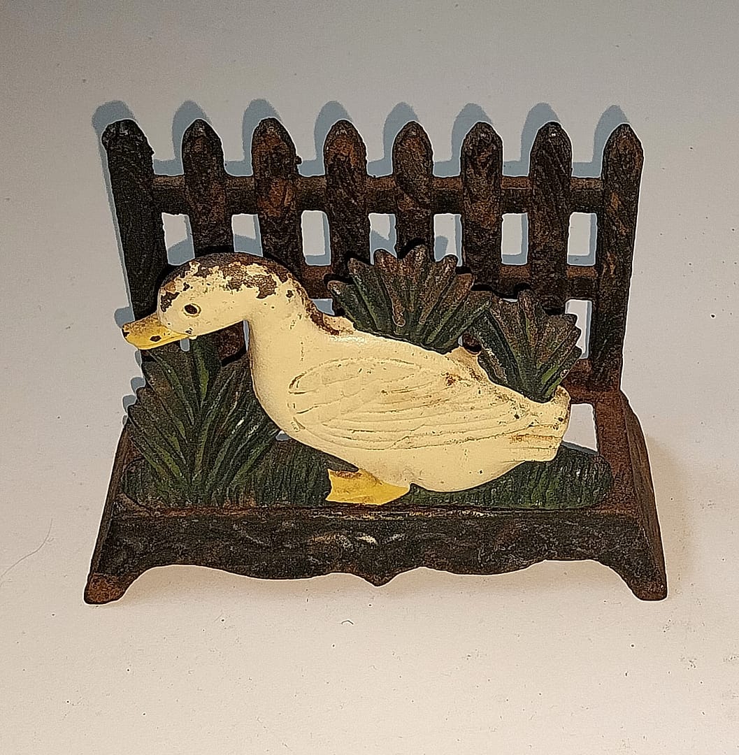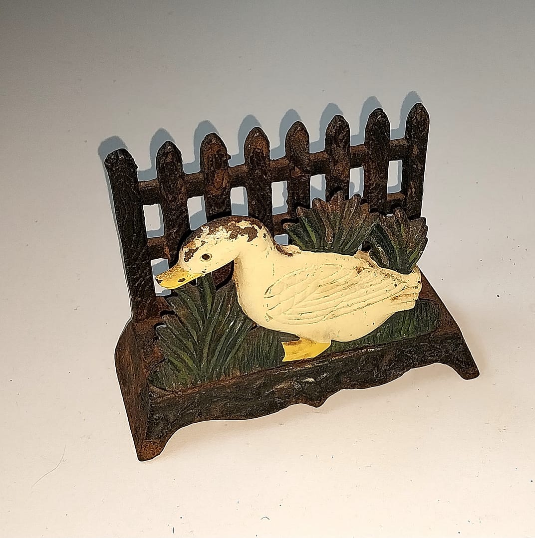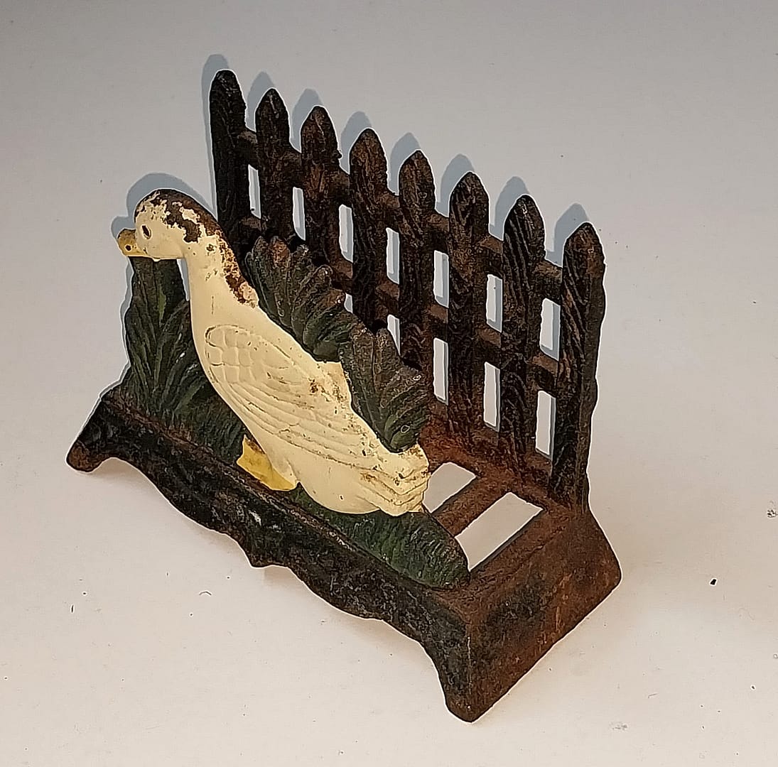 • Leuke brocante servethouder van gietijzer met afbeelding van een gans met plantenperkje en hekje.