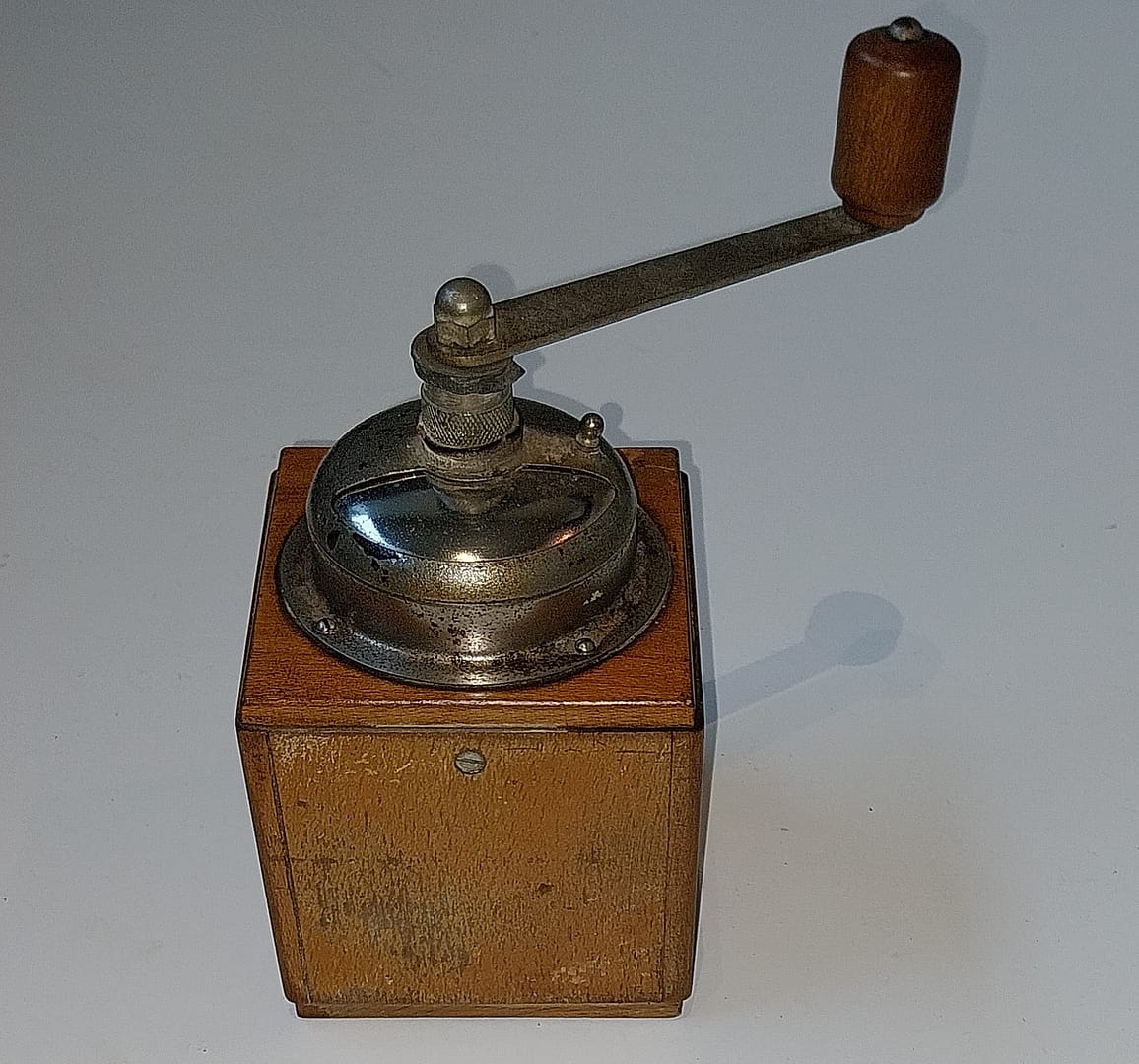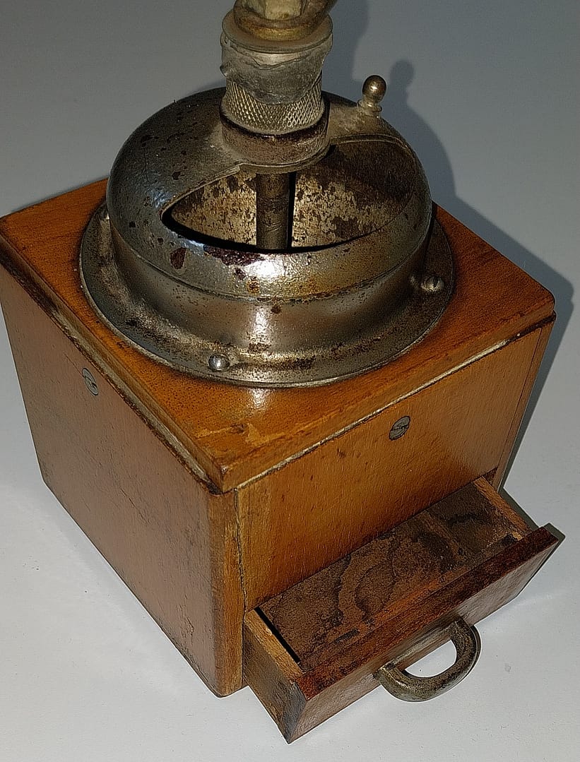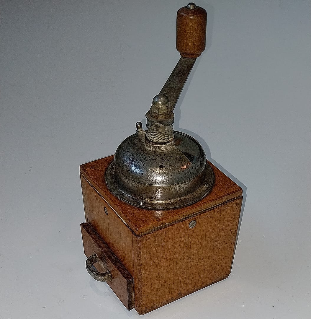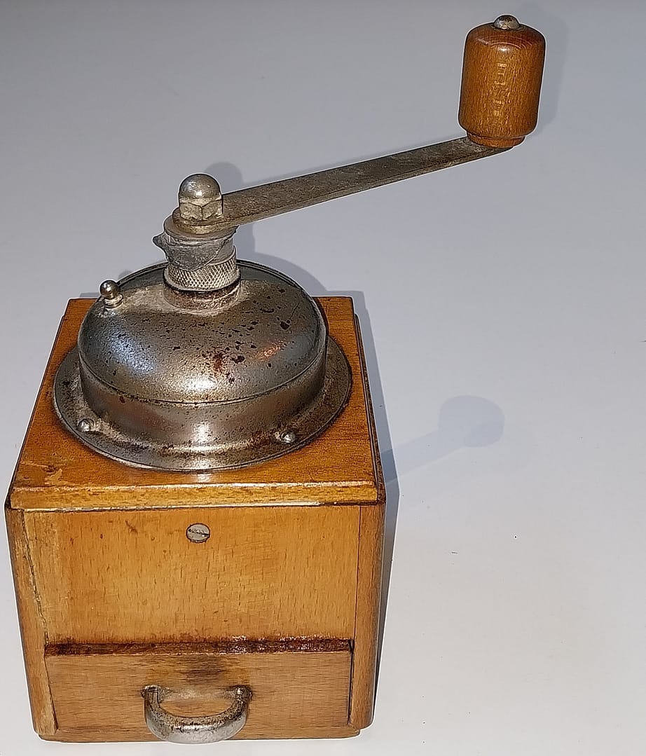 – Mooie houten werkende hand koffiemolen uit de jaren ’50