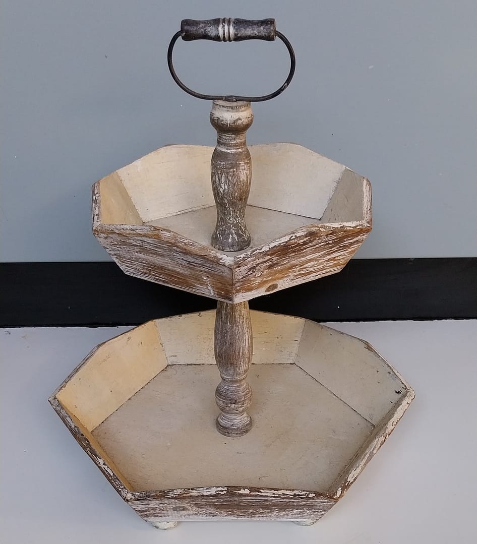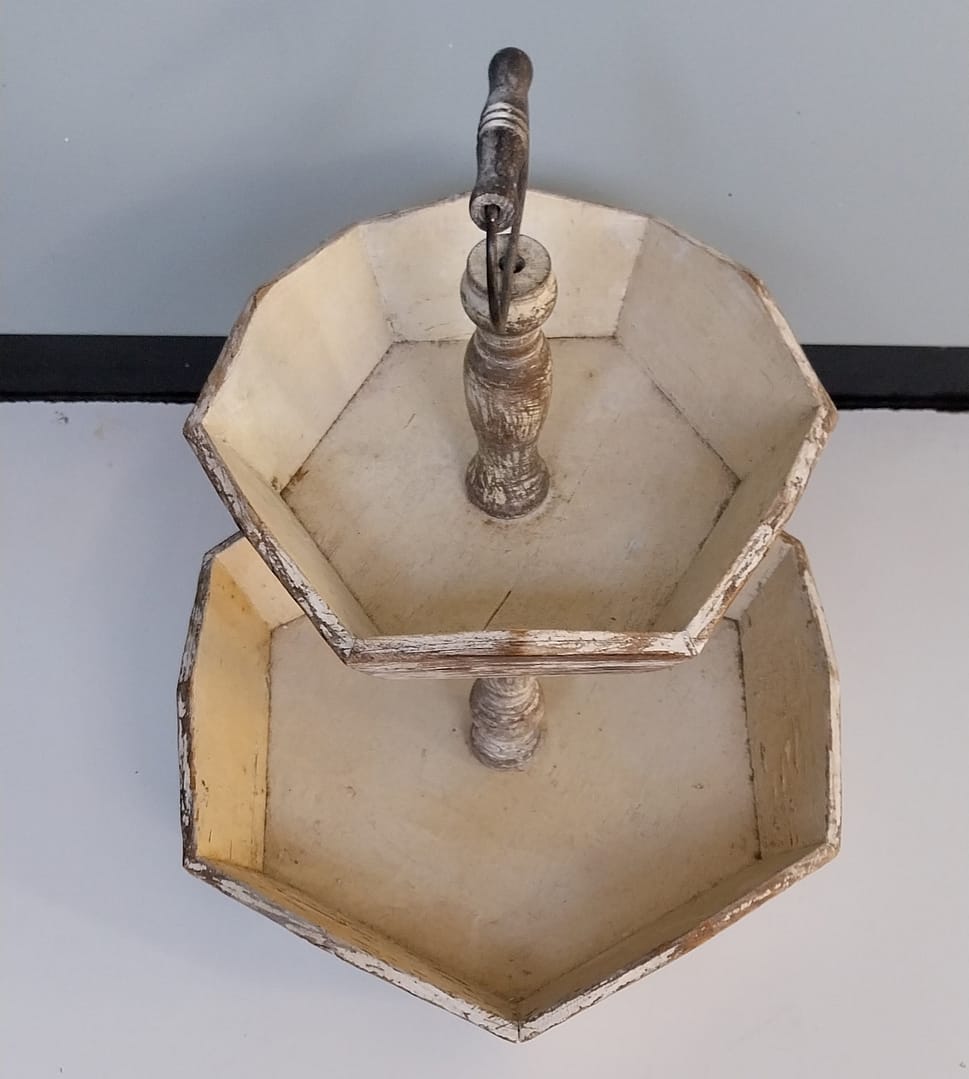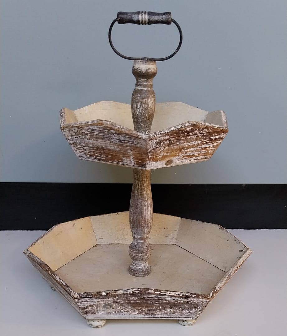 • Leuke oude houten etagère in 6- hoekige vorm met 2 verdiepingen.