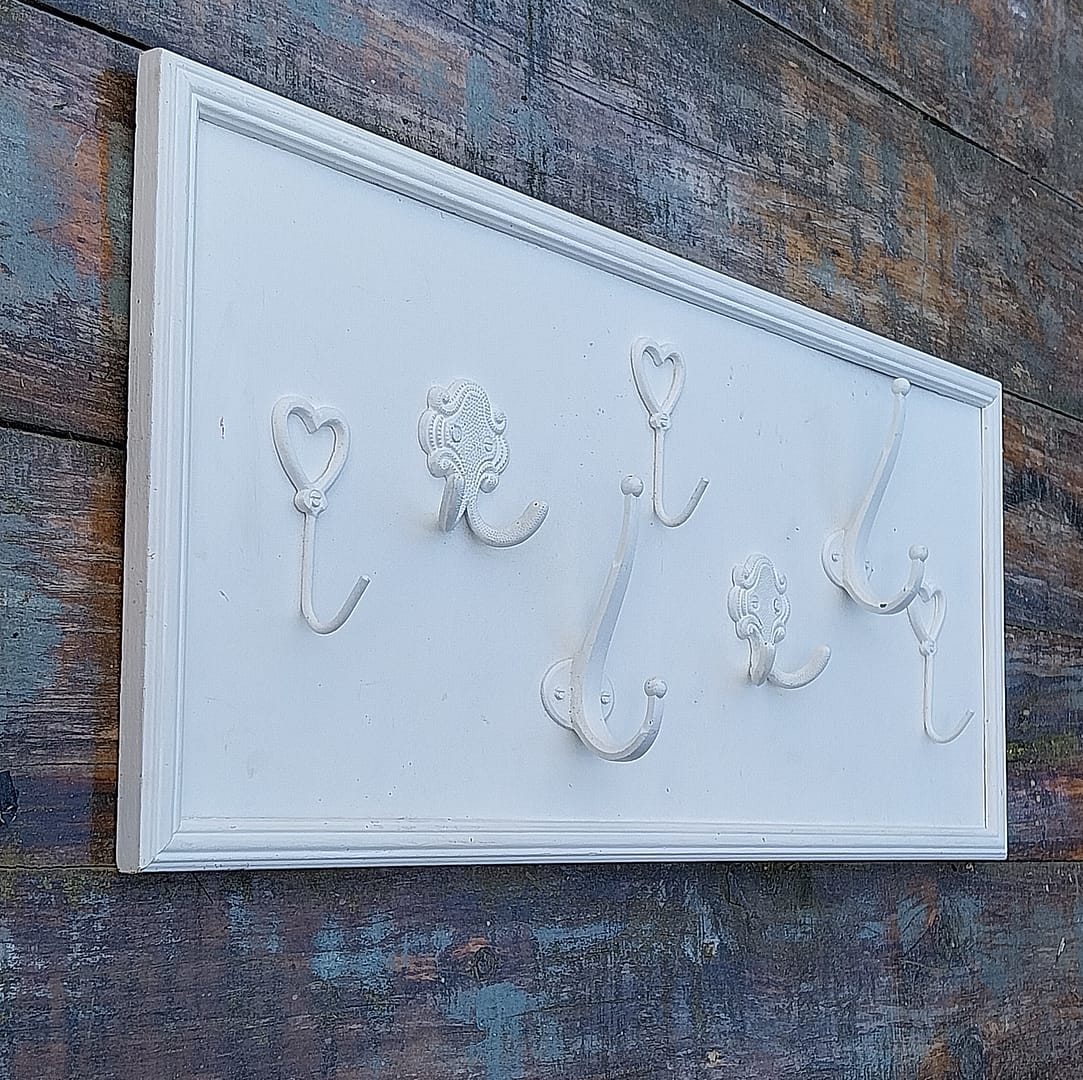 - Een witte houten achterplaat met een decoratieve rand, waarop verschillende soorten haken zijn gemonteerd.
