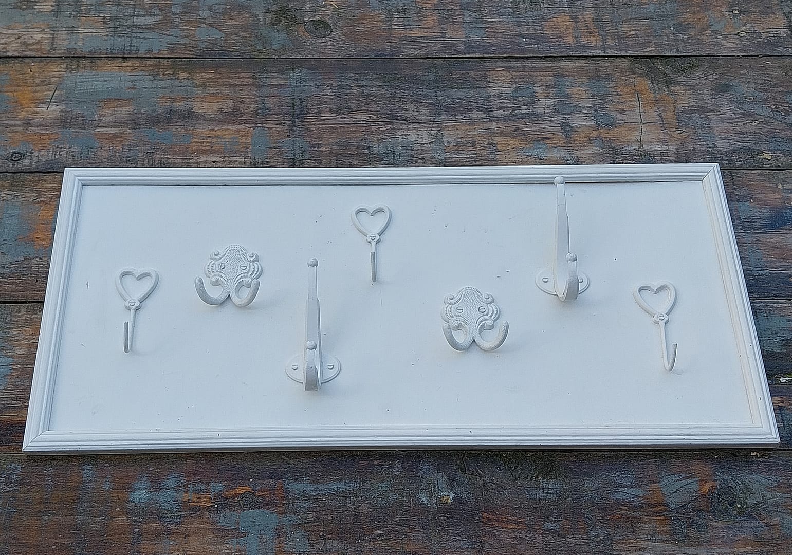 Brocante witte wandkapstok, bestaande uit een rechthoekig houten bord met 7 sierlijke gietijzeren haken. Deze kapstok is geschikt voor in een landelijke interieur voor handdoeken in de badkamer of als jashouder in de hal.