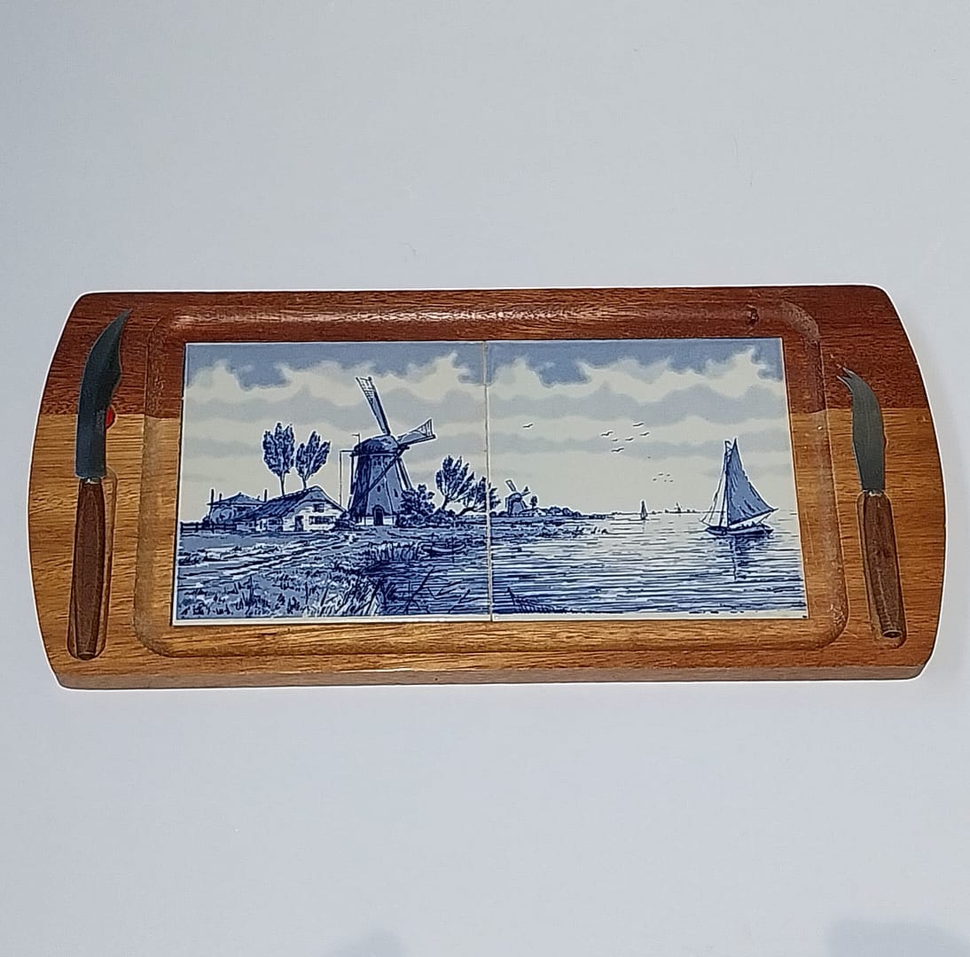 • Leuk Delfsblauw kaasplankje op de afbeelding een boederij met 2 molens en een zeilbootje op het water.