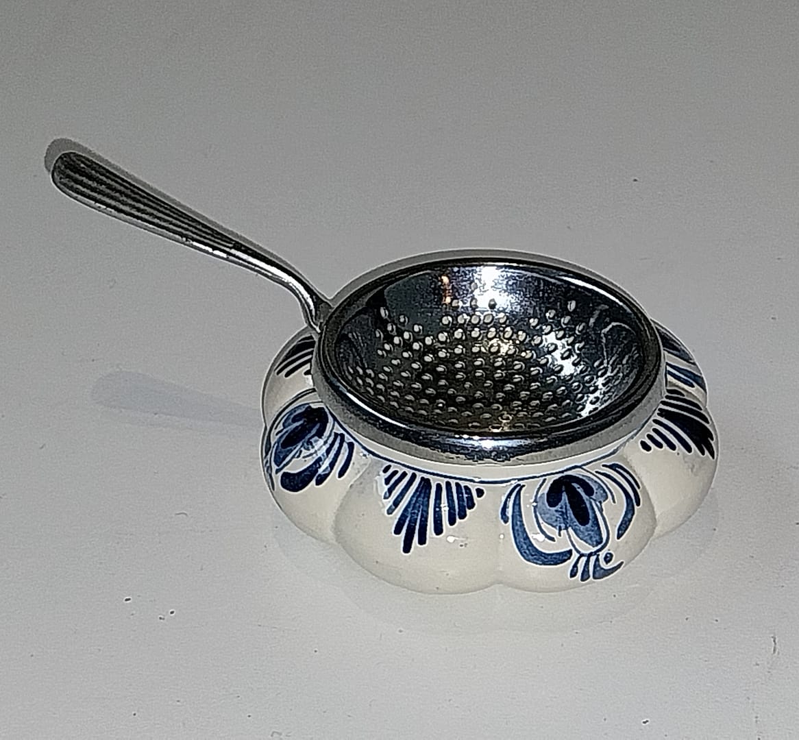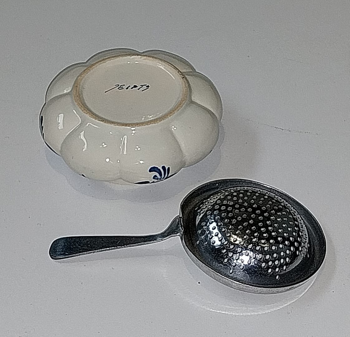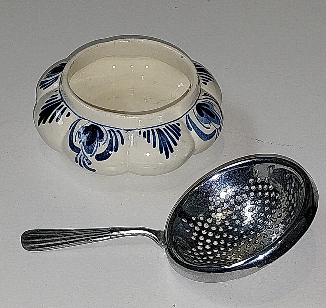 Delfts blauw theezeefje met porseleinen uitlekbakje.