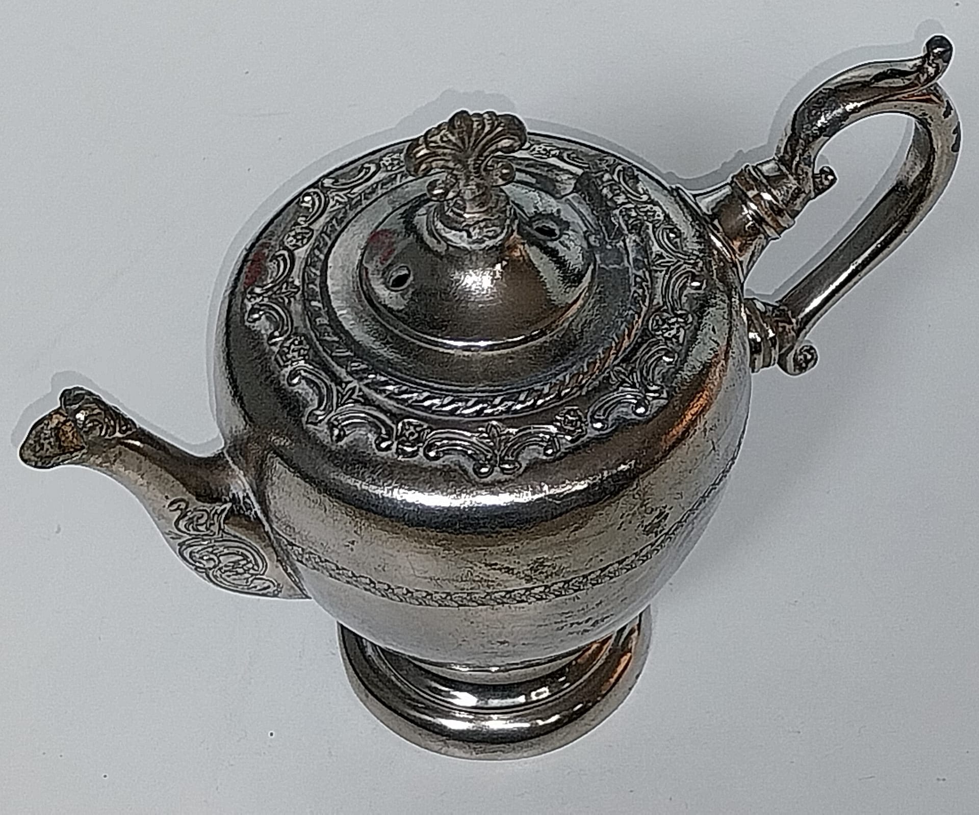 Edeltin/Zilvertin theepot met rijke versiering, jaren ’30