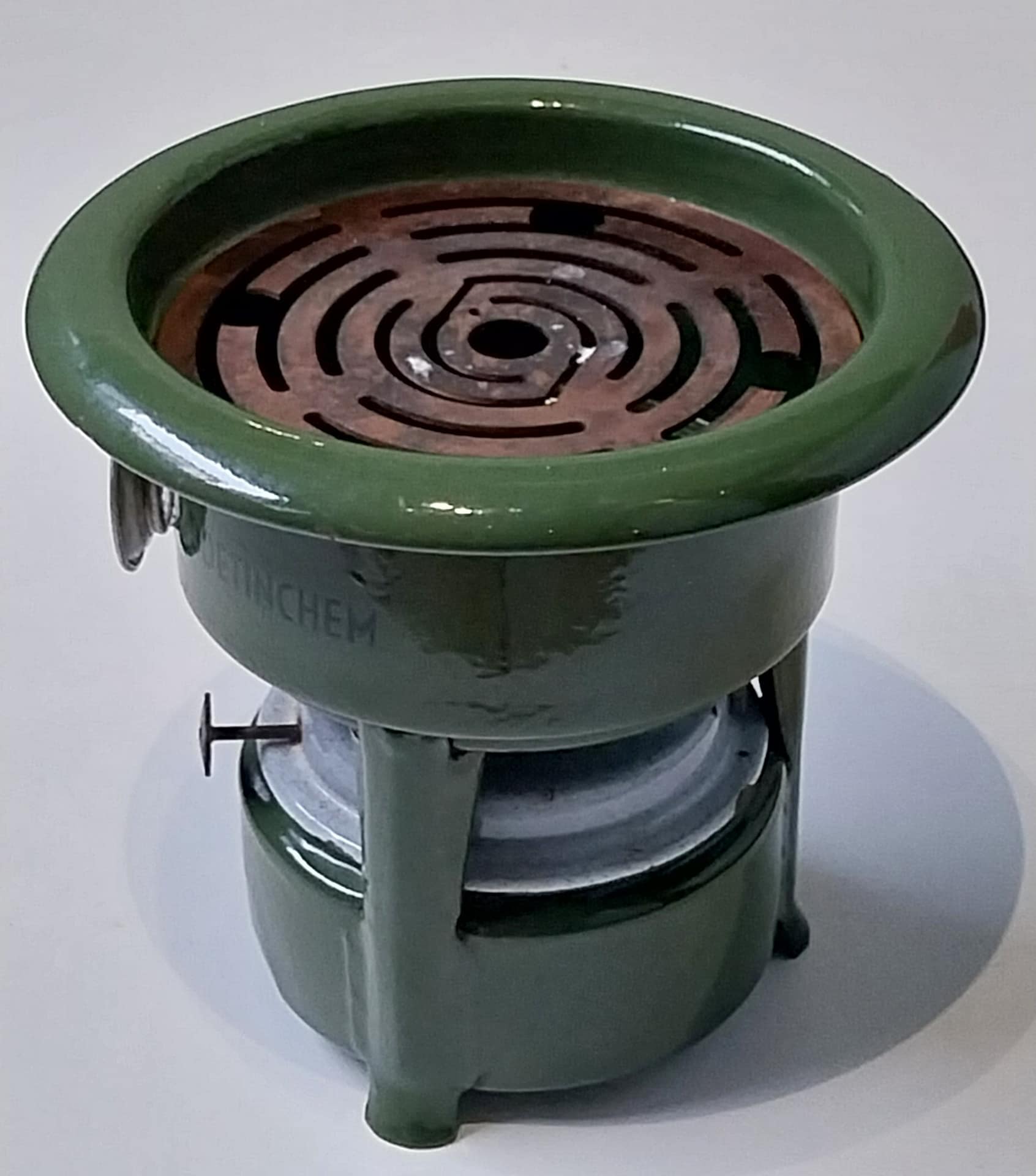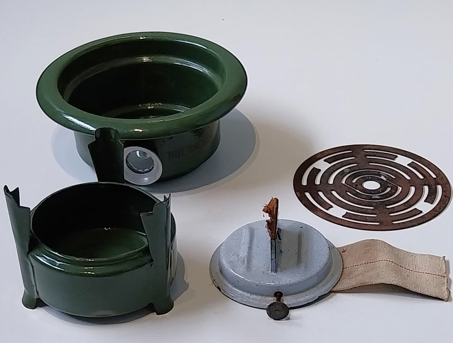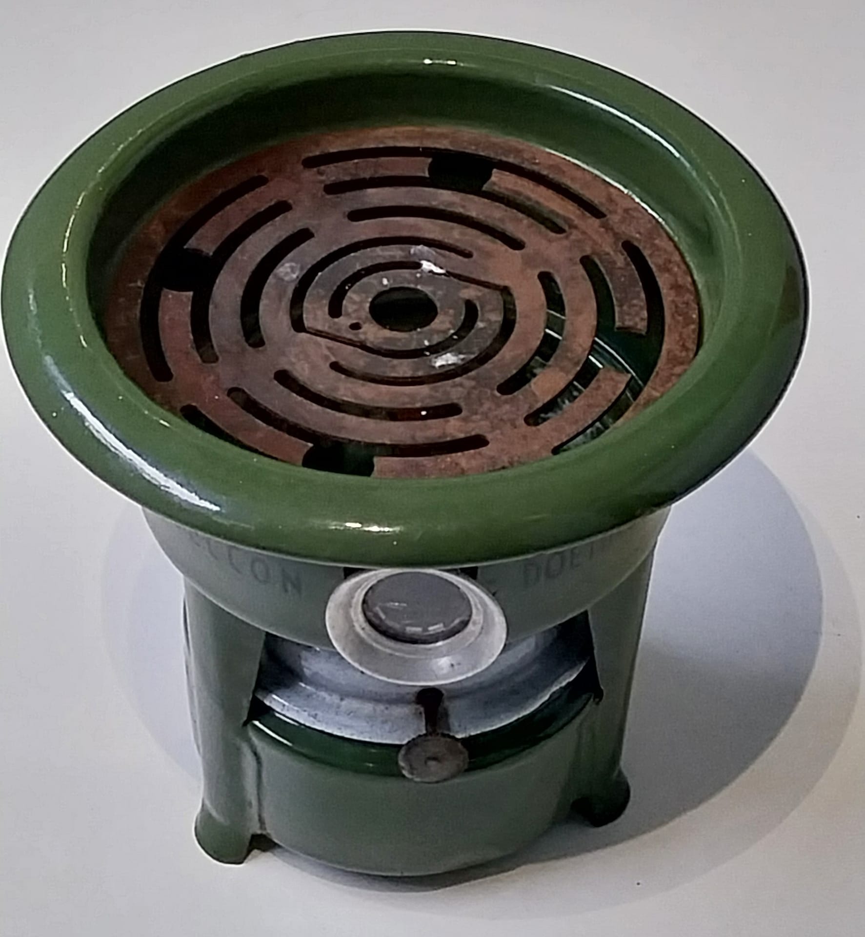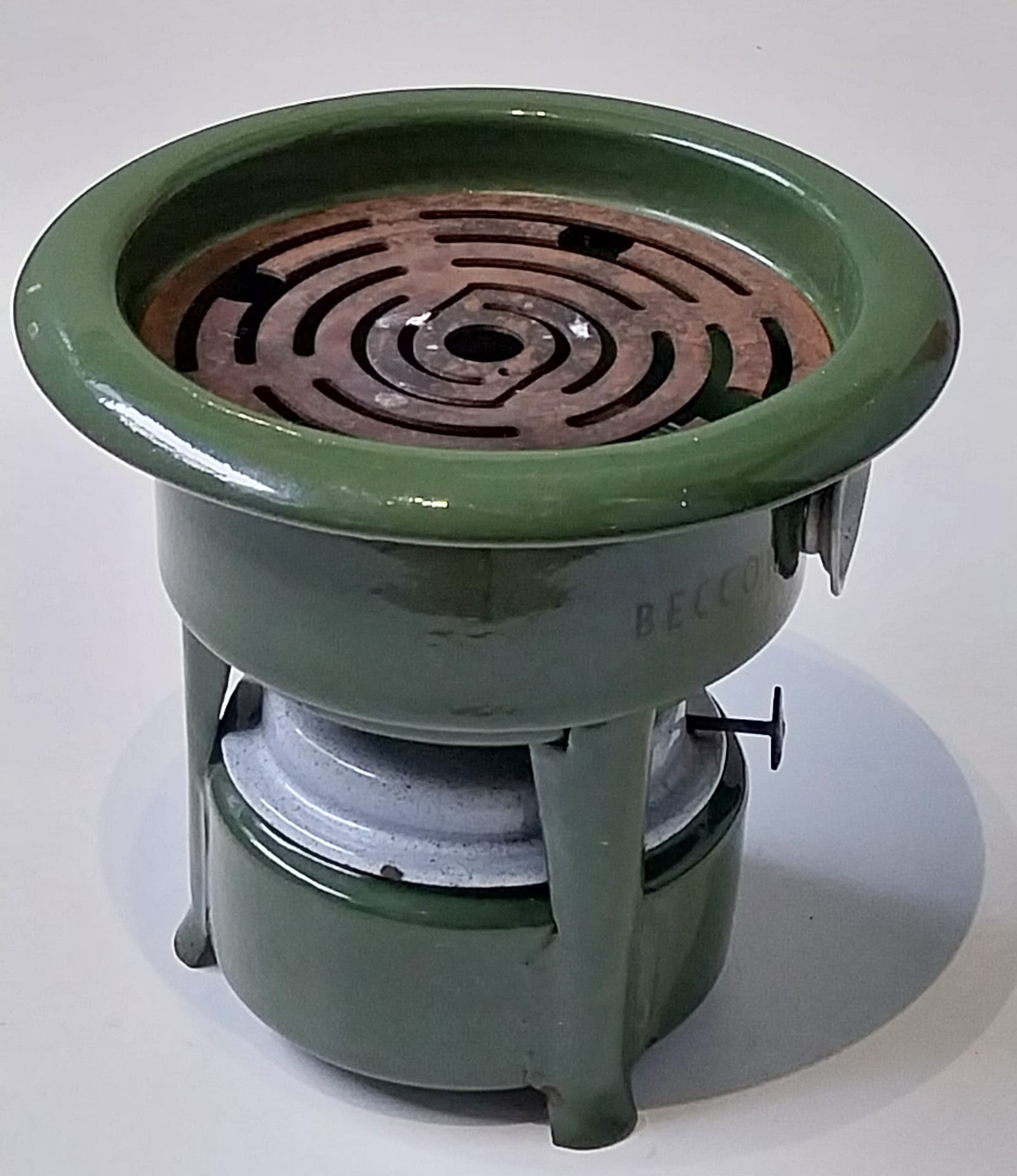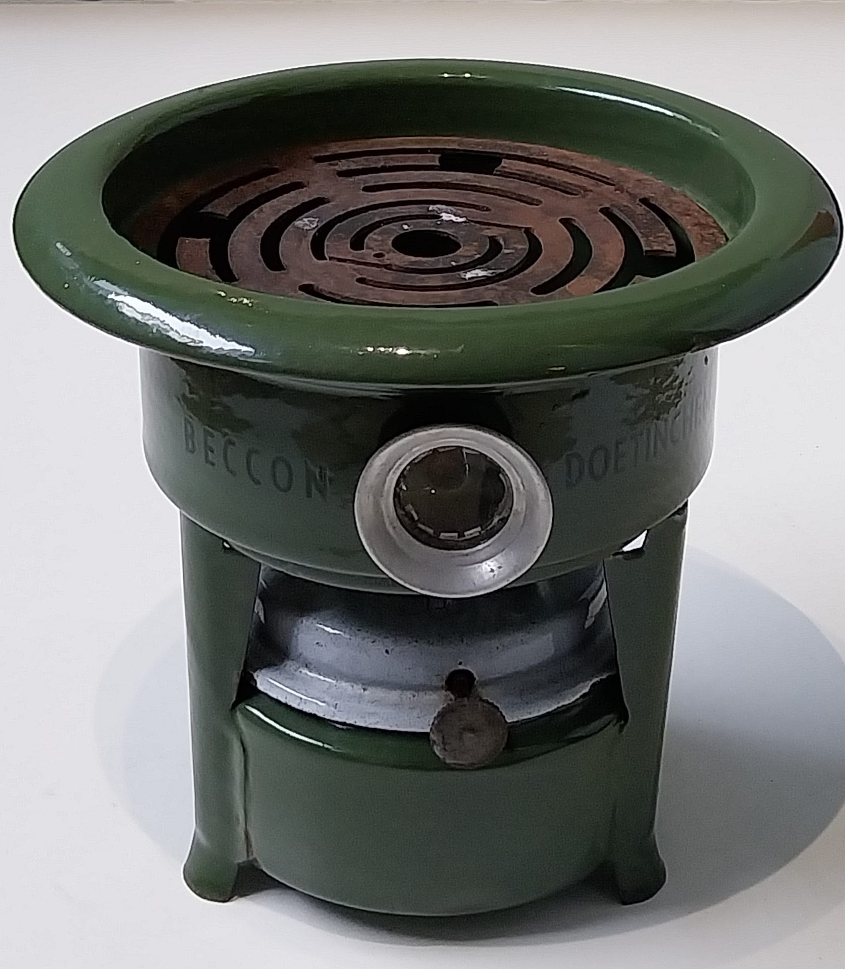 • Donkergroen petroleumstel van Beccon uit Doetinchem met lont. Dateert uit de jaren 50 en verkeert in goede staat.