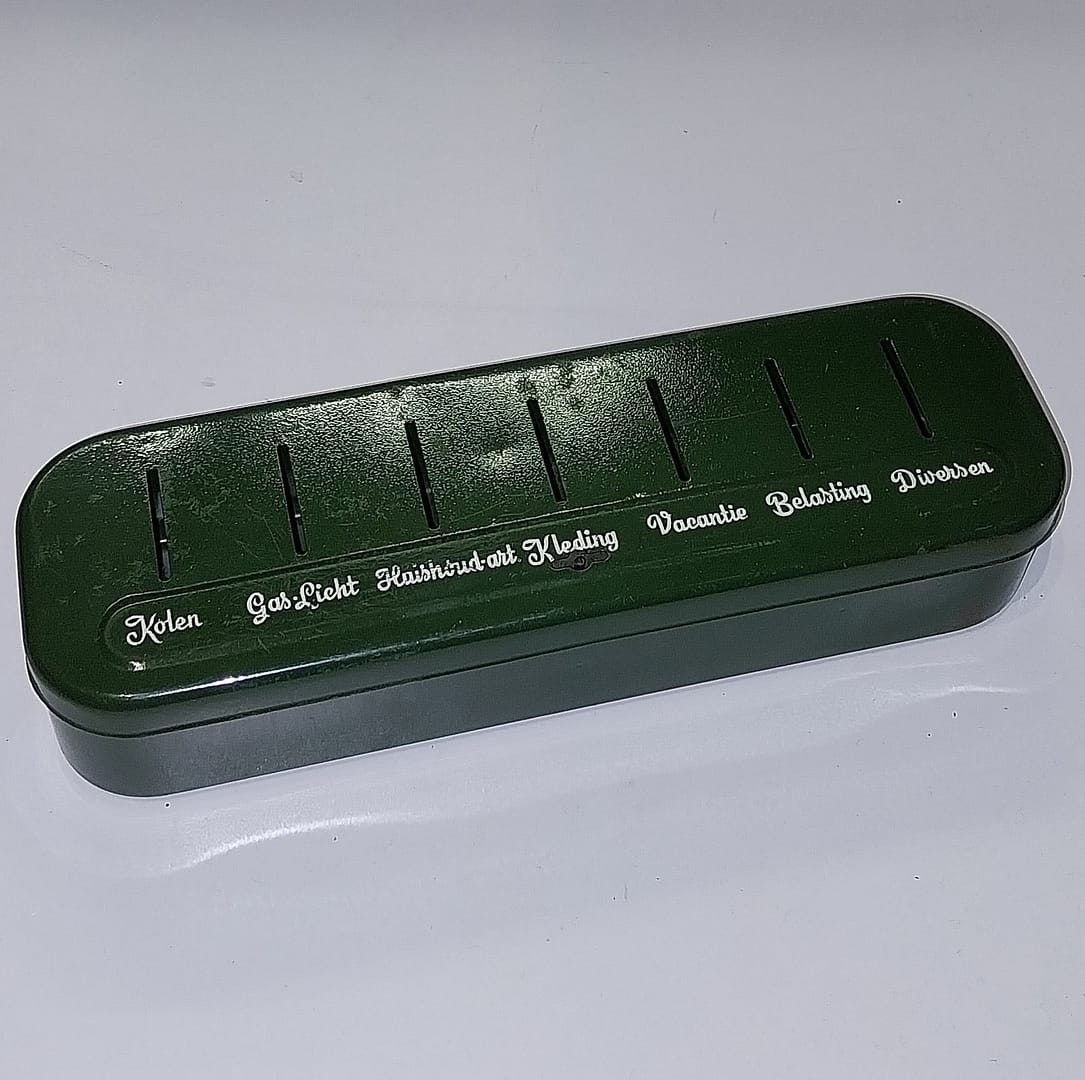 - De spaarpot heeft een emaille groenleurige afwerking endateert uit de jaren ’50.