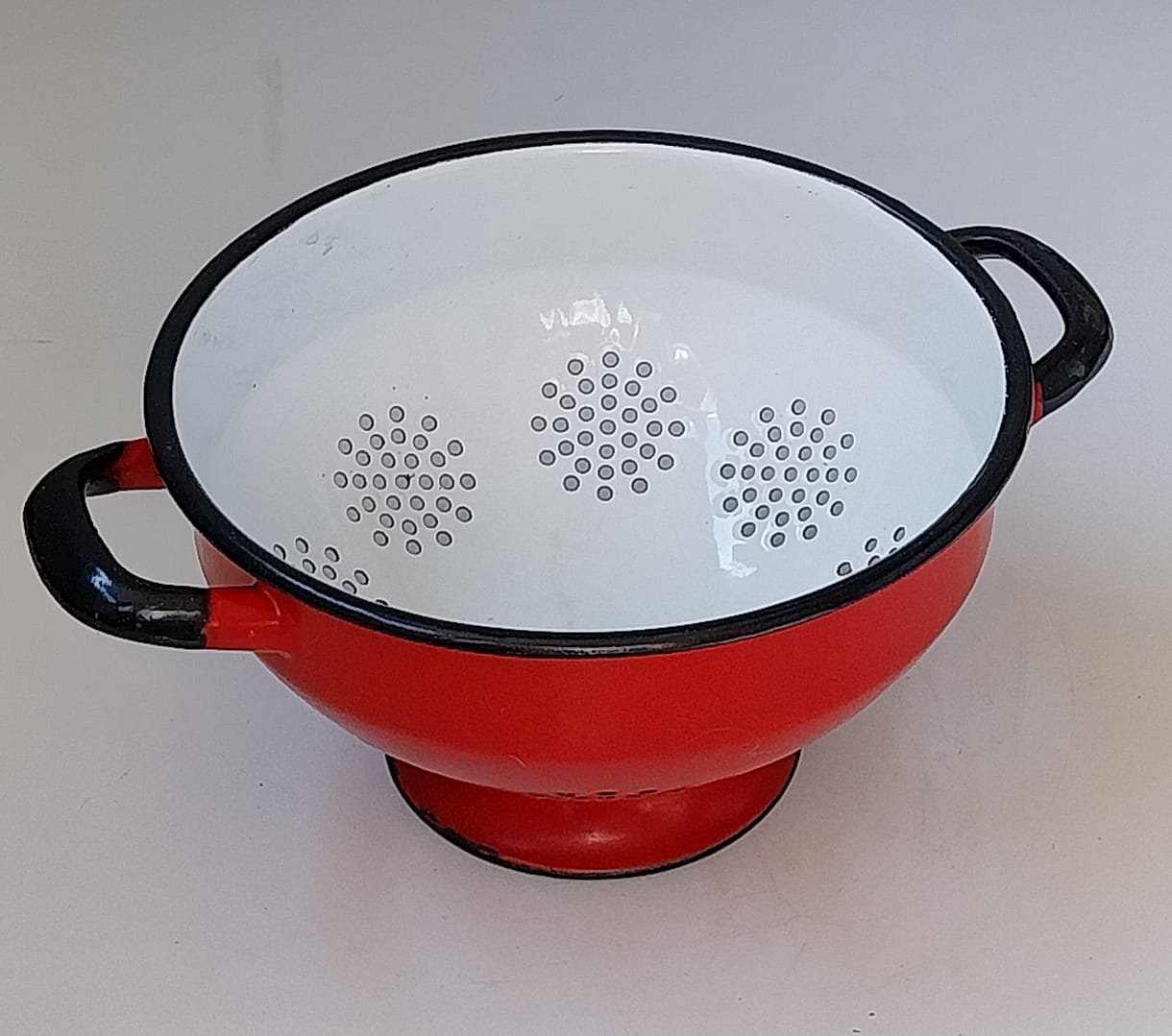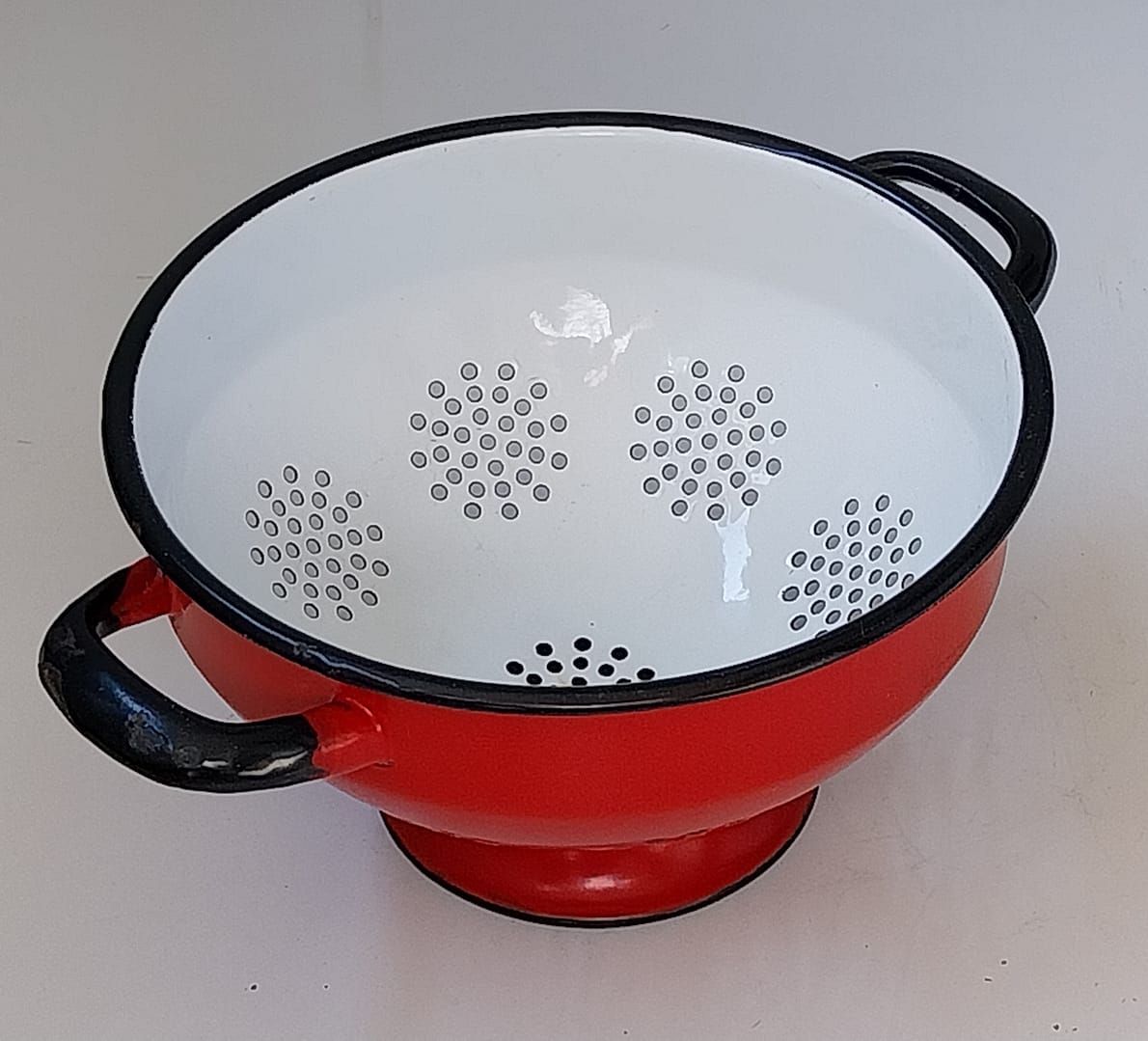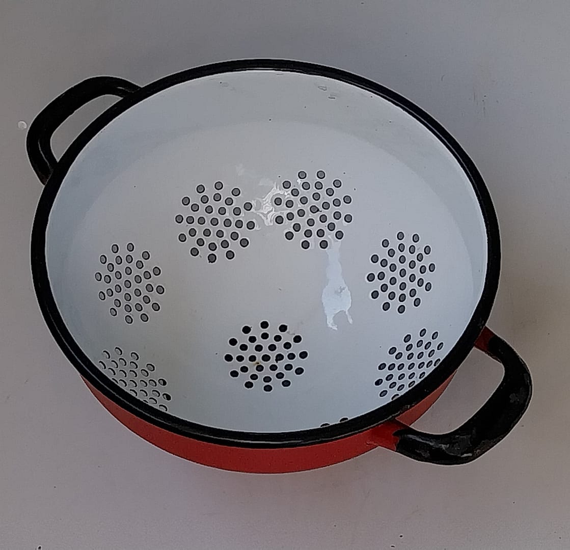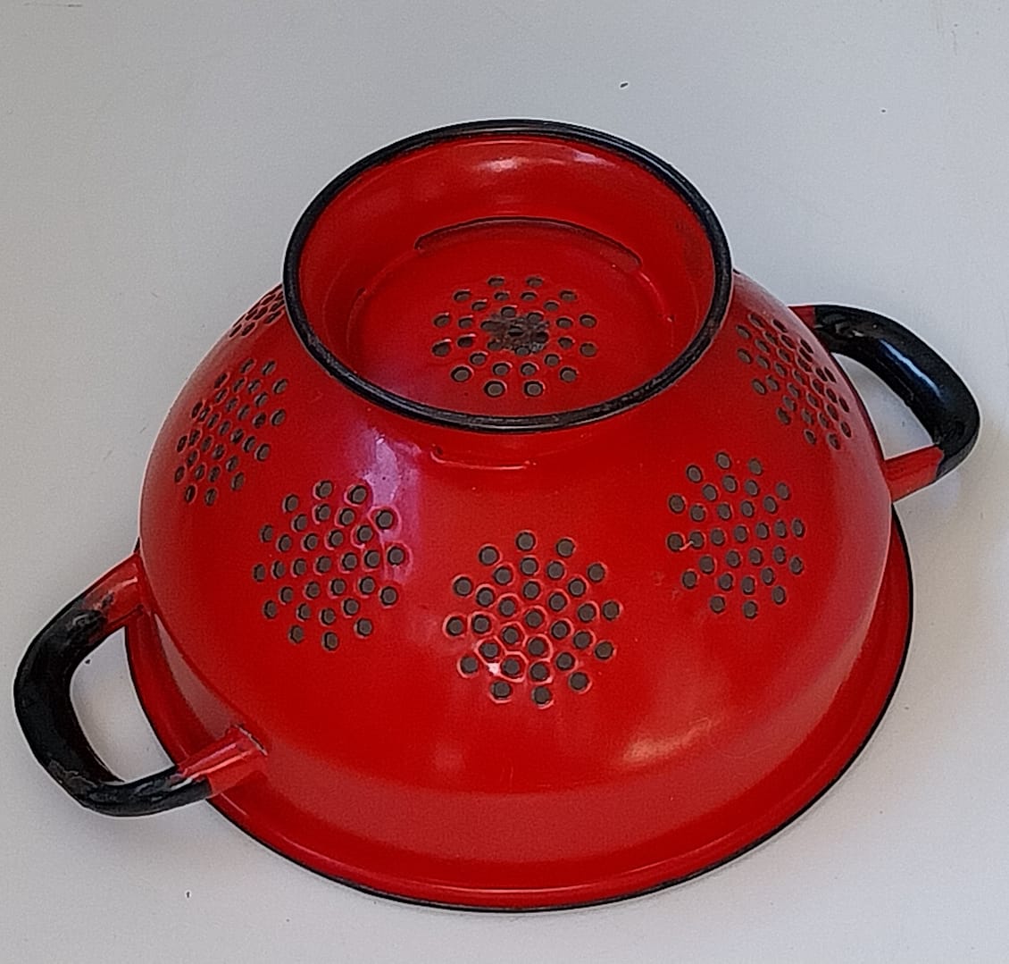 - Voeg een vleugje nostalgie toe aan je keuken met deze prachtige vintage rode emaille vergiet, zwarte rand, en dateert uit de jaren ’60. Met zijn tijdloze design en stevige handgrepen is het niet alleen een functioneel hulpmiddel, maar ook een decoratieve eyecatcher. Is helemaal puntgaaf