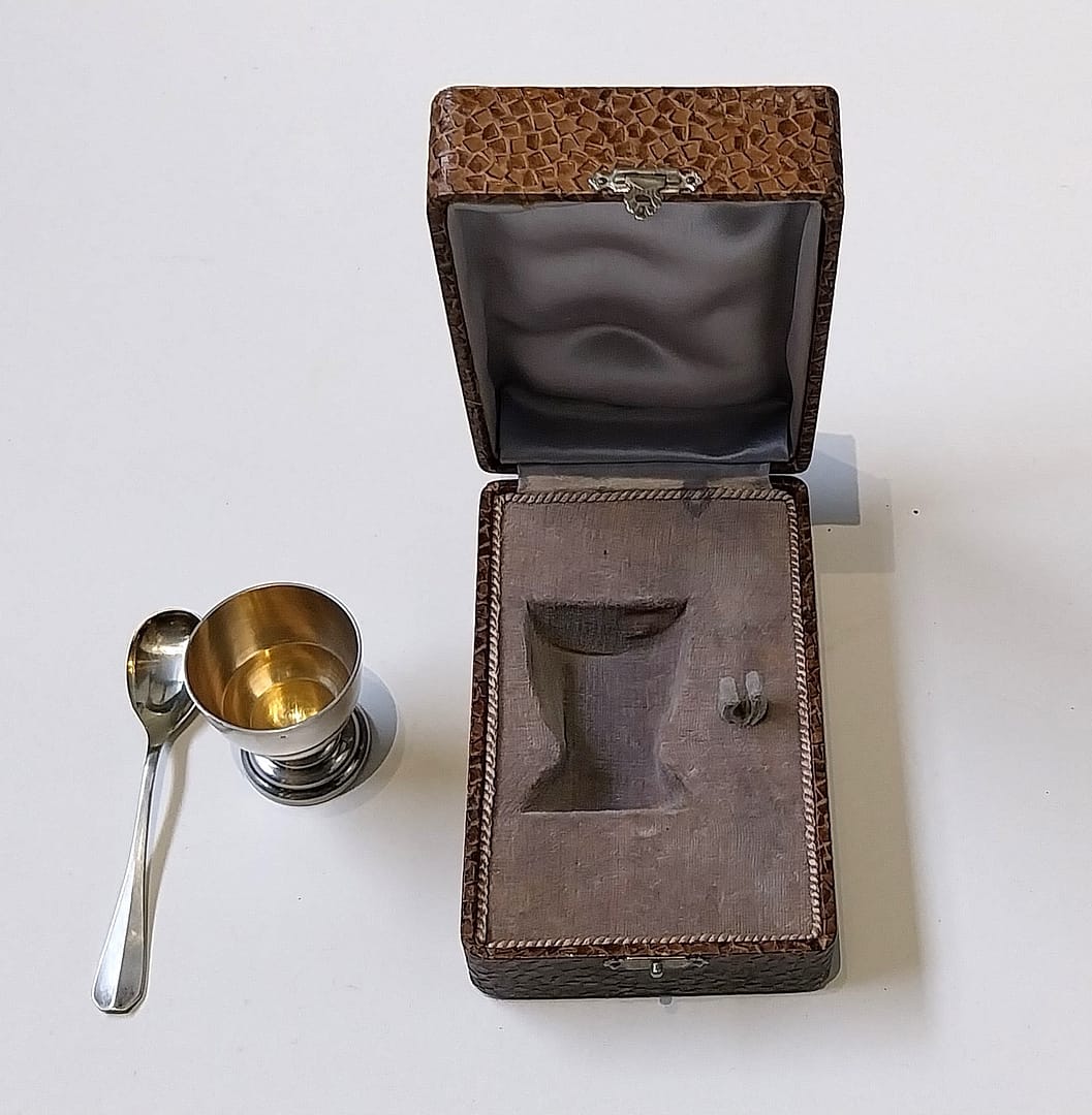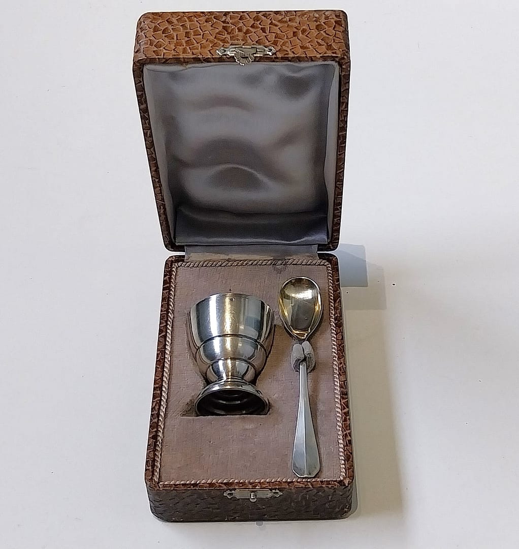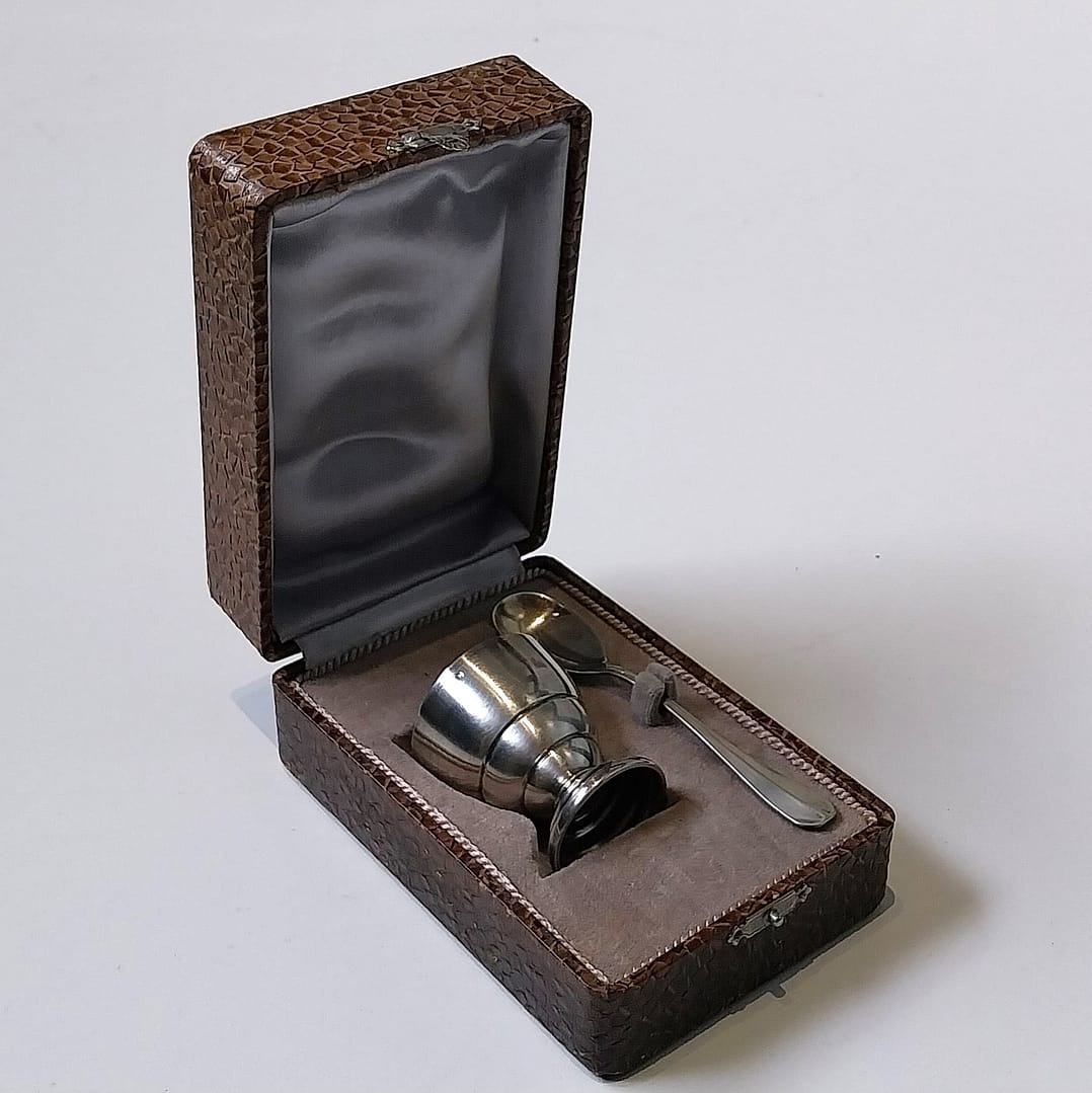 - Set met zilver eierdopje en een lepeltje in origineel geschubd doosje. Aan de bovenkant van het eierdopje zit het zilvermerk en in de holte van het lepeltje. Dit set dateert uit de jaren ’30 en komt uit Frankrijk.