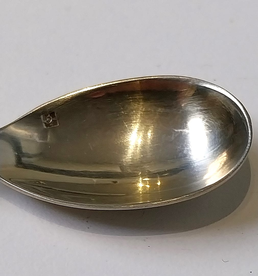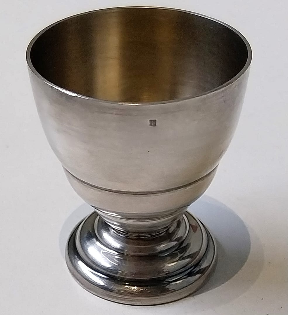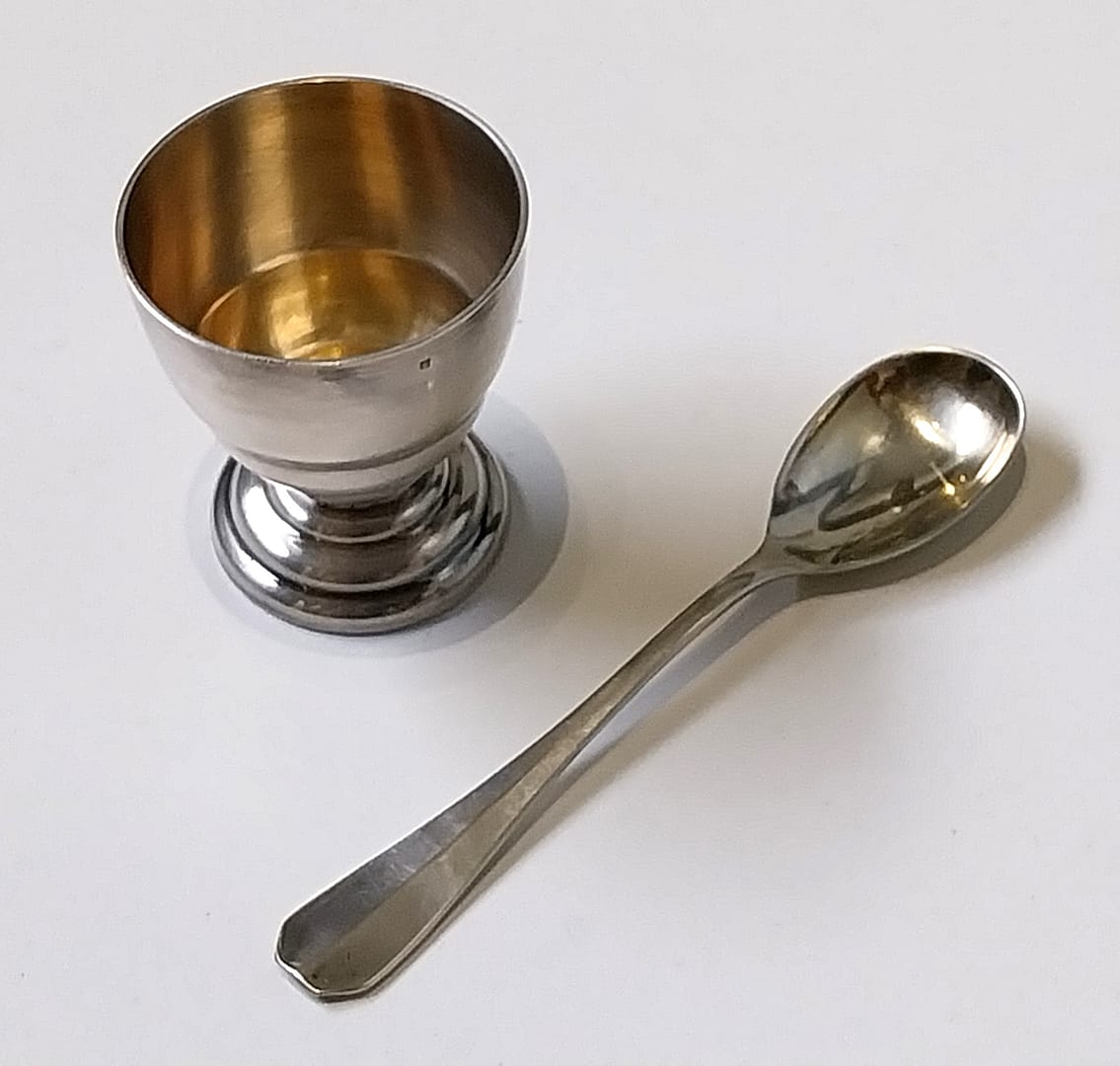 - Set met zilver eierdopje en een lepeltje in origineel geschubd doosje. Aan de bovenkant van het eierdopje zit het zilvermerk en in de holte van het lepeltje. Dit set dateert uit de jaren ’30 en komt uit Frankrijk.