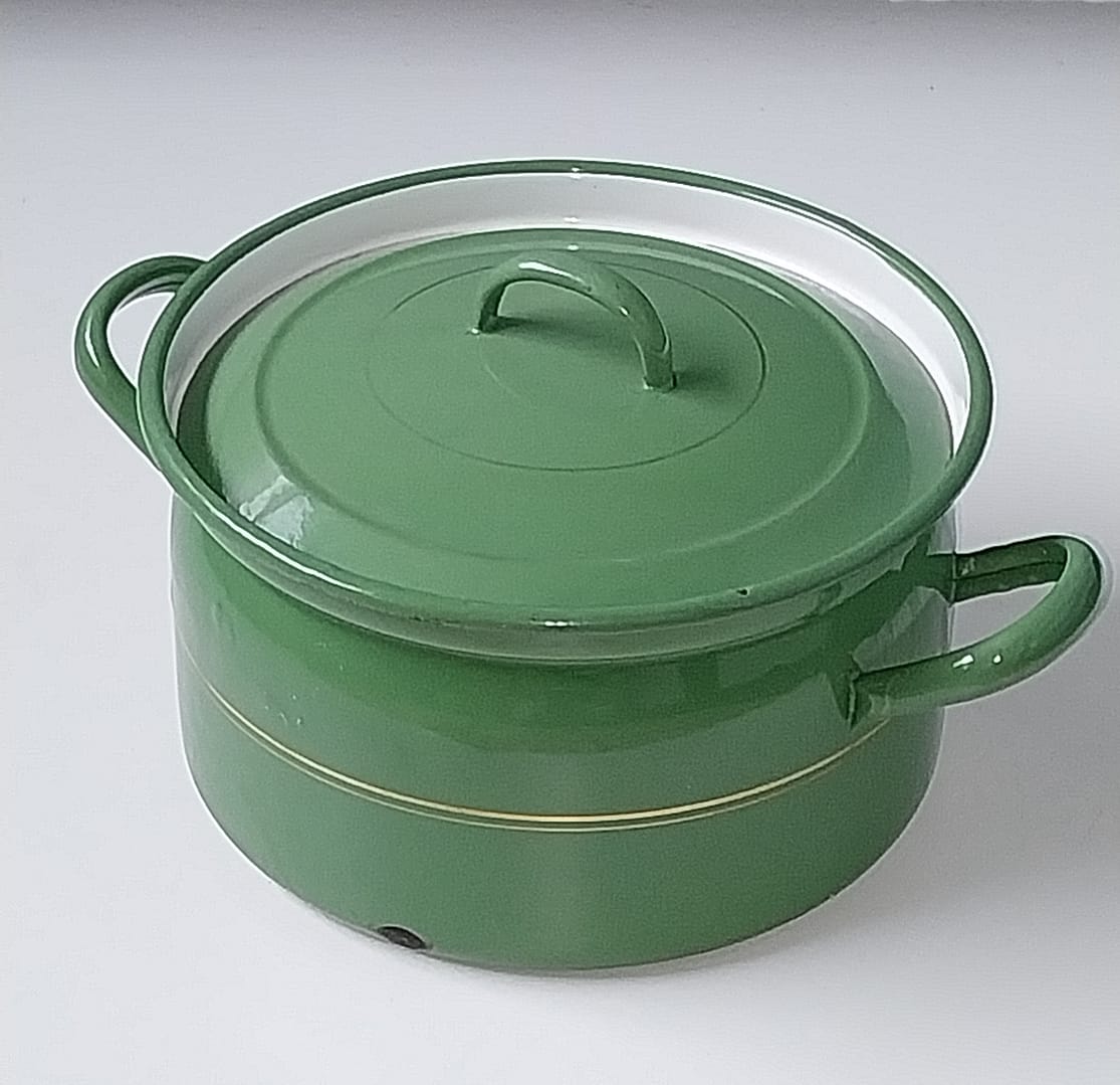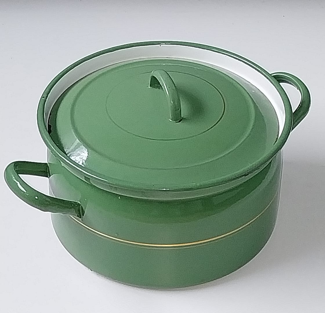 • Prachtige vintage geëmailleerde resedagroene pan versiert met goudkleurige bies en dateert uit de jaren ’60 en verkeert in goede staat.