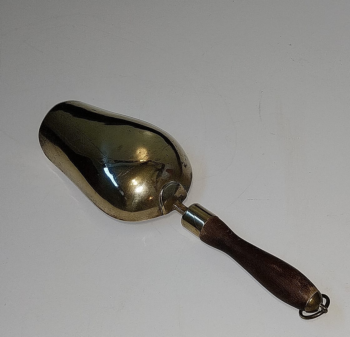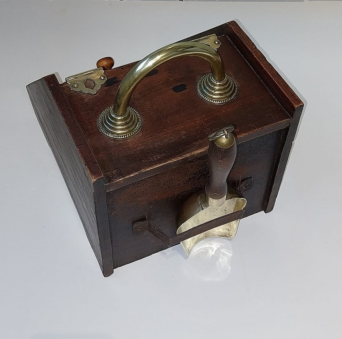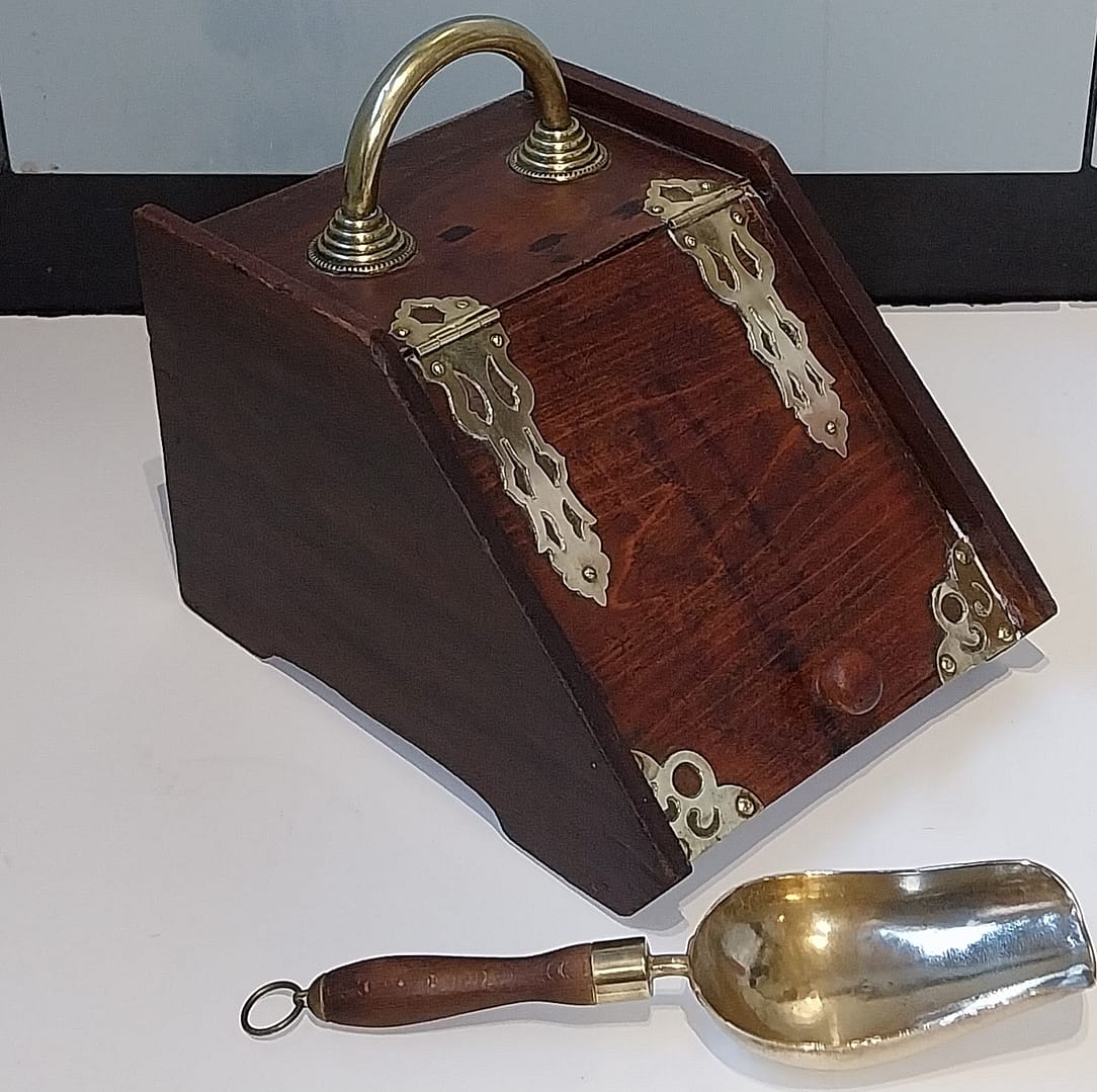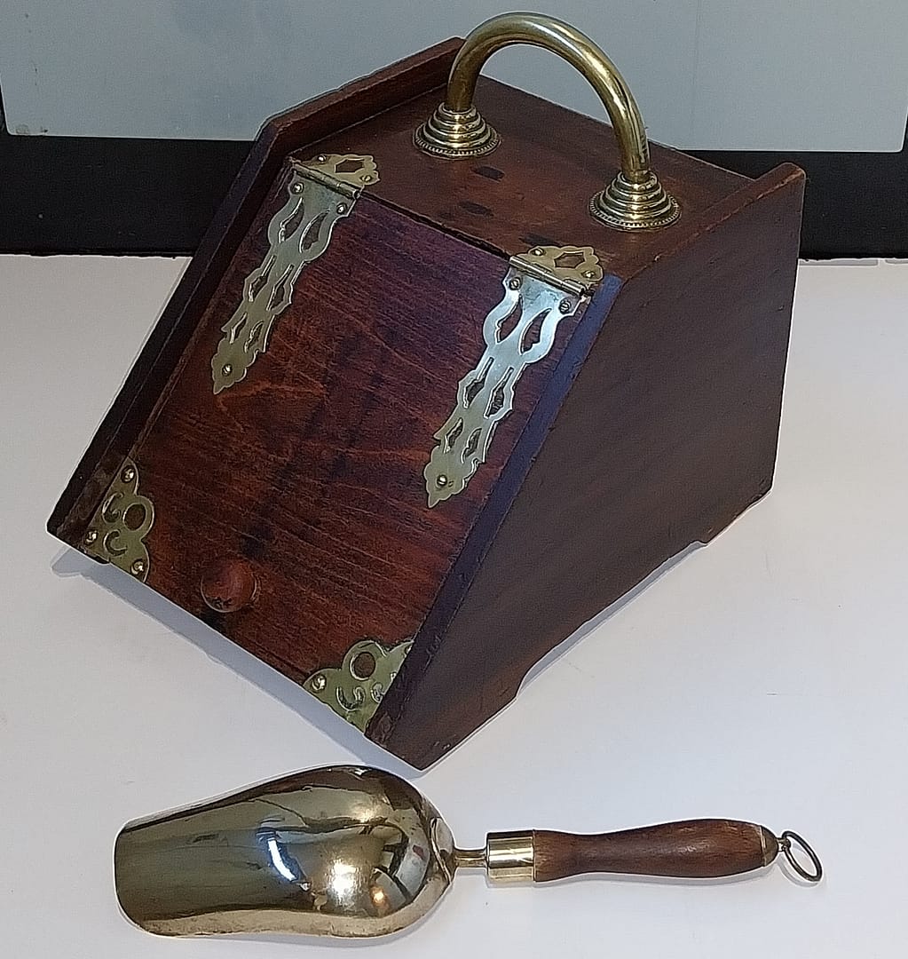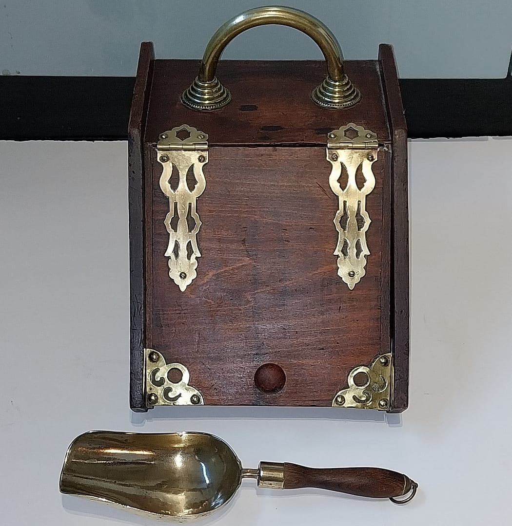 - Houten kolenbak met uitneembare metalen binnenbak, kolenschephouder aan de achterkant en messing schep. De kolenkit heeft een messing hangreep en messing beslag.