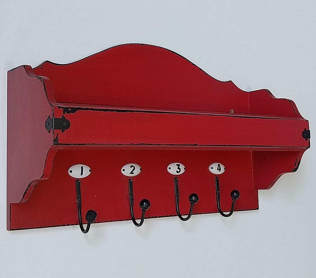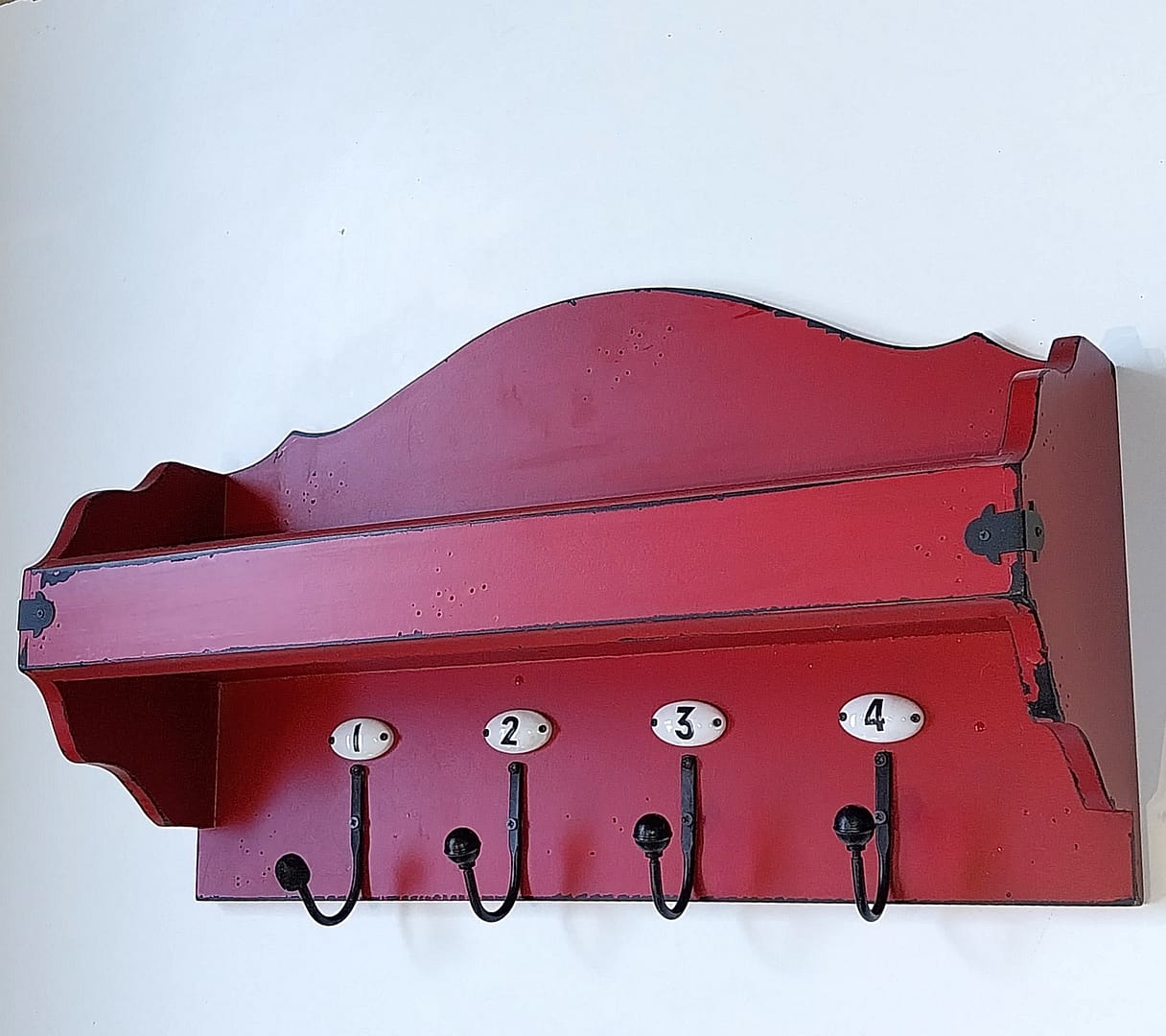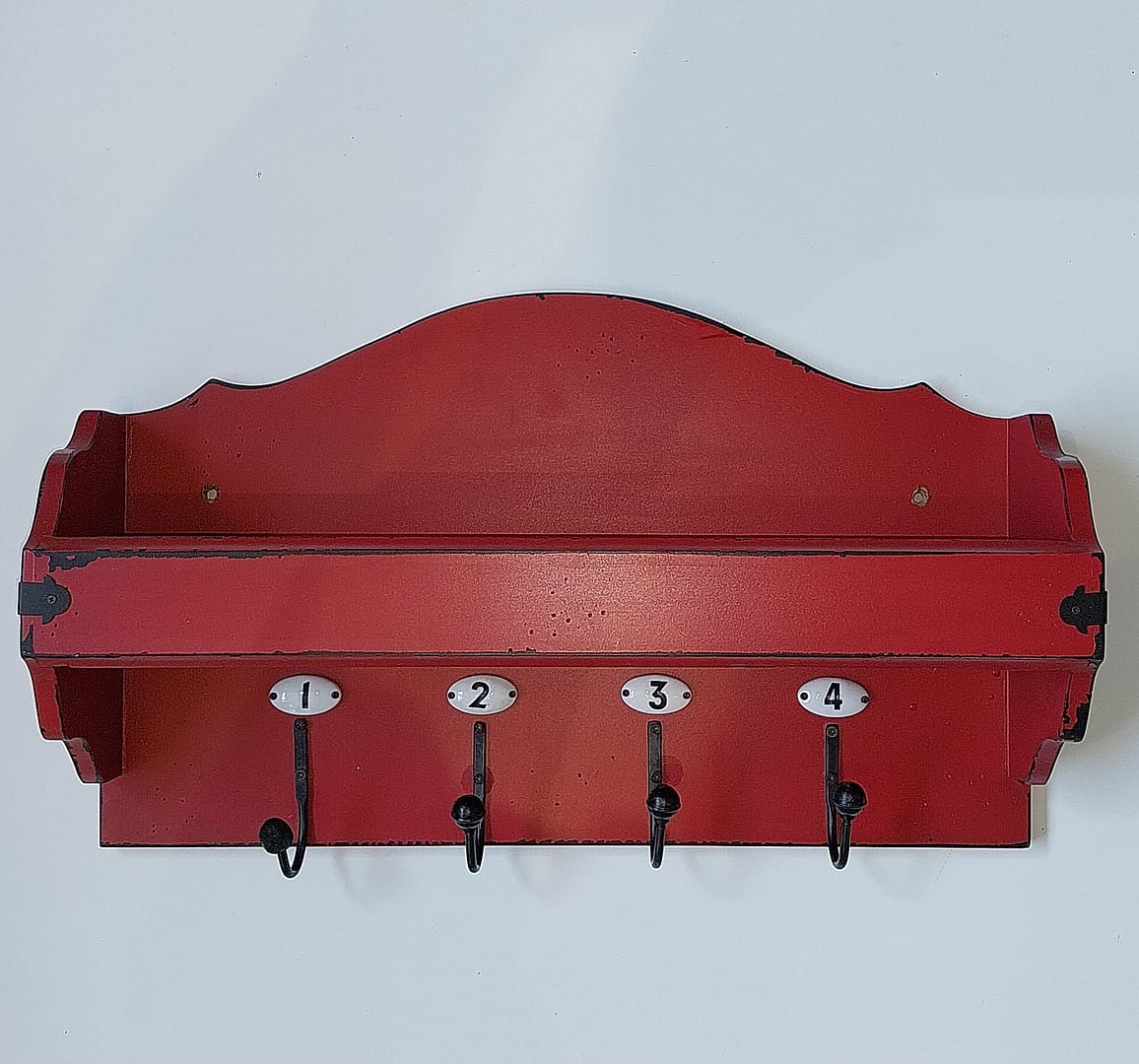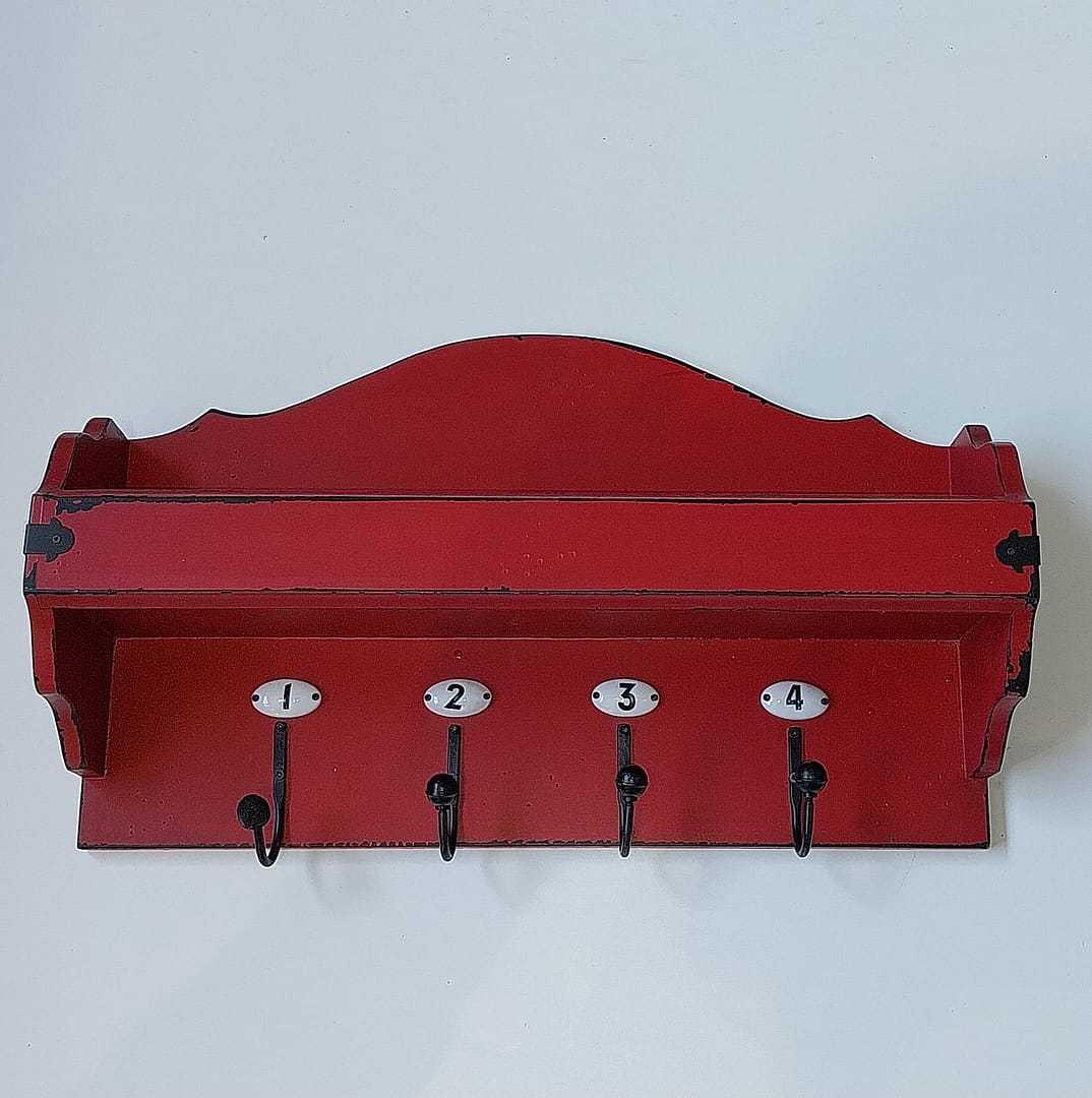 • Houten landelijke wandkapstok met een handige displayplank en vier genummerde metalen haken.
