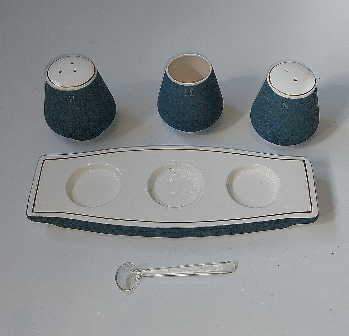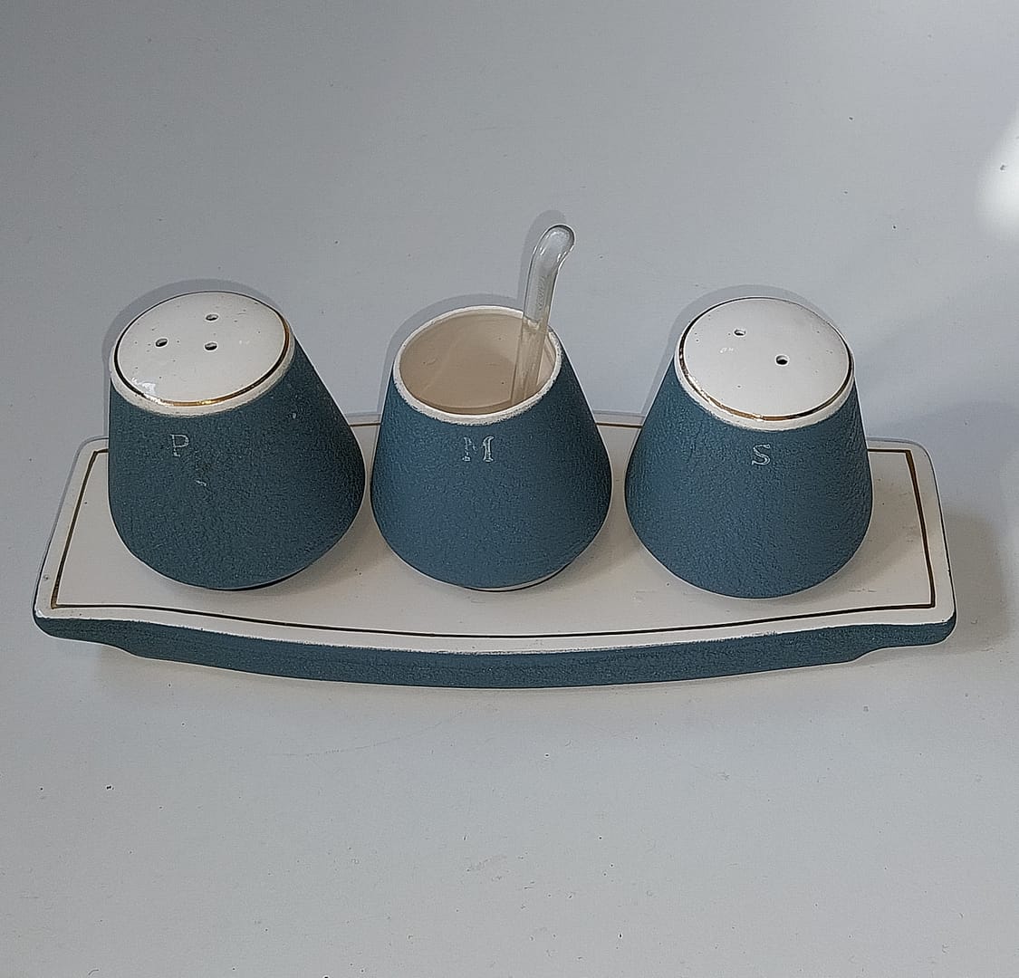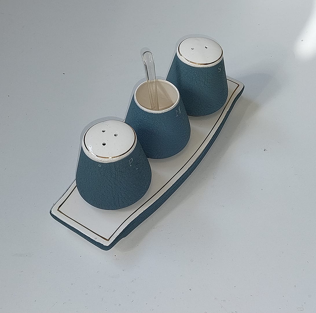Keramisch peper- en zoutstel met een mosterdpotje op een bijbehorend schaaltje. Het mid-century ontwerp is uitgevoerd in een mat blauw (vaak “Pacific Blue” genoemd) met witte accenten en gouden randjes.